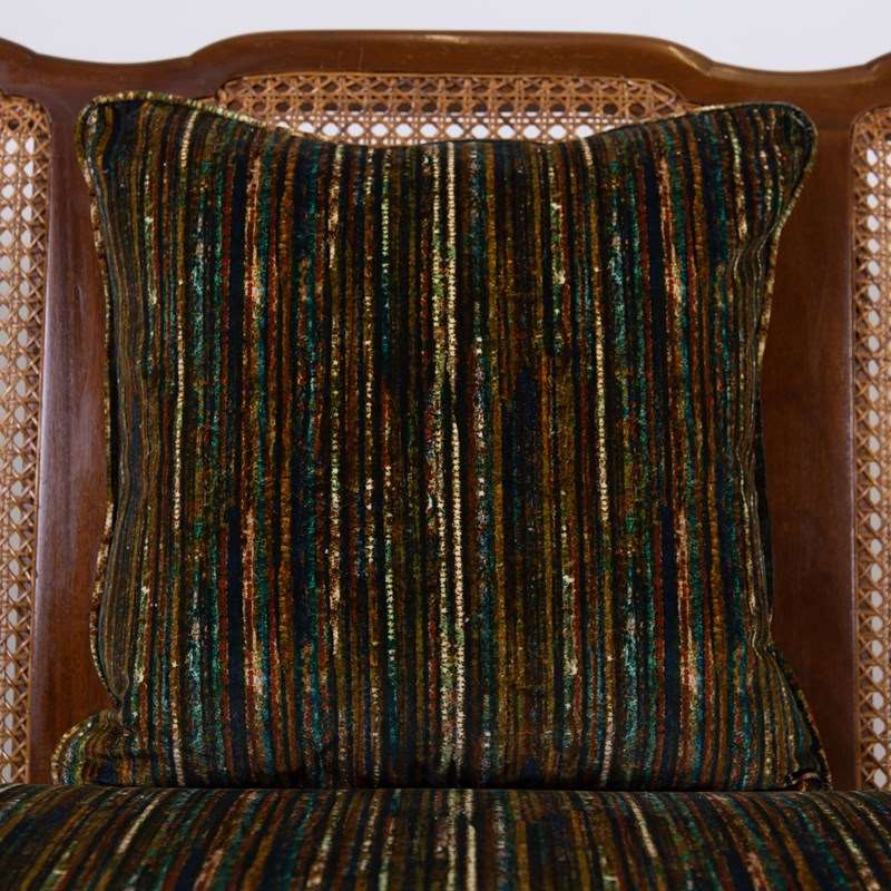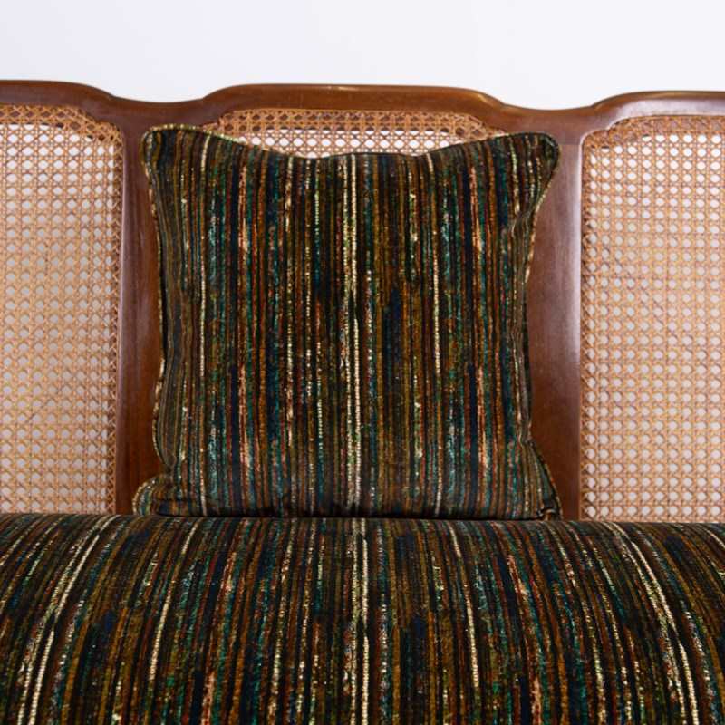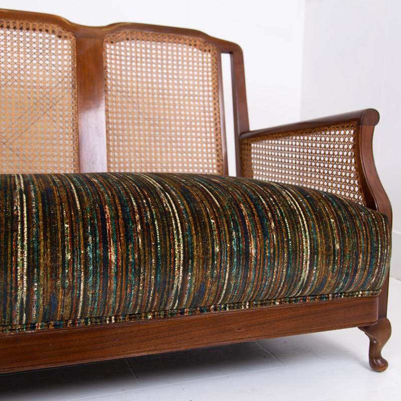 Fresh back from our upholsterer Mark, we have a three seat bergere sofa with new upholstery in a gorgeously soft, high quality, printed stripe velvet fabric with three large matching feather filled cushions, all plump and ready to place.
