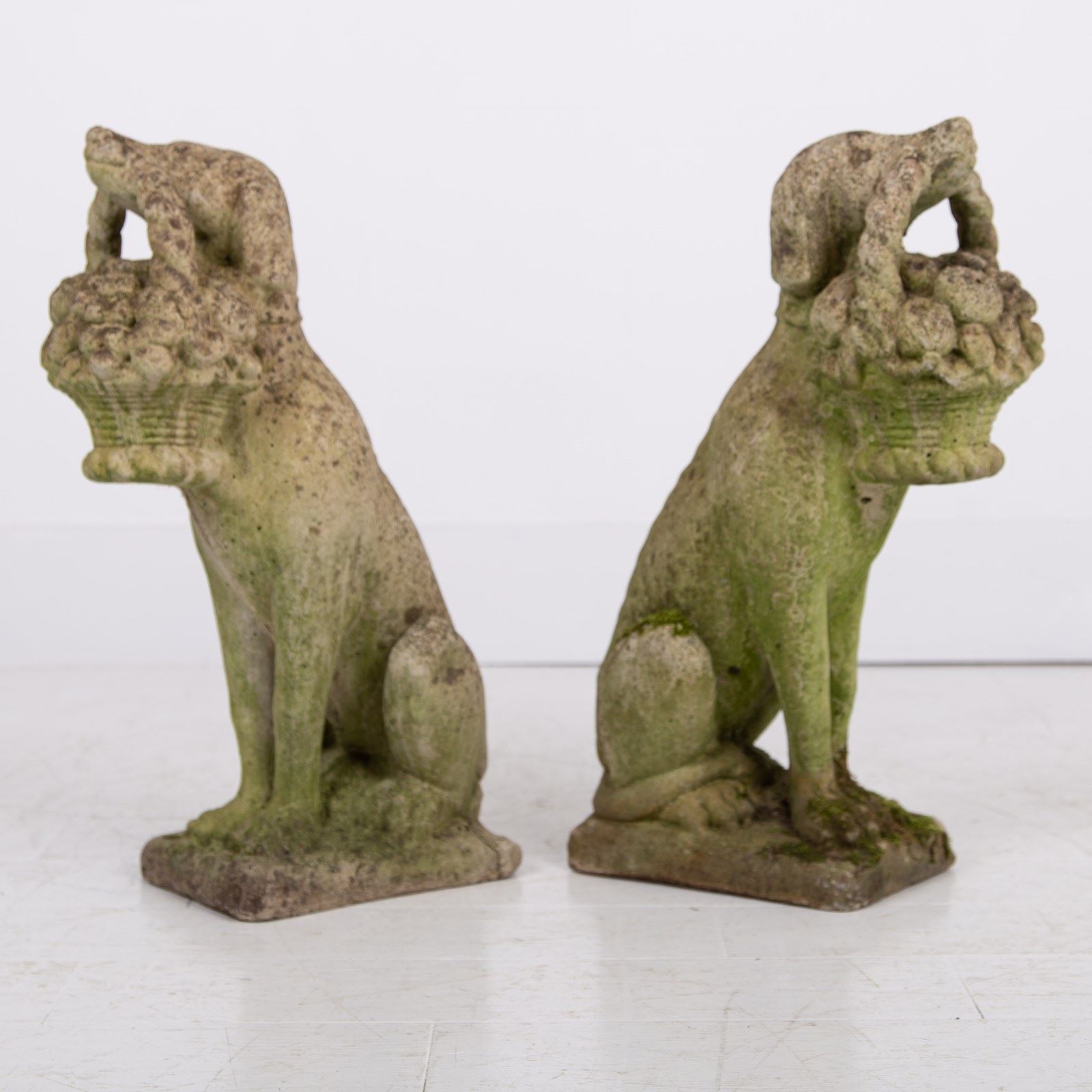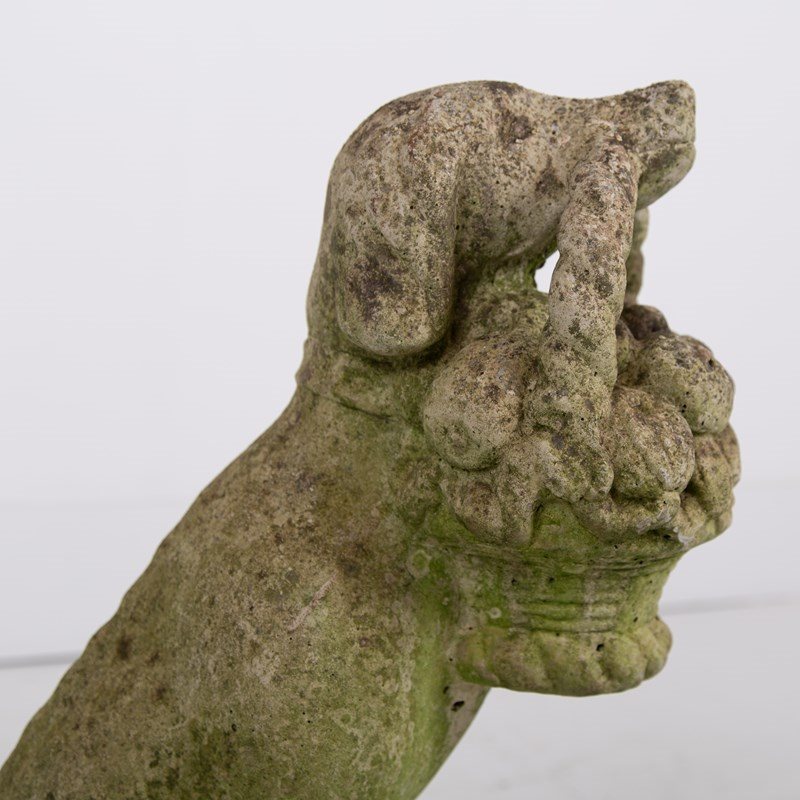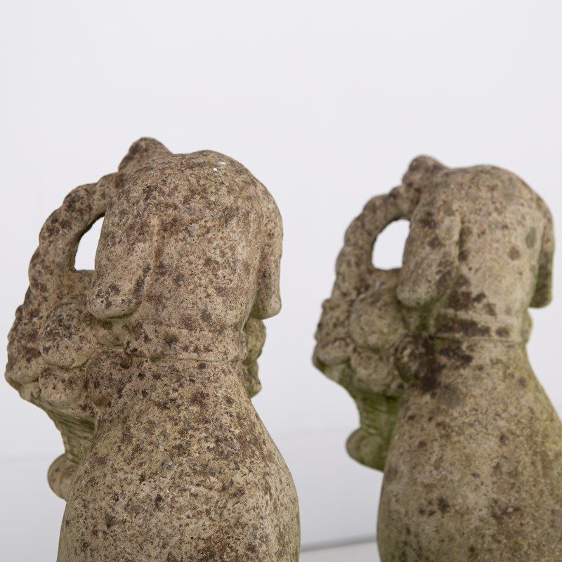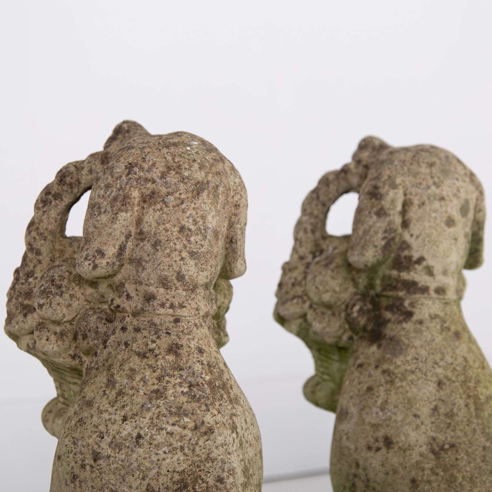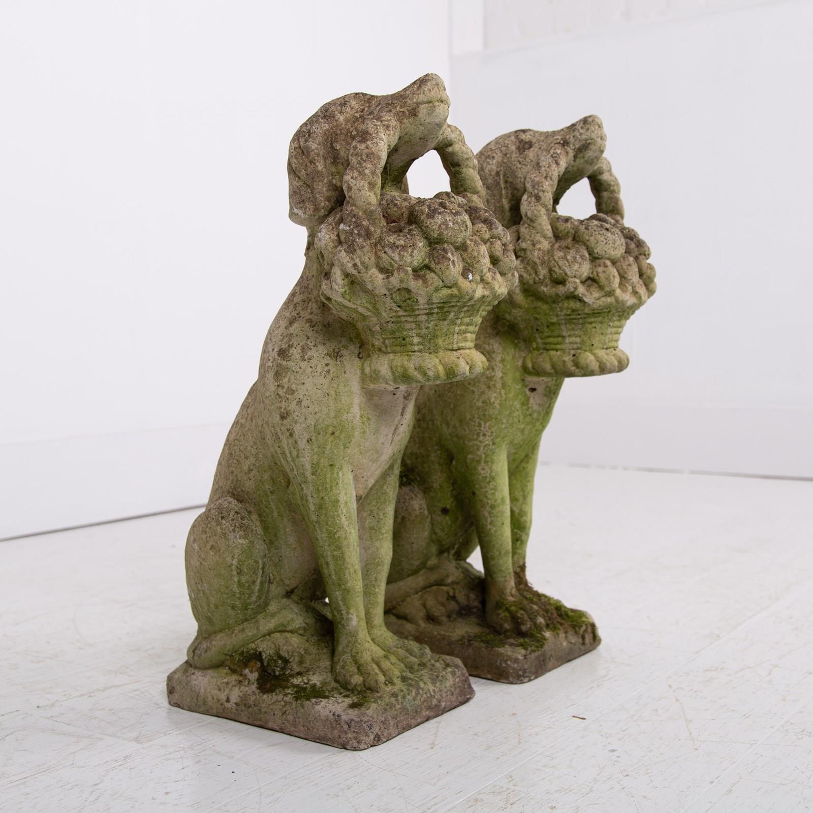 A rather adorable pair of reconstituted stone garden dogs holding a little basket of fruit in their mouths, both nicely aged and weathered, seeking new owners.