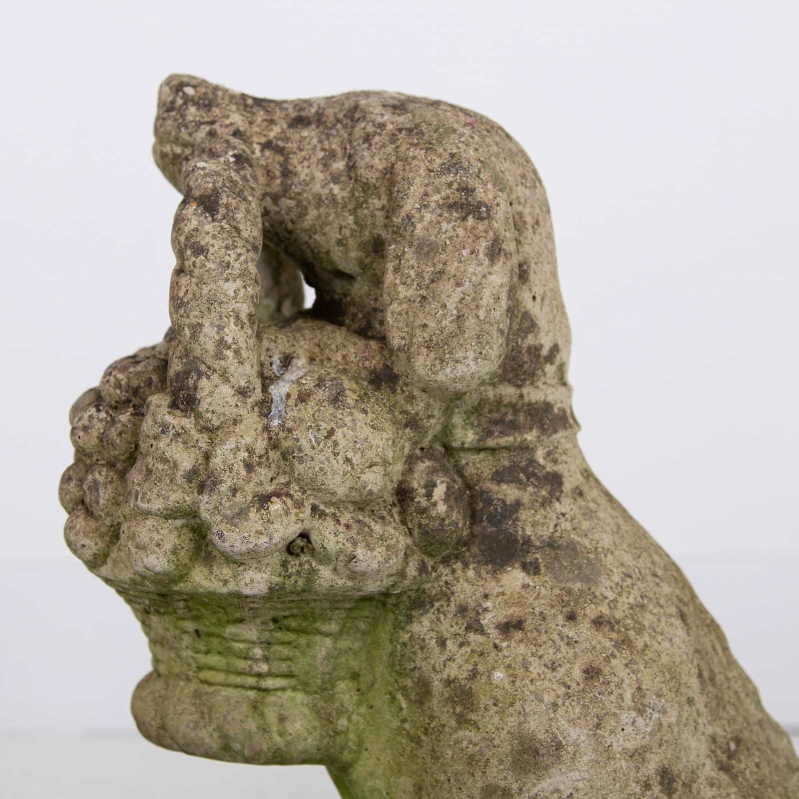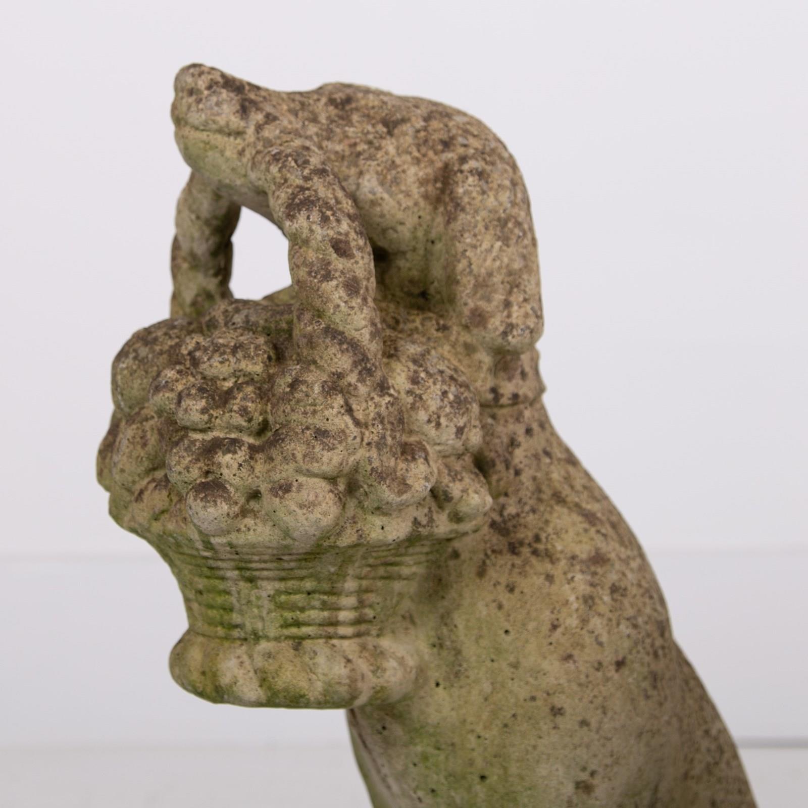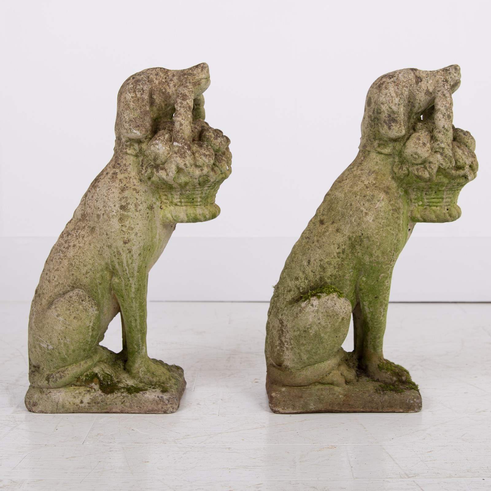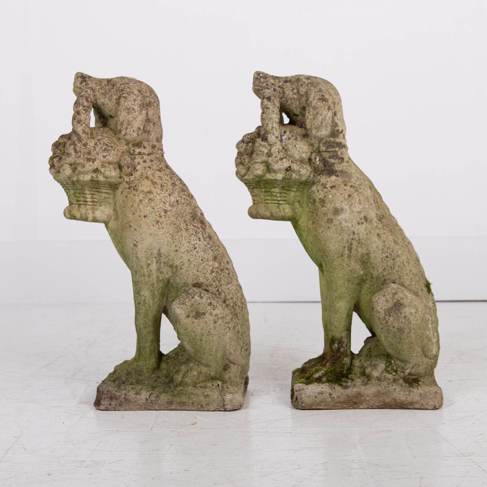 A rather adorable pair of reconstituted stone garden dogs holding a little basket of fruit in their mouths, both nicely aged and weathered, seeking new owners.