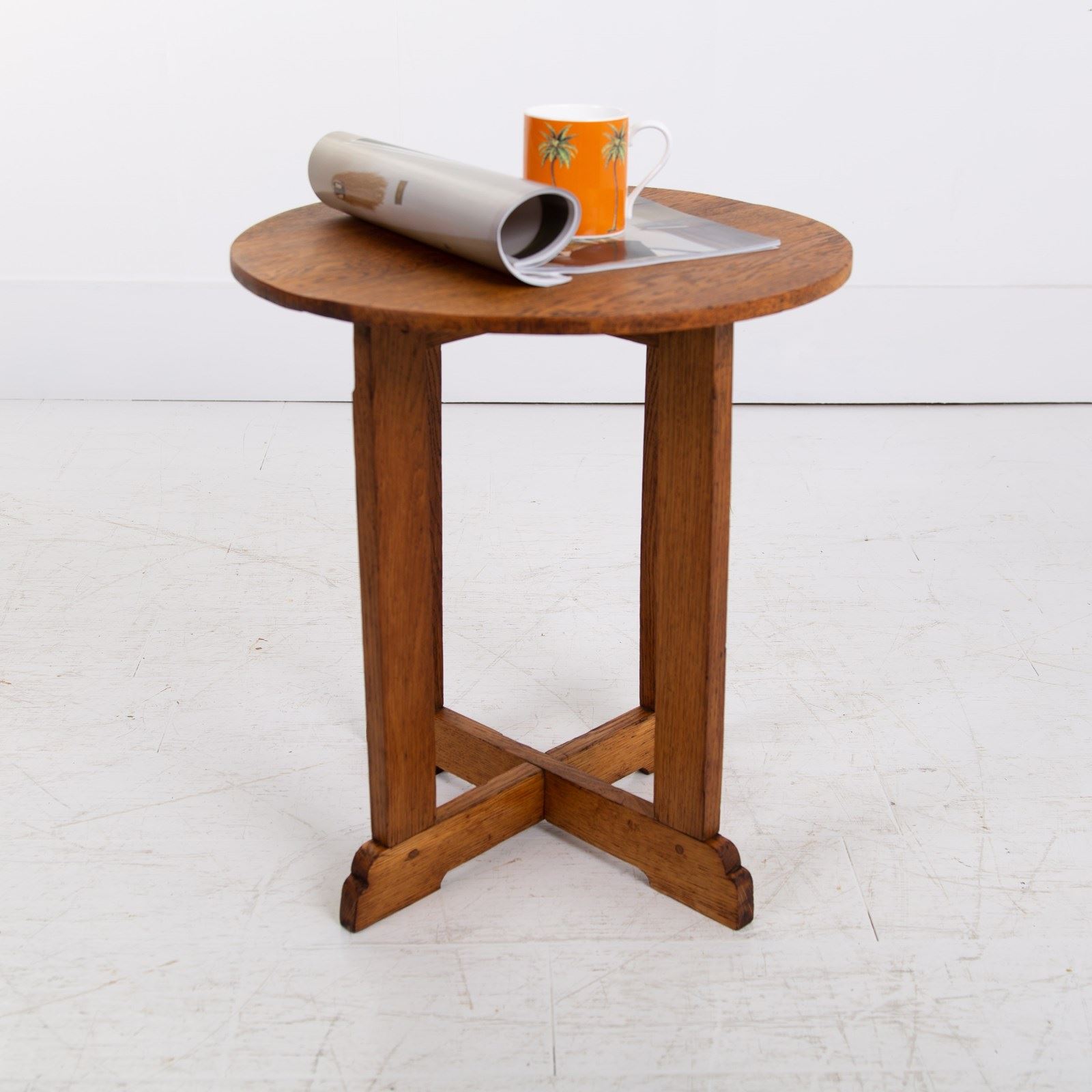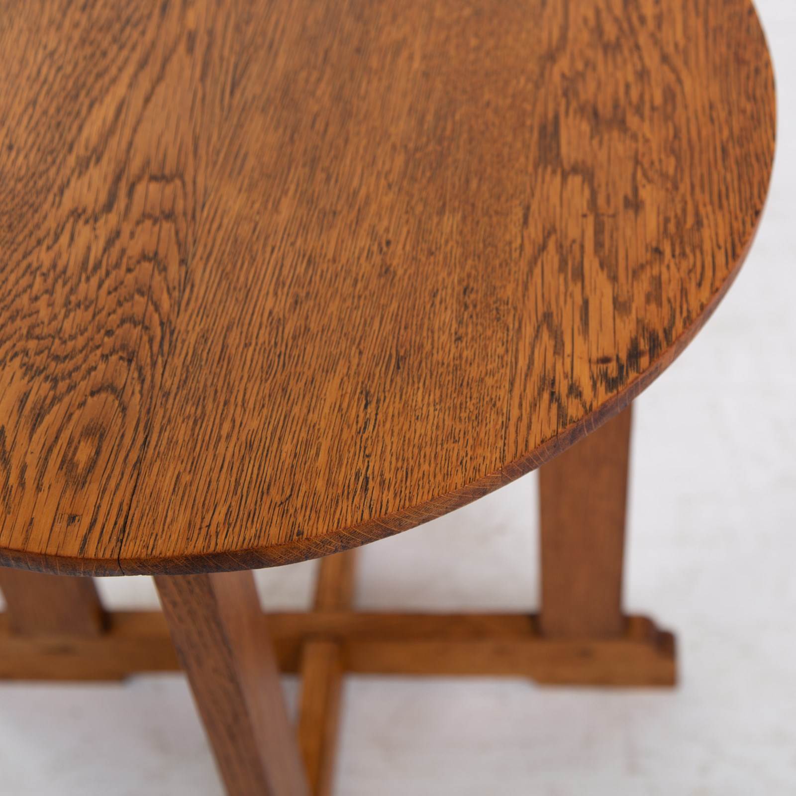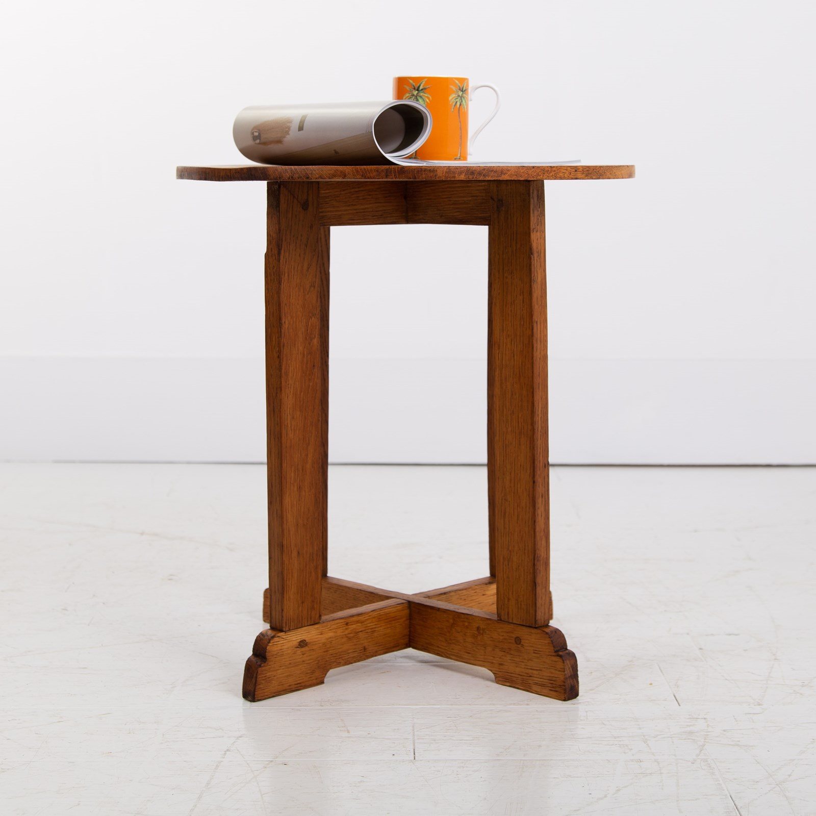 A delightful Cotswold School oak side table with a lean graceful top, cruciform base and lovely shaped ends. This one sits in nice condition with the oak giving off a warm golden glow and sensible aging. Oak dowels and joints on display, it's a well made piece with a little label showing the name Turnbull - maybe the maker or intended owner.