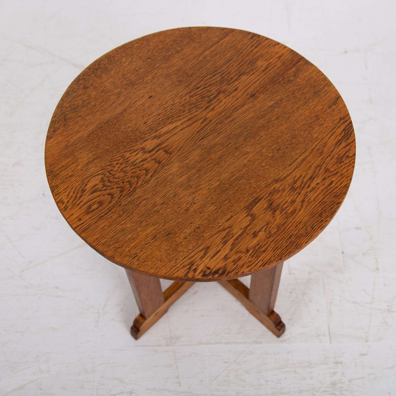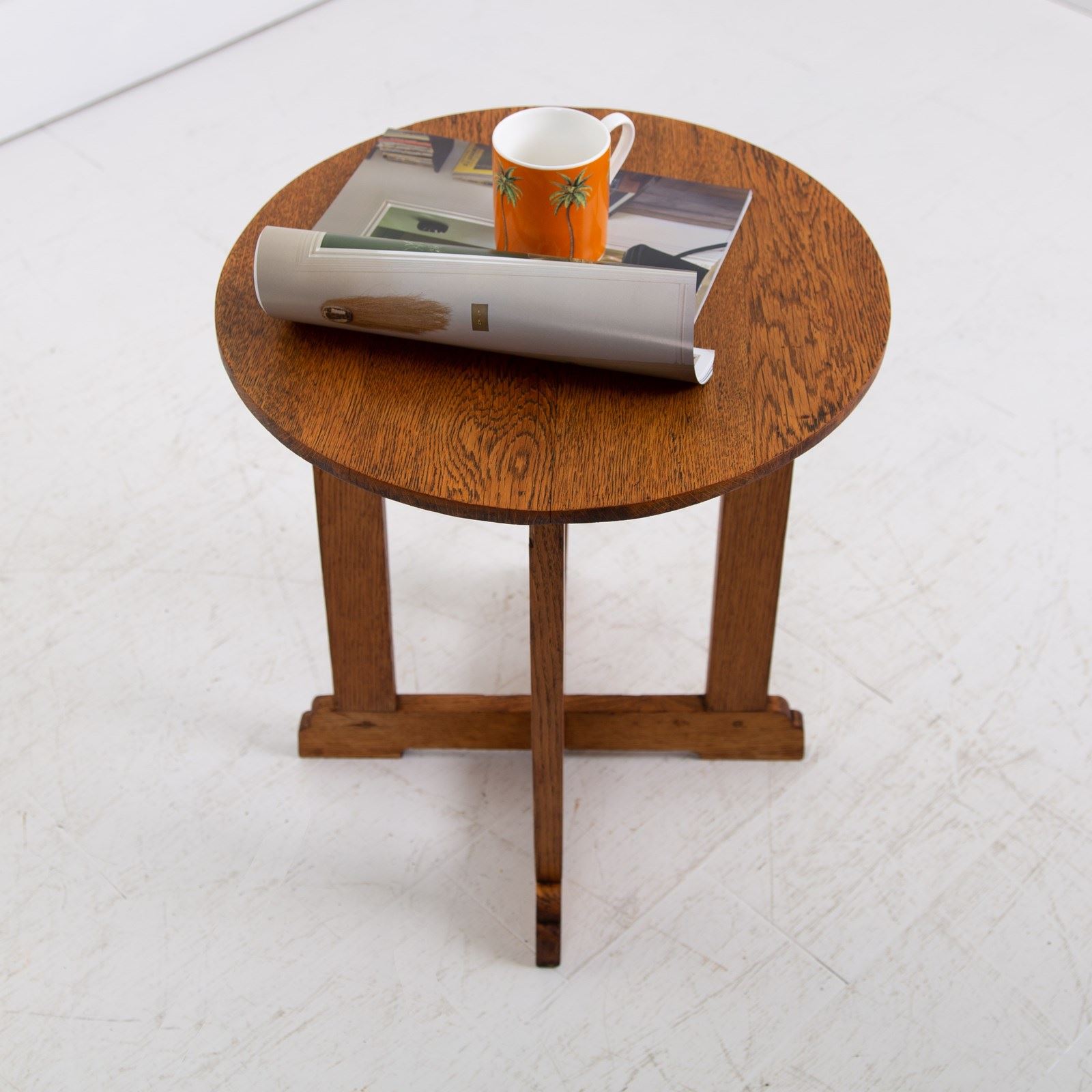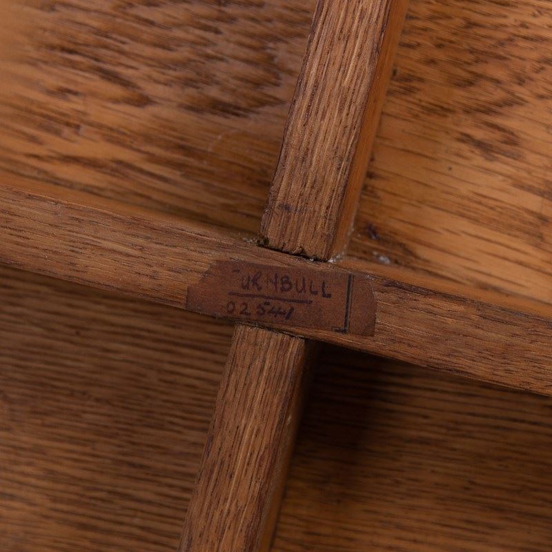 A delightful Cotswold School oak side table with a lean graceful top, cruciform base and lovely shaped ends. This one sits in nice condition with the oak giving off a warm golden glow and sensible aging. Oak dowels and joints on display, it's a well made piece with a little label showing the name Turnbull - maybe the maker or intended owner.