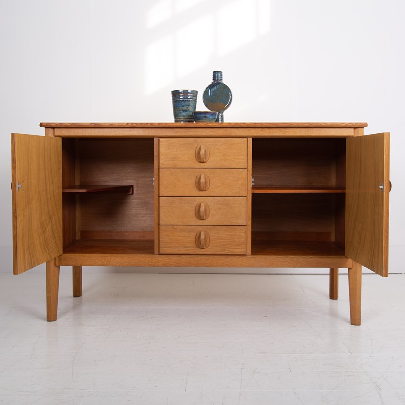 Here we have a wonderful oak Gordon Russell sideboard. Most of the sideboards of this type are finished in walnut and not so many in lighter oak. The sideboard possesses the maker's badge to the rear and sits in fine order. These would have been retailed through Heal’s and the like and the craft quality and design is as you would expect, 1st rate from the Russell workshop.