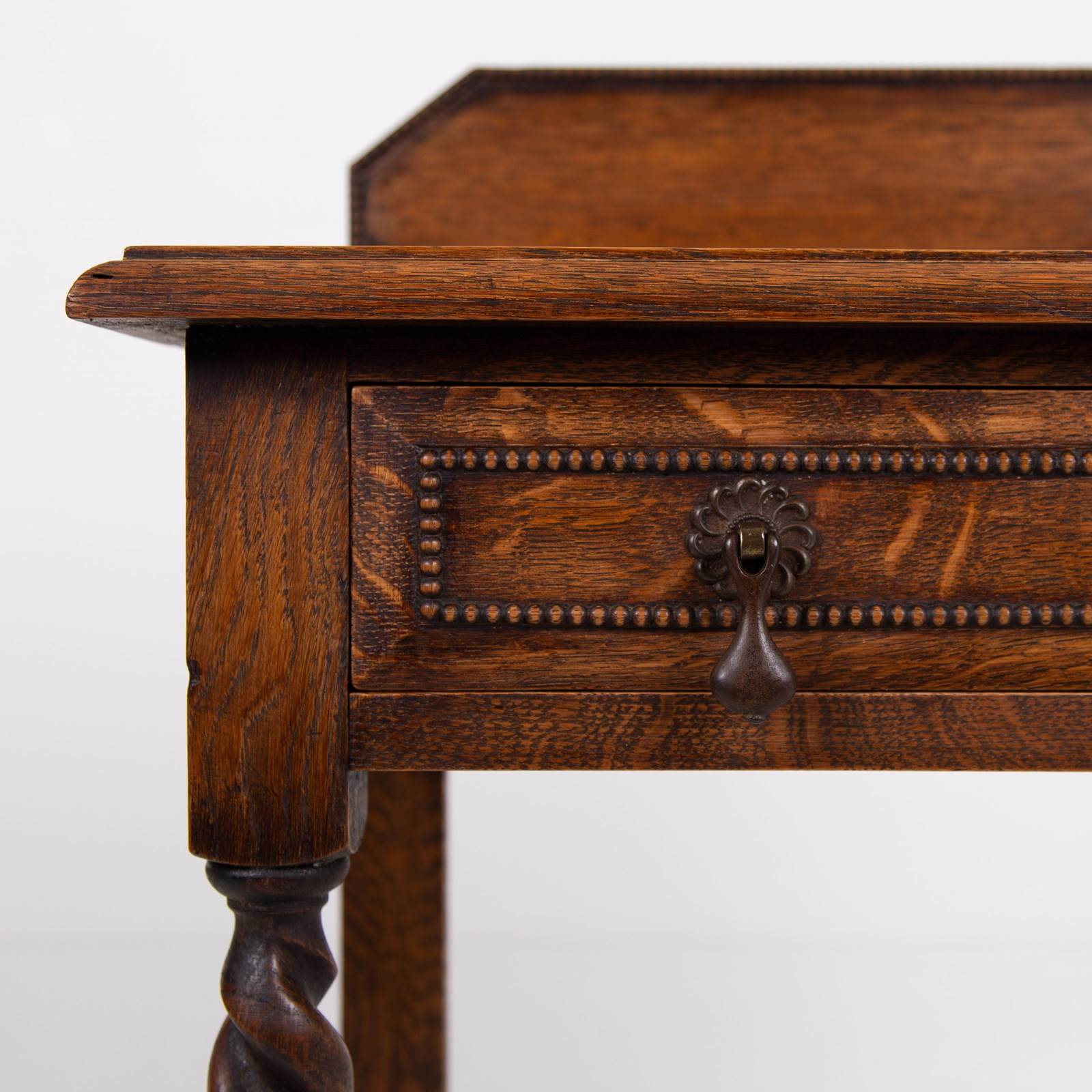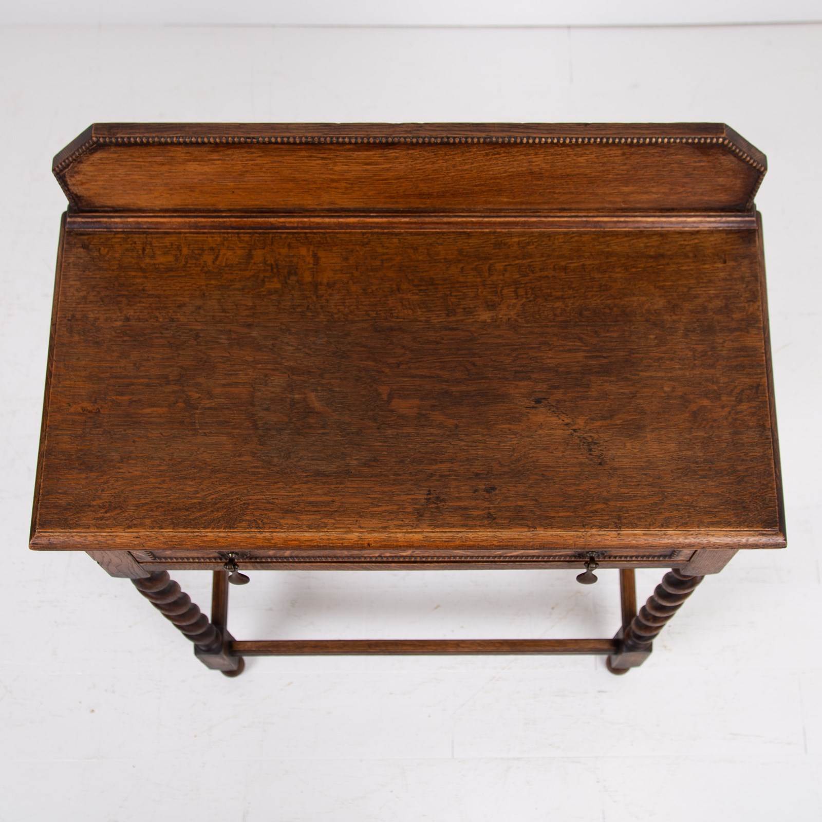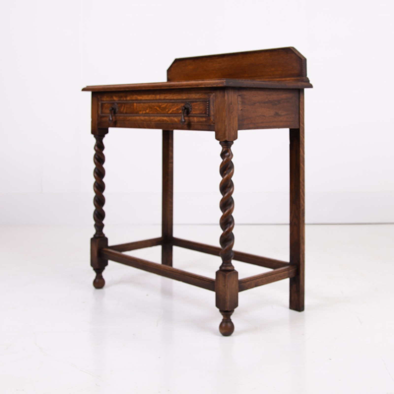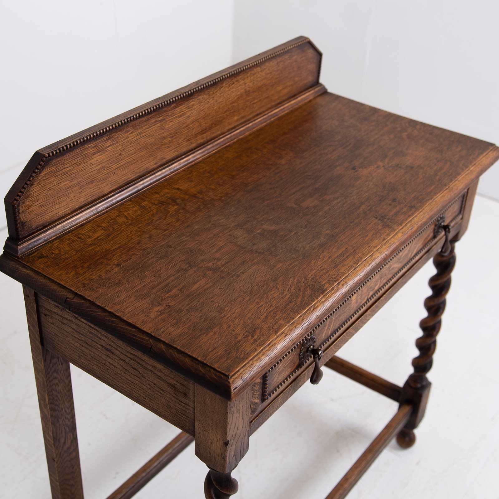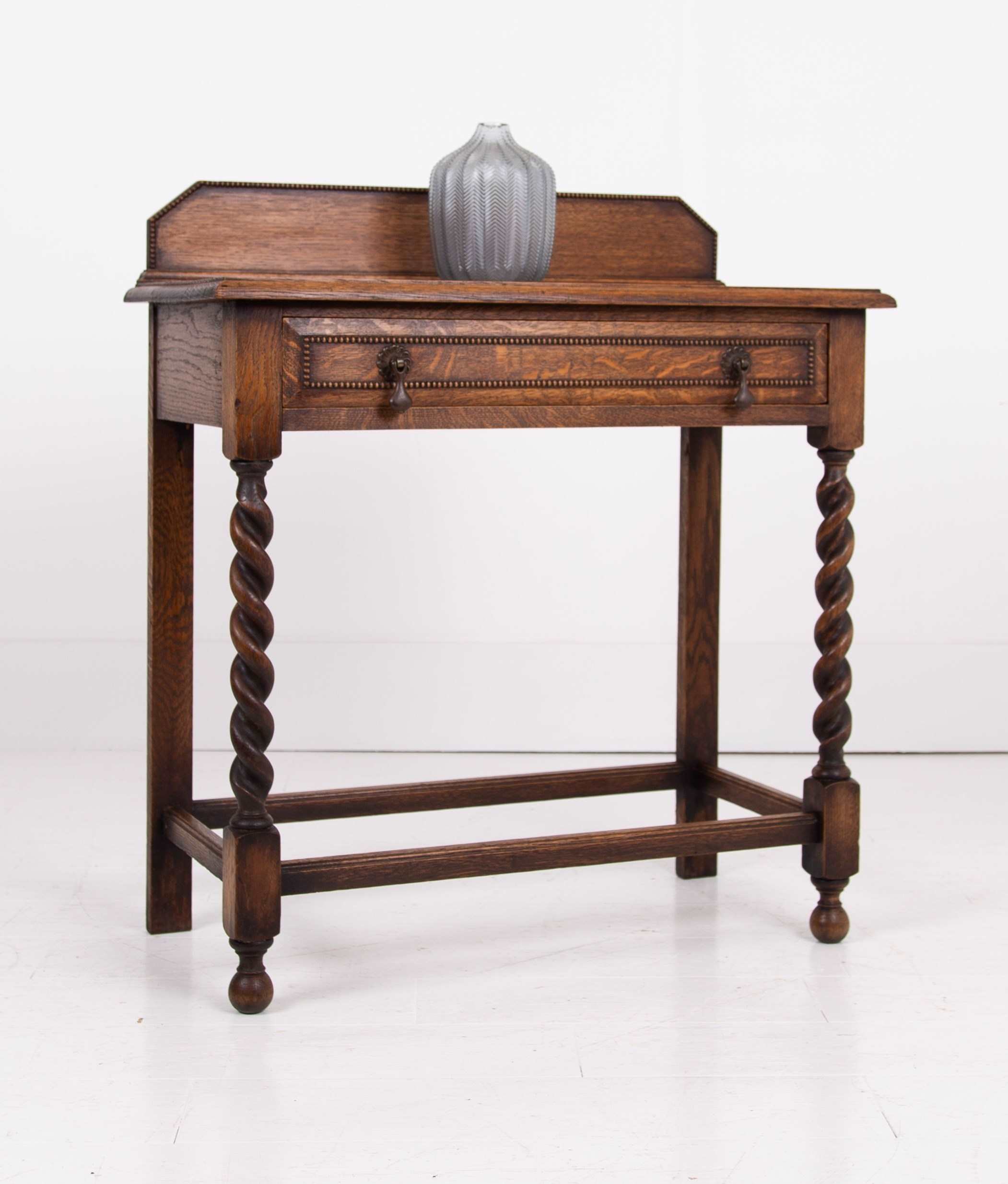 A rather super little single drawer oak side table C1920 in lovely condition from a large period farmhouse in Worcestershire. Such a handy size for a hallway, cottage or smaller sized home. The table sits well with its lovely grained thumb moulded top, decorative beaded back plinth, original well cast drop handles and again a little more decorative beading to the front of the drawer.