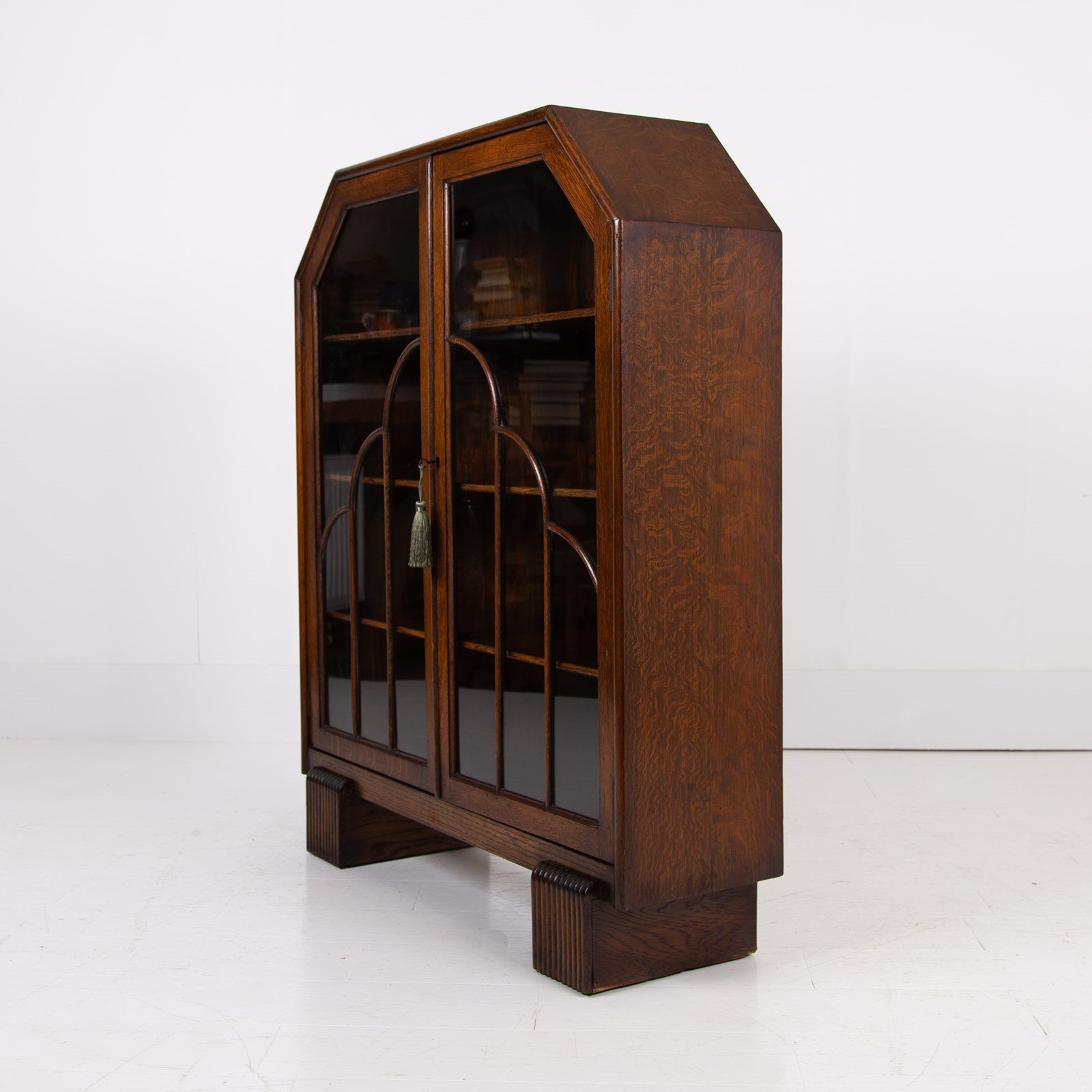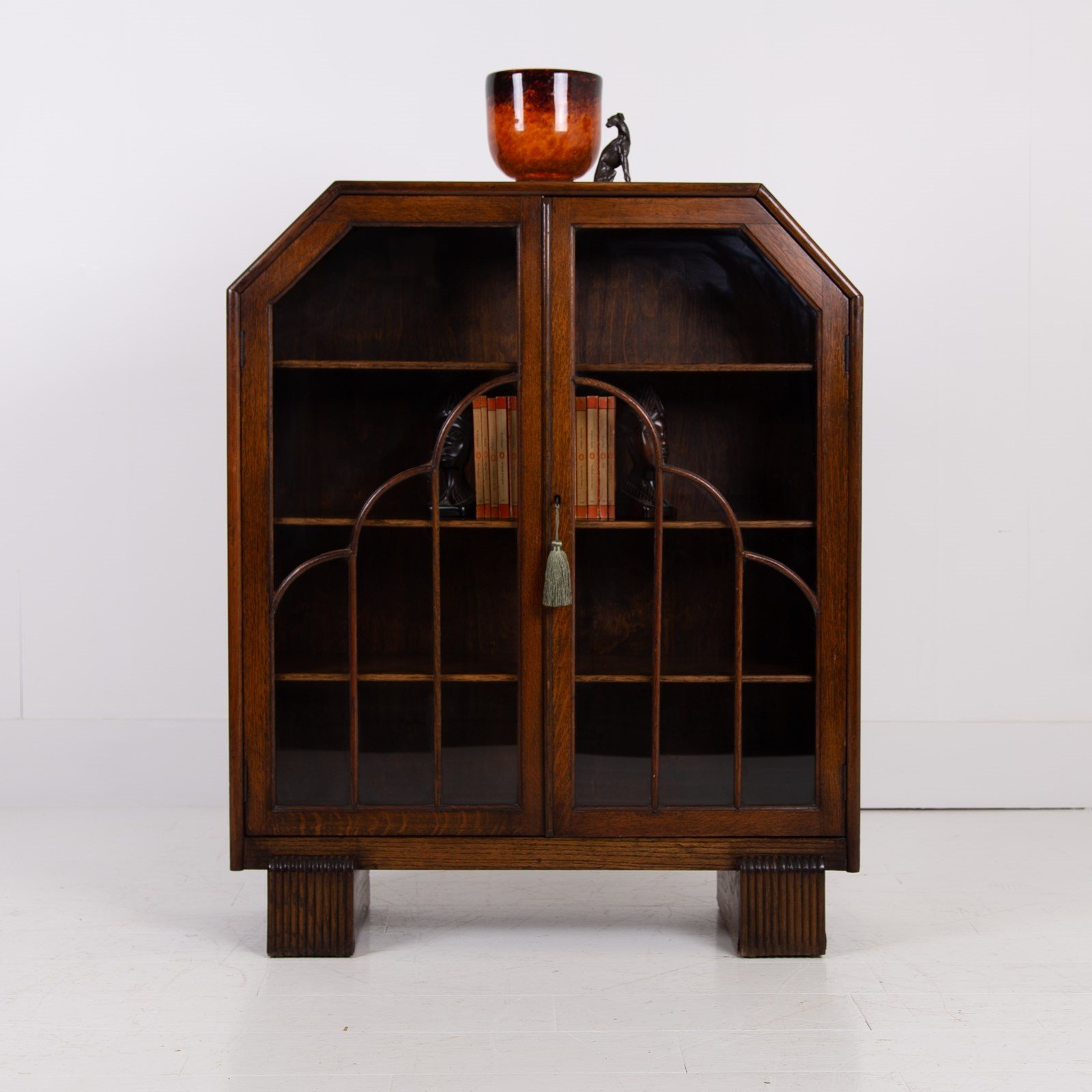 This one comes with a working lock and key, three adjustable shelves, a lovely Deco pattern to the oak framed doors and all perched on highly attractive Art Deco inspired legs. Condition is good with light aging to the piece. No repairs or cracks to the glass and ready to place after a short session in our workshop.