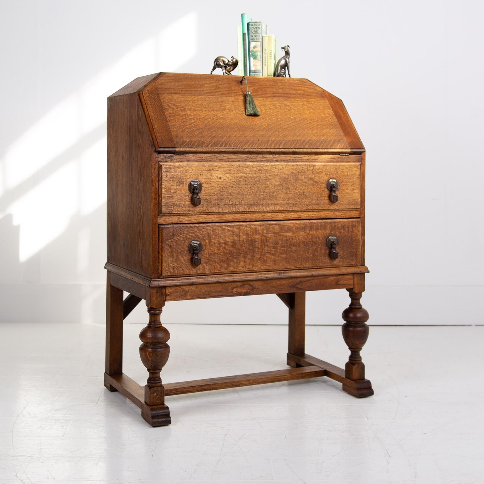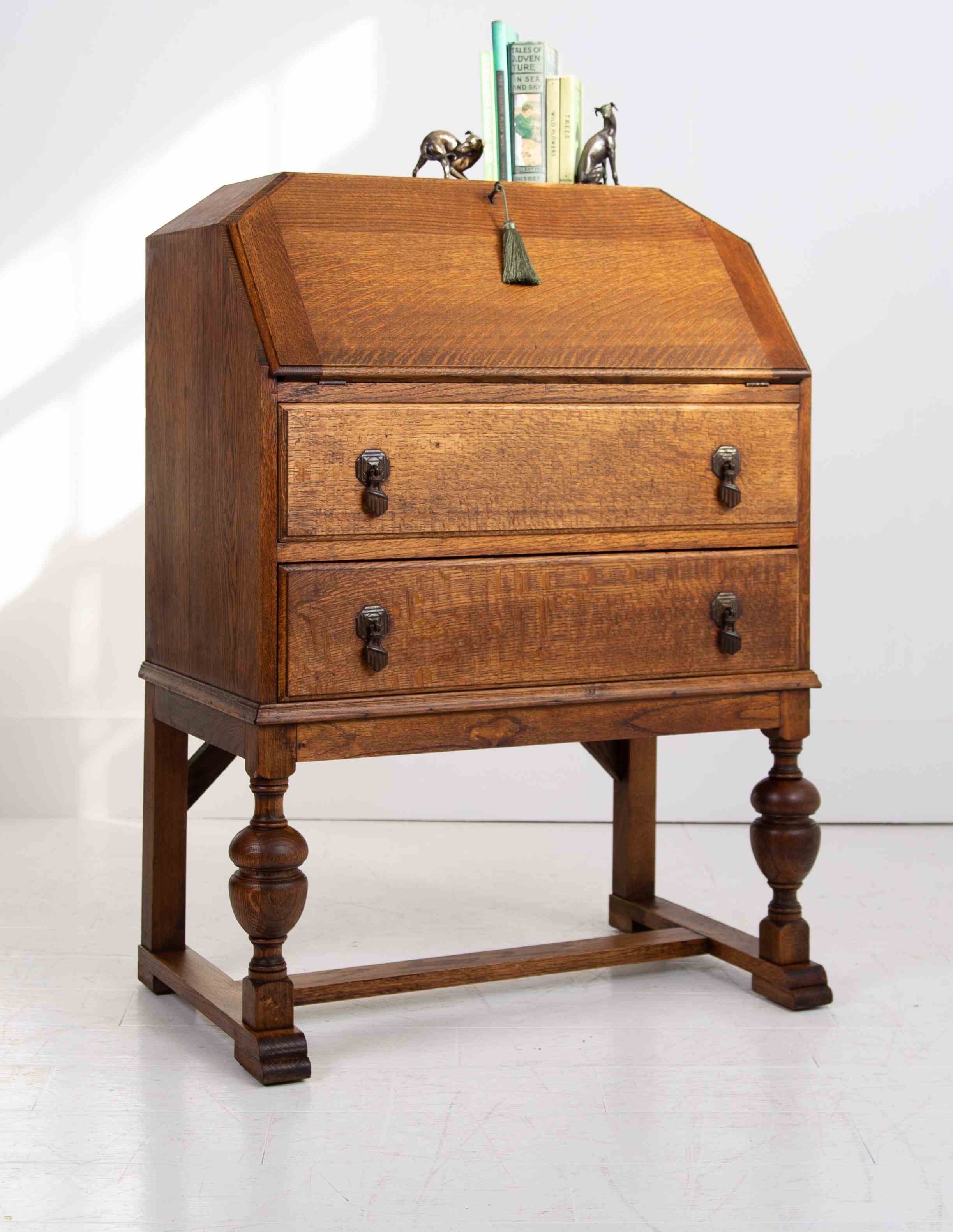 A somewhat handsome and solid English oak 2 drawer bureau desk, late 1920s. It’s sitting in a lovely tone and grain and is ready for placing after a careful repolish in our workshop.