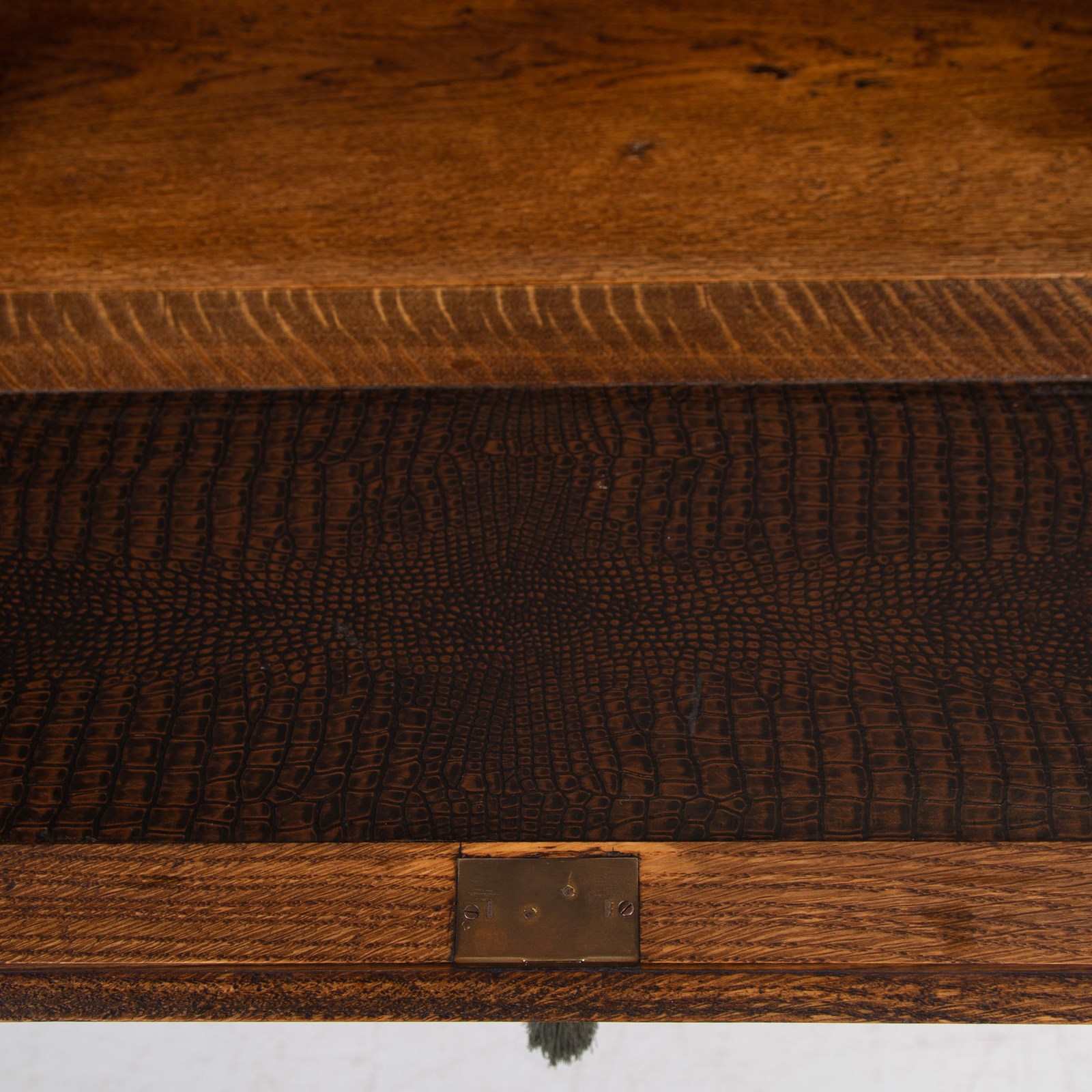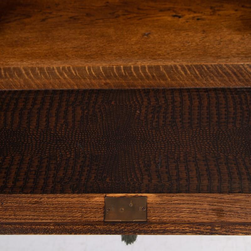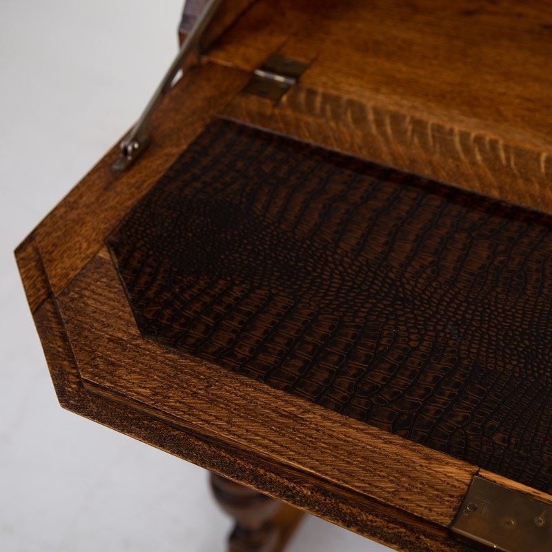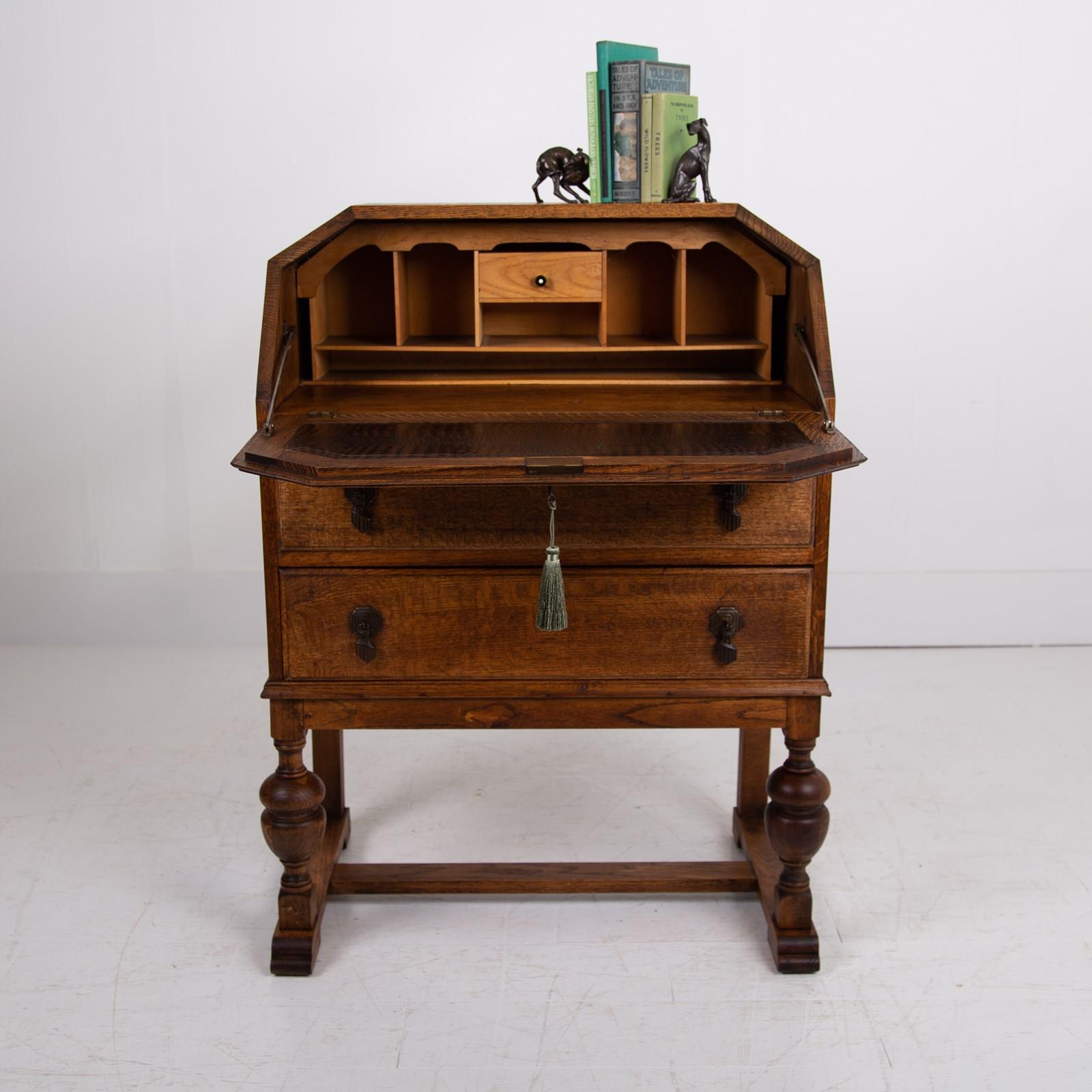 This one has a pleasing stance and is compact in scale compared to many of its counterparts. We have two useful solid oak drawers with original drop pendant handles both stamped to rear with casting number, a rather nice set of turned legs with a flat extended base and of course a useful interior of a little bank of pigeon holes, stamp drawer and original “mock croc” writing area all hidden and kept secret by way of a working lock and key.