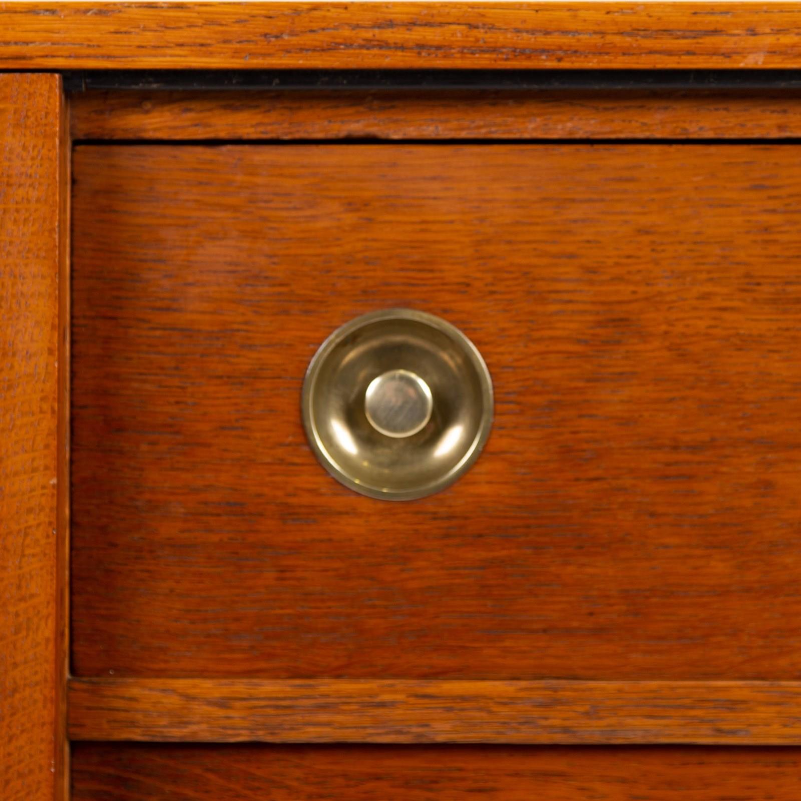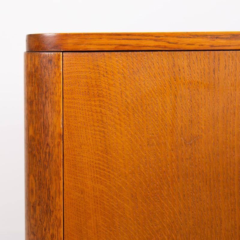 This one sits wonderfully well of superior design and craft with its curved edges, good grain and tone of oak, the flight of 3 drawers with their very attractive original circular brass knobs, internal solid shelves hidden by a pair of sliding oak doors all sitting on the slab end base. Nice panelled back to boot!