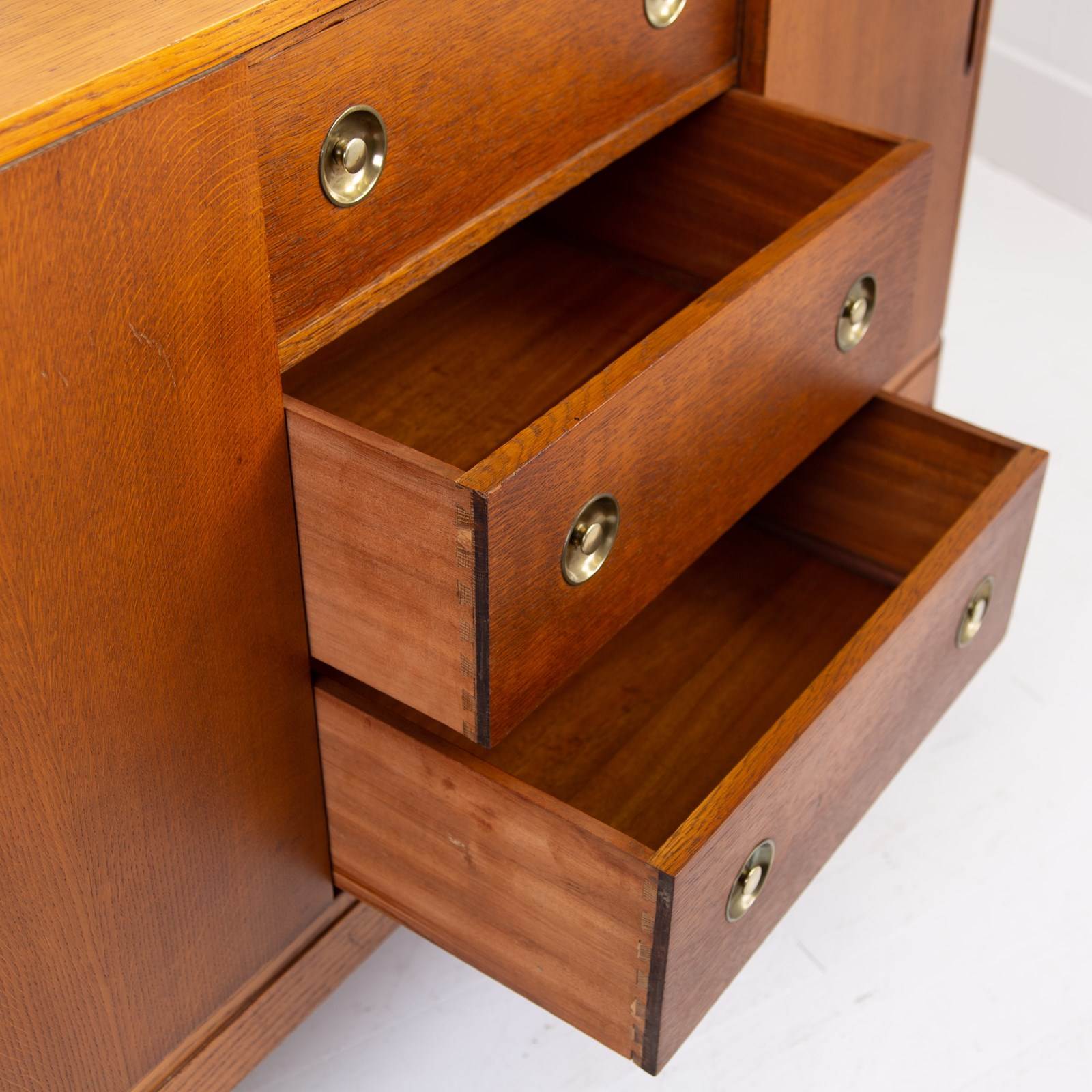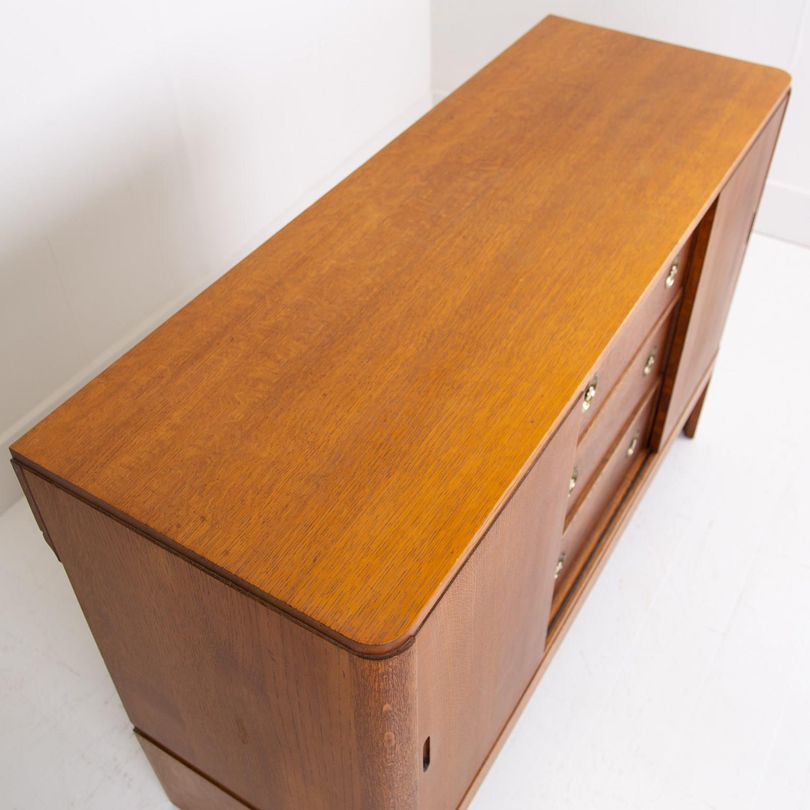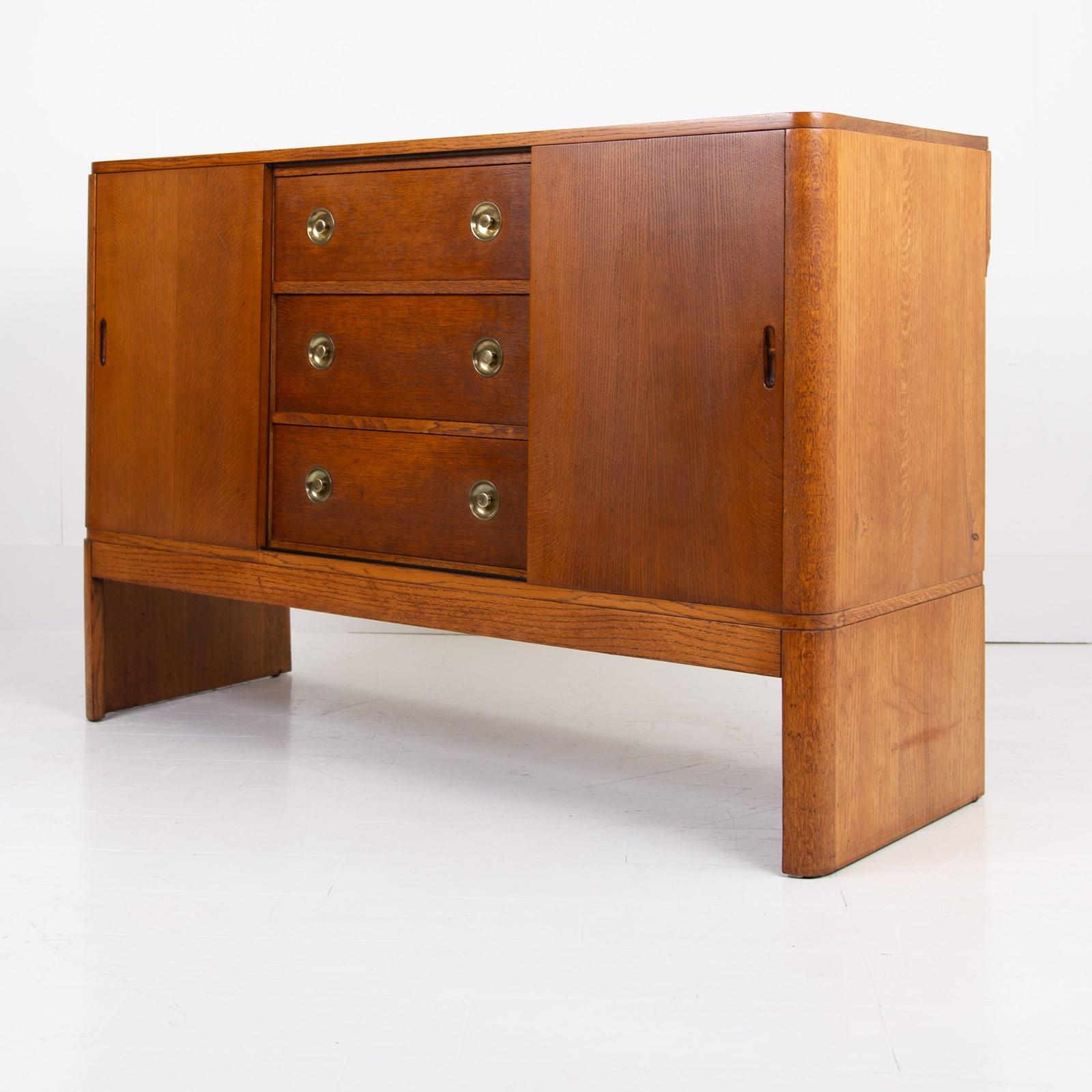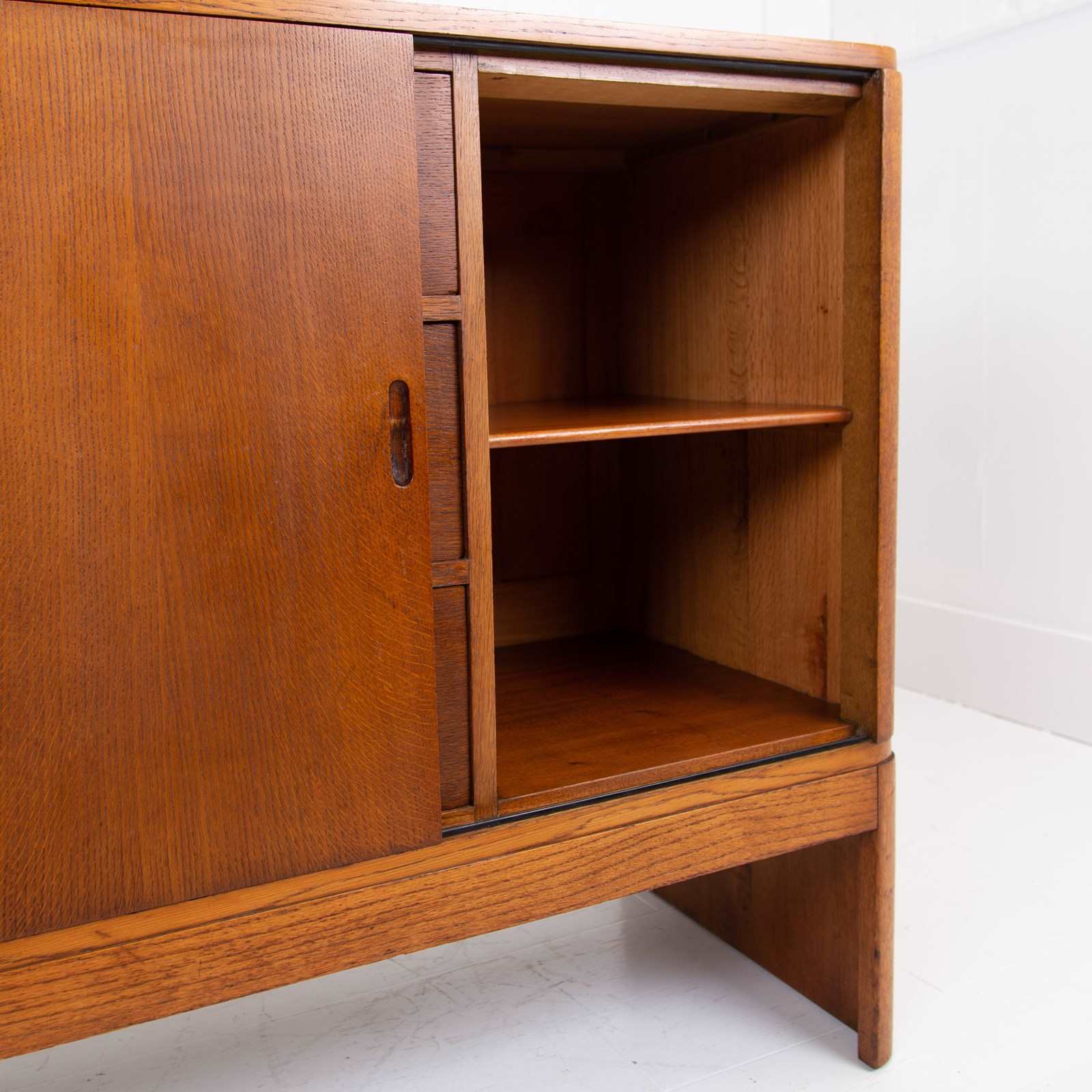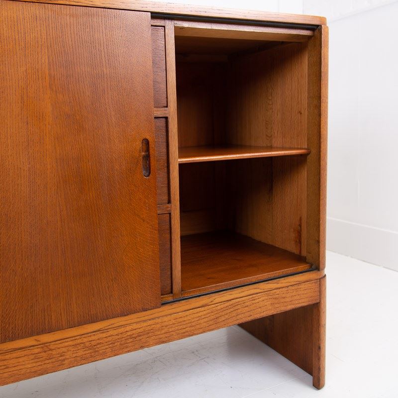 A stunning looking English oak modernist sideboard with sliding doors either side of a flight of central drawers. Not seen another of this design, quality and condition - no maker's mark but number stamped to the rear.