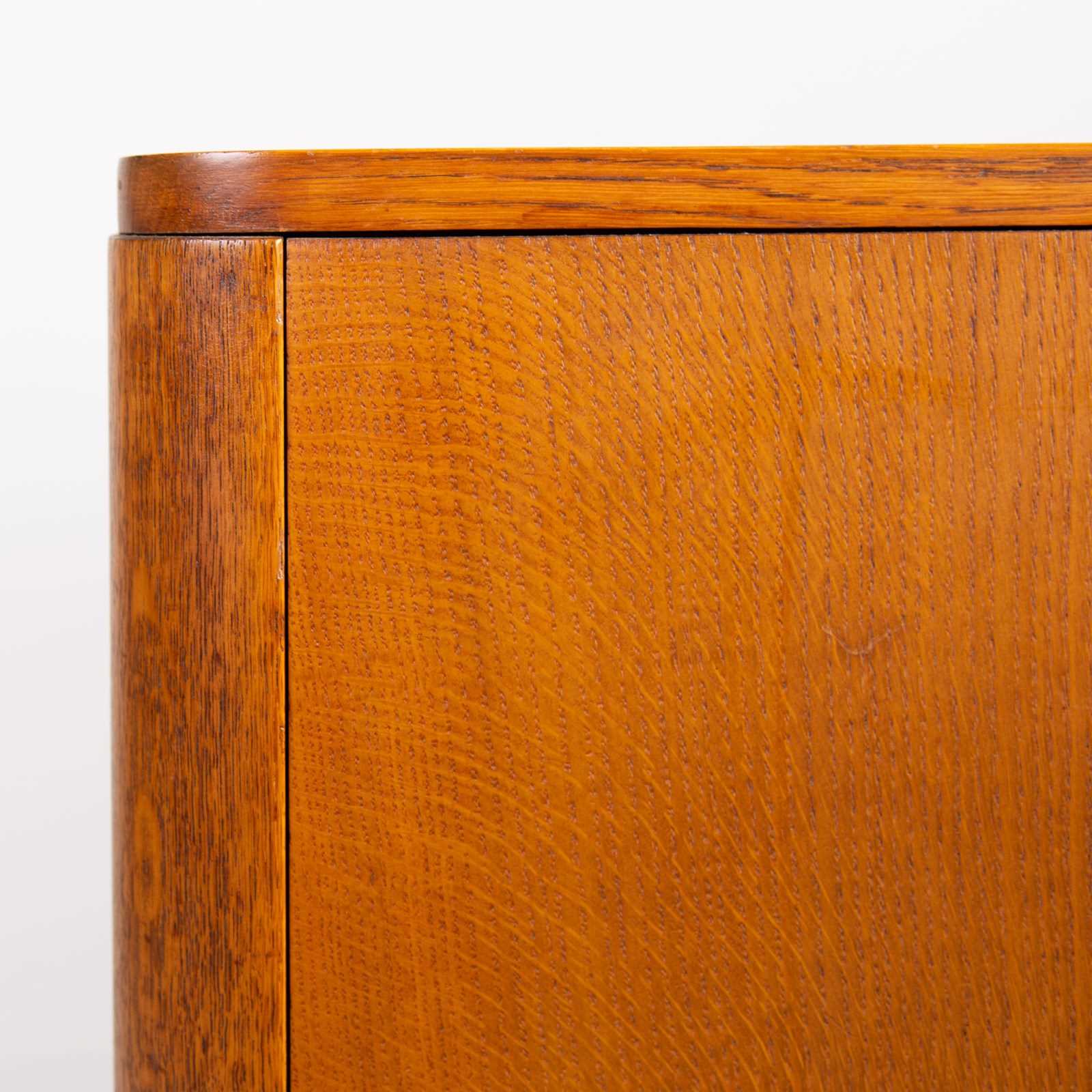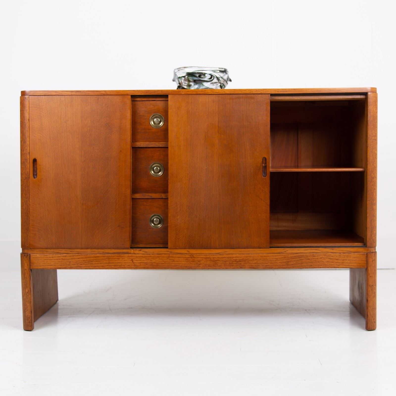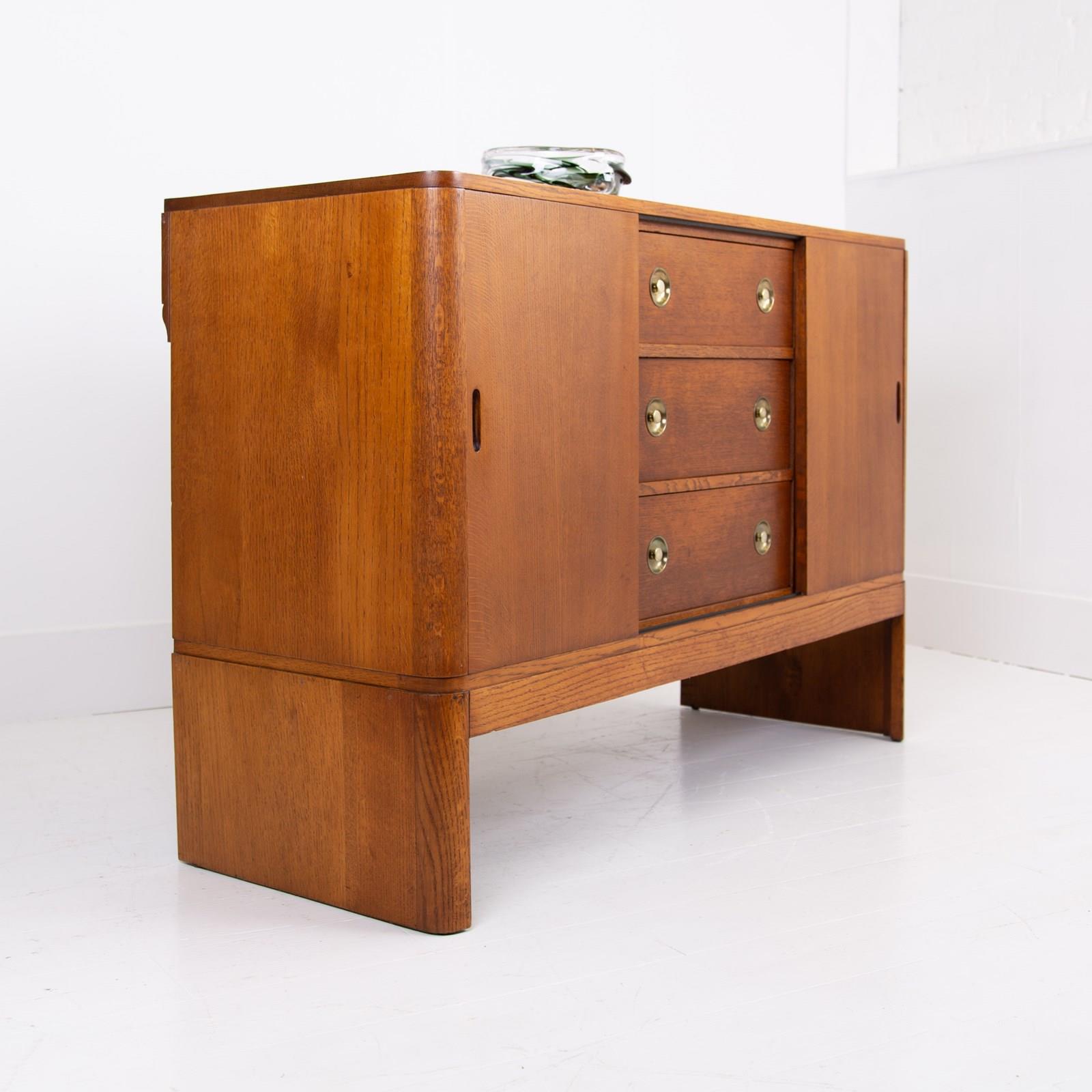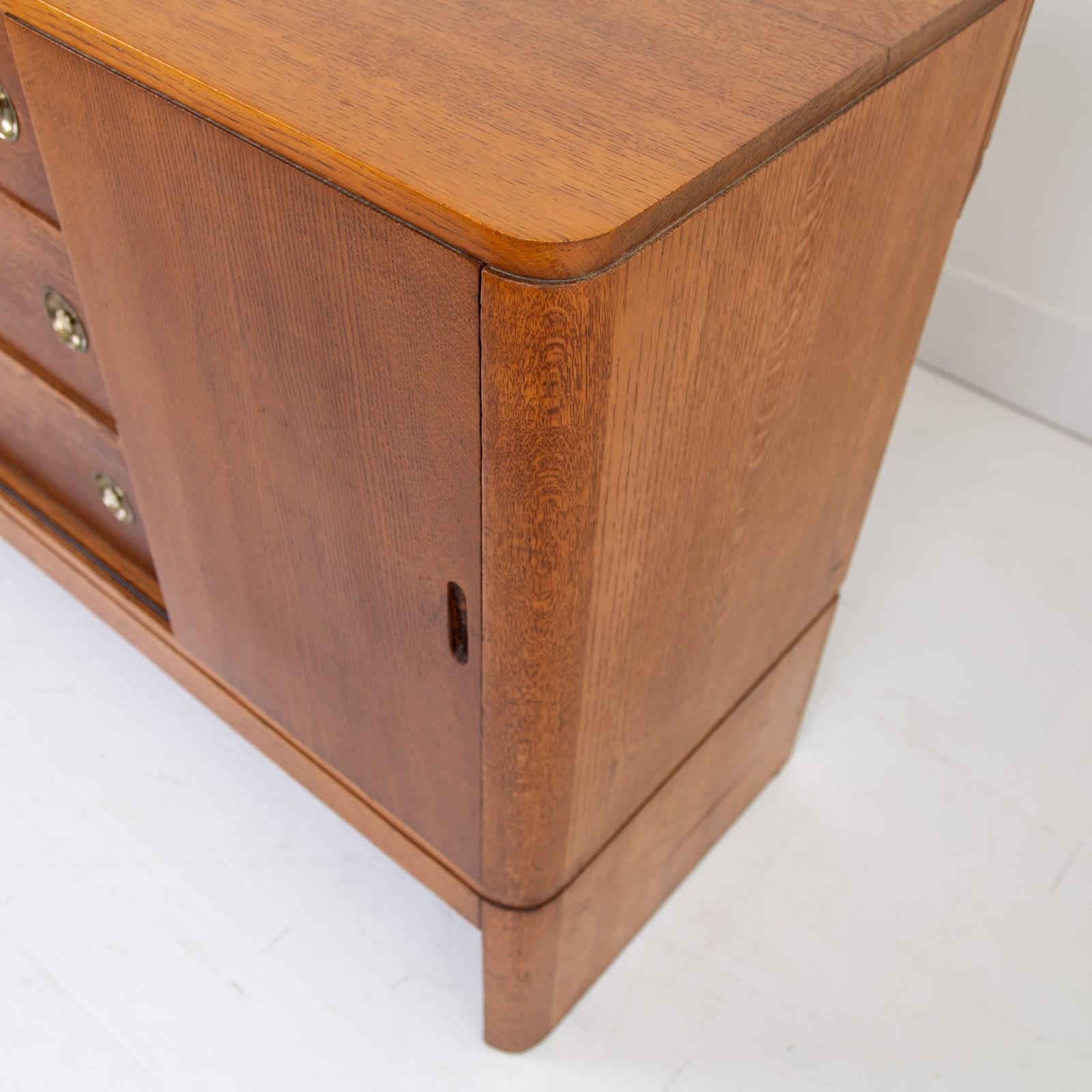 A stunning looking English oak modernist sideboard with sliding doors either side of a flight of central drawers. Not seen another of this design, quality and condition - no maker's mark but number stamped to the rear.