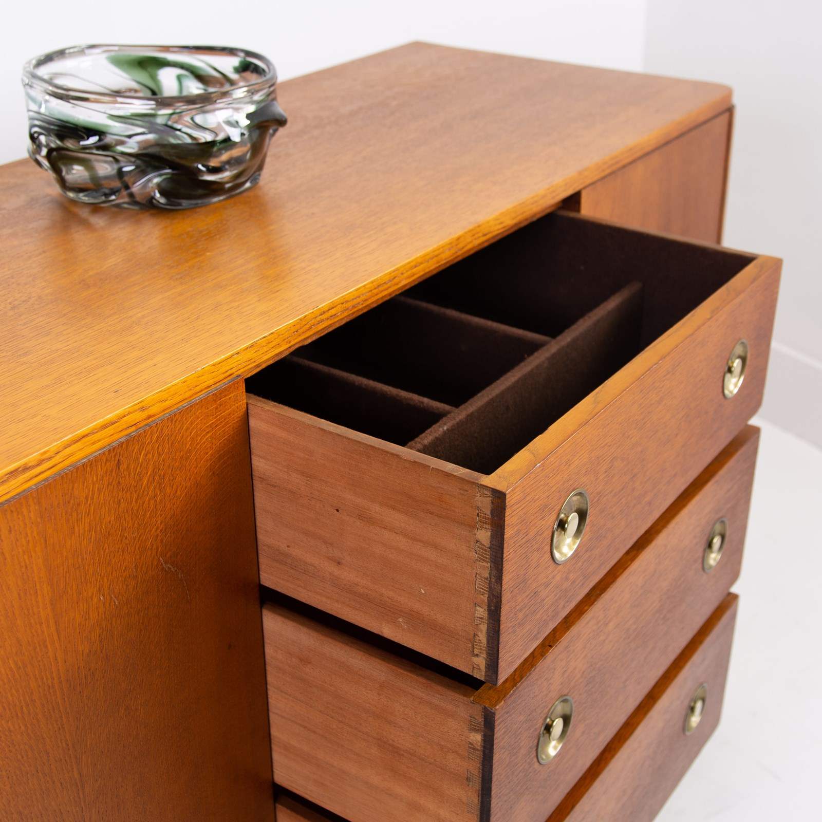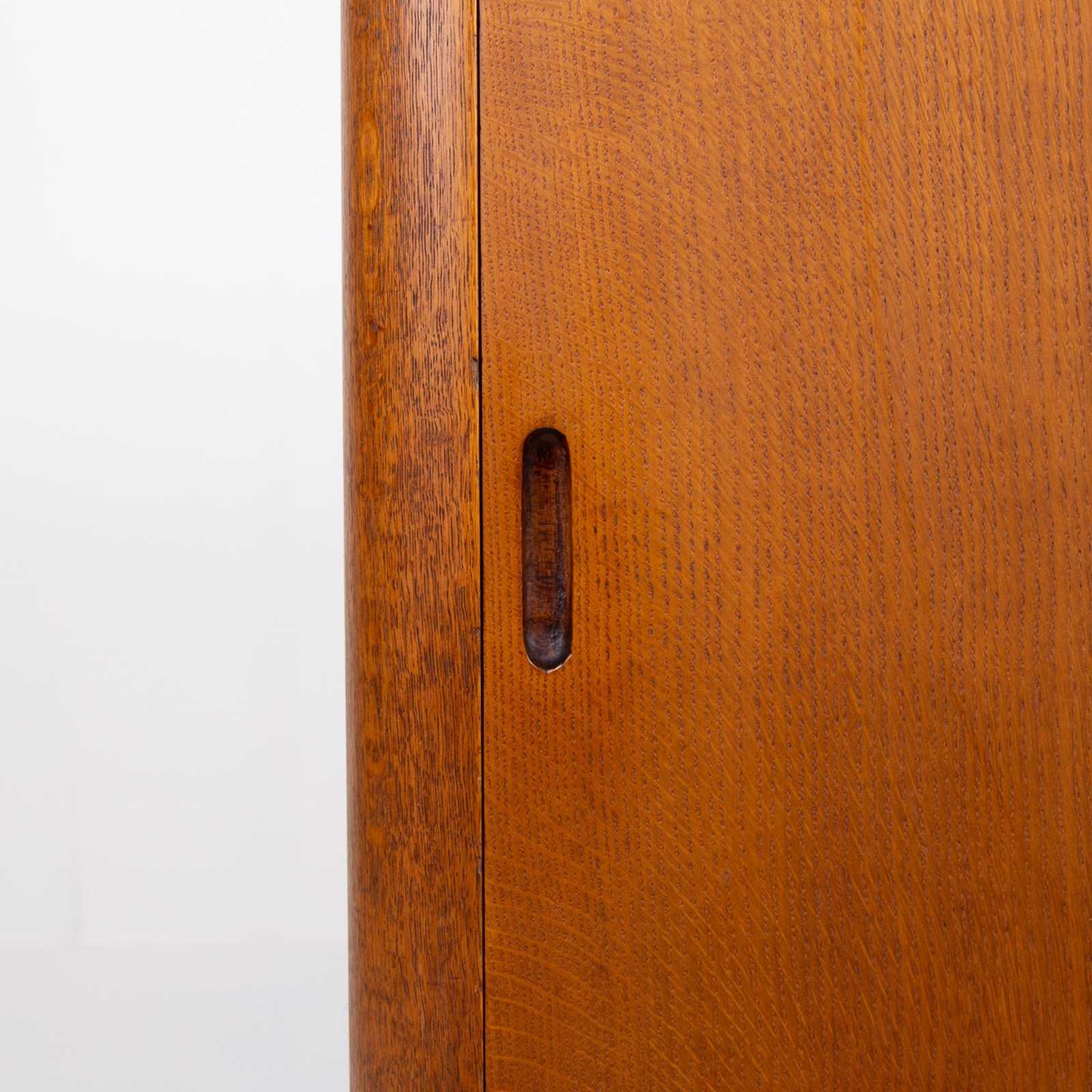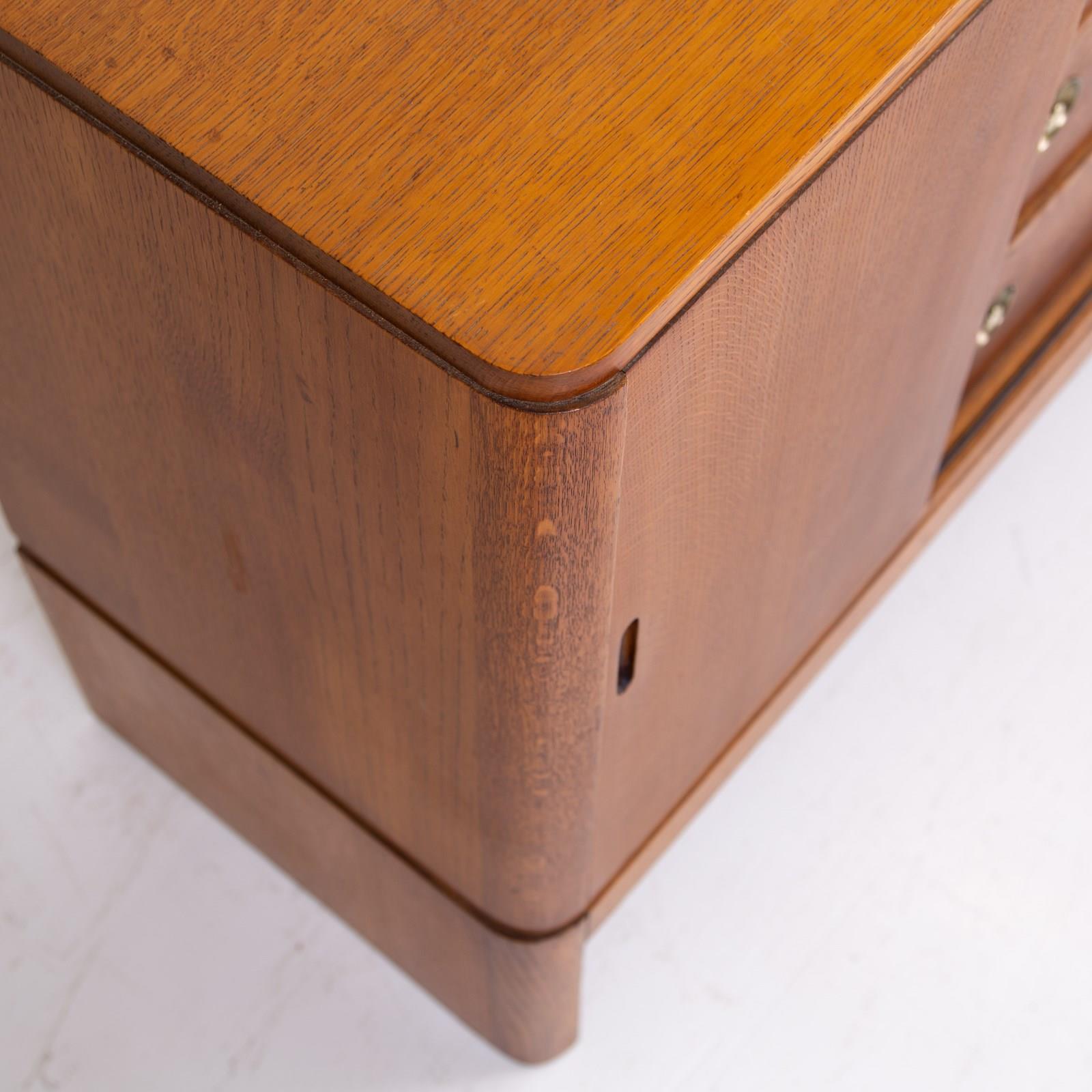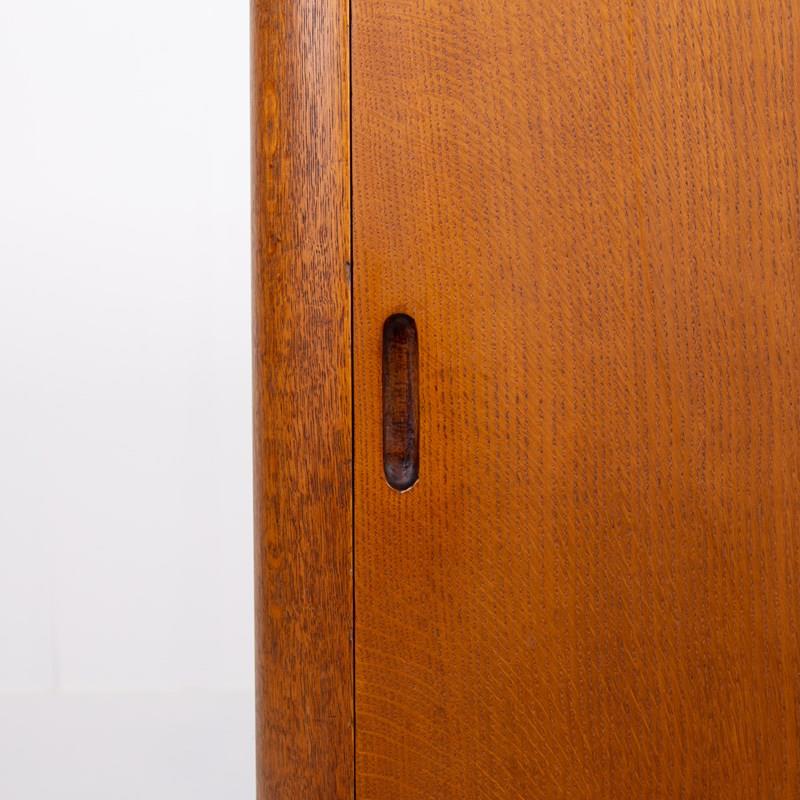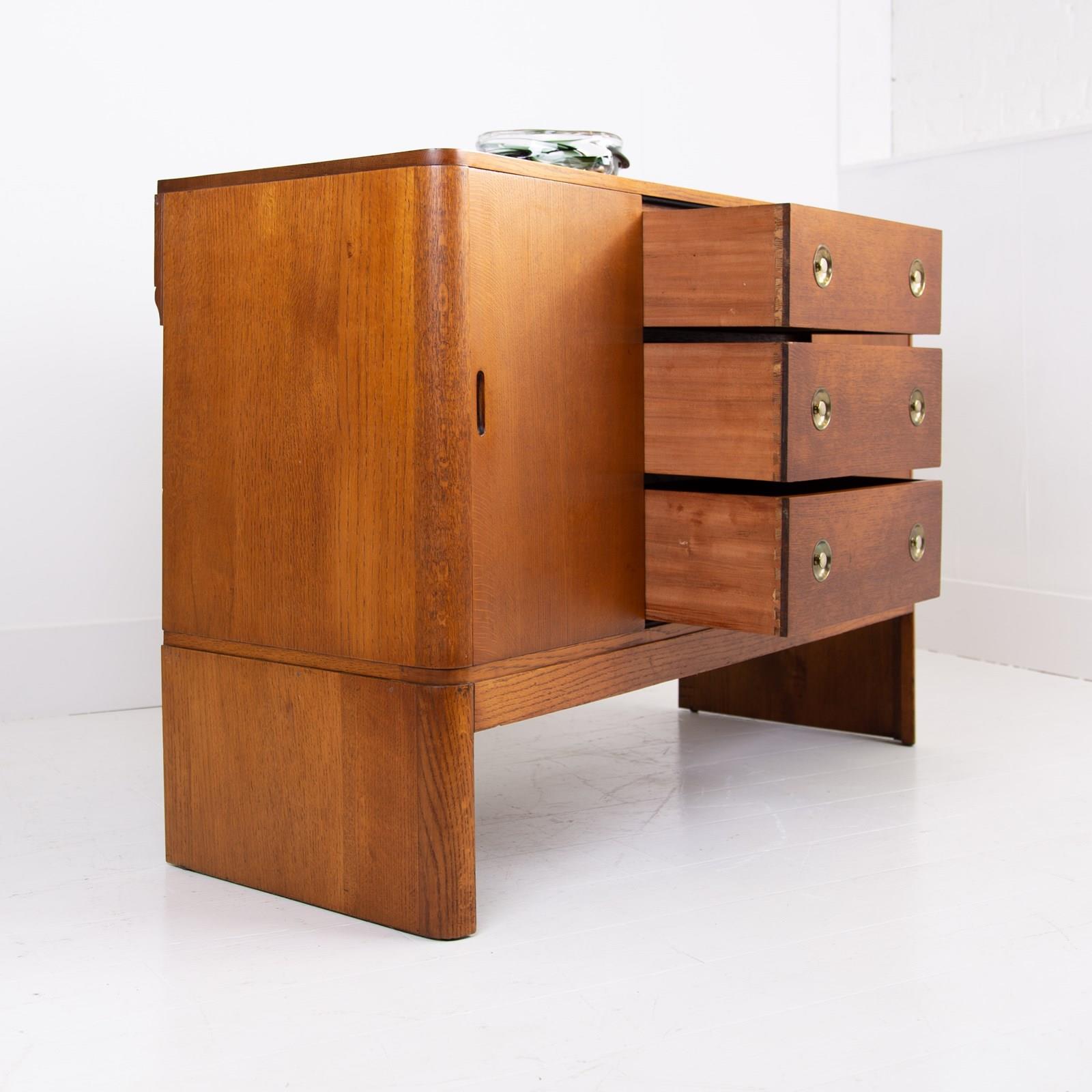 A stunning looking English oak modernist sideboard with sliding doors either side of a flight of central drawers. Not seen another of this design, quality and condition - no maker's mark but number stamped to the rear.
