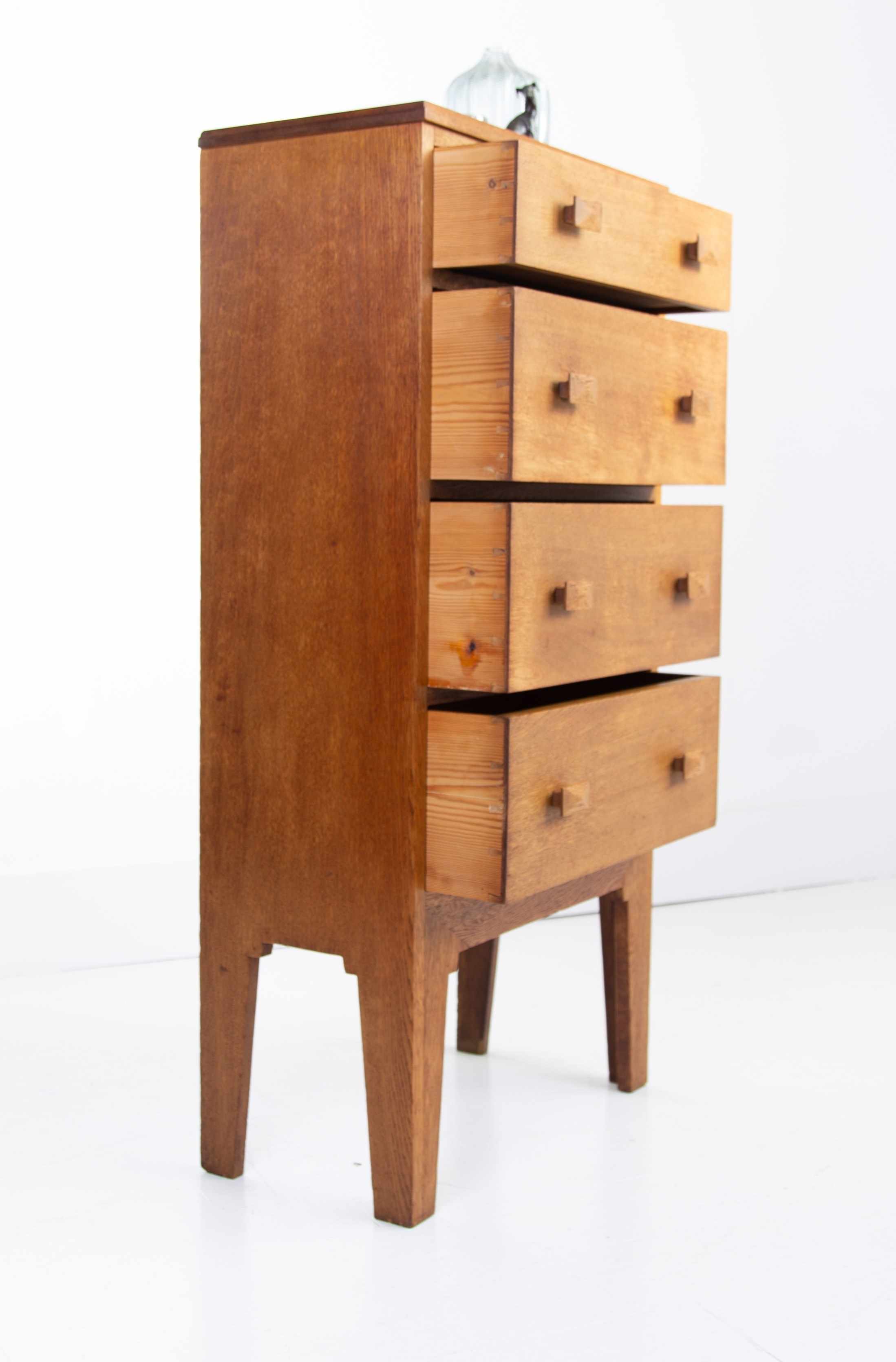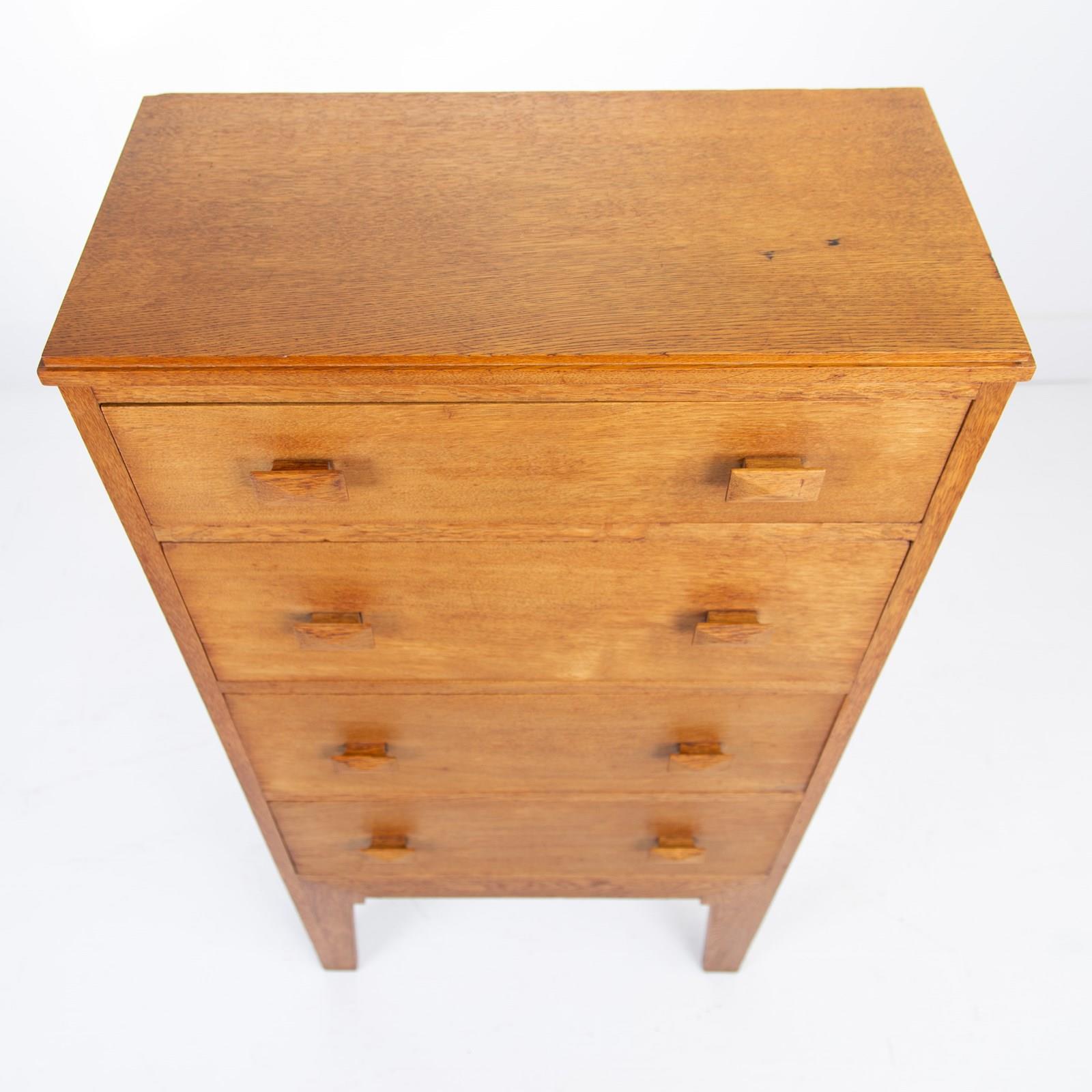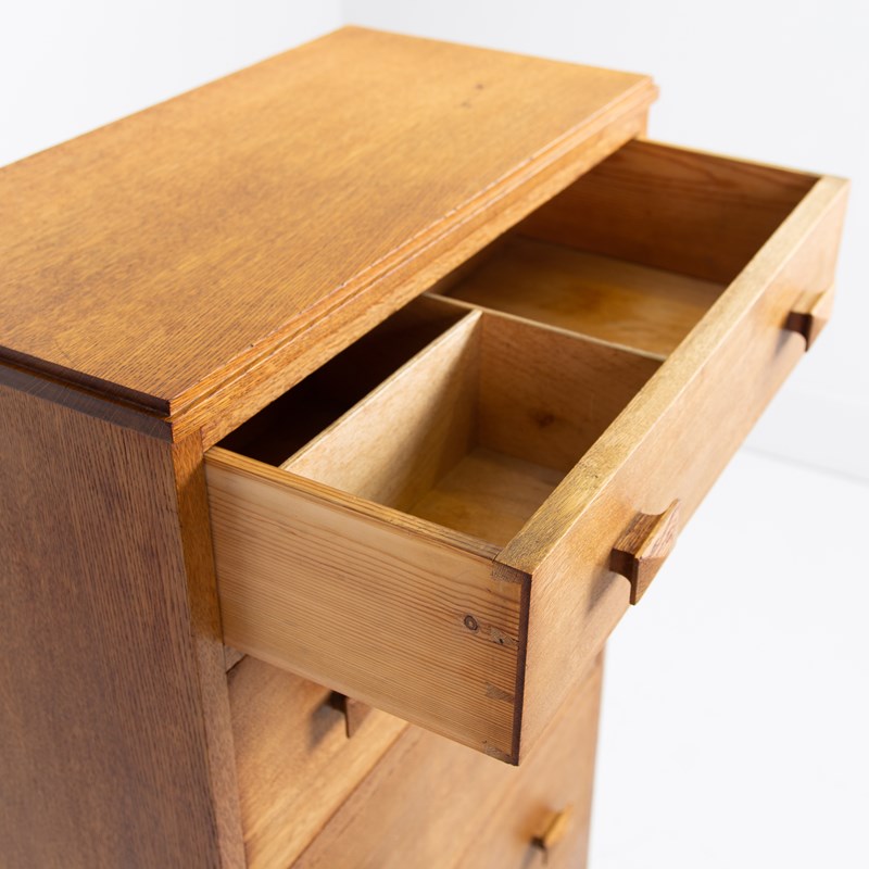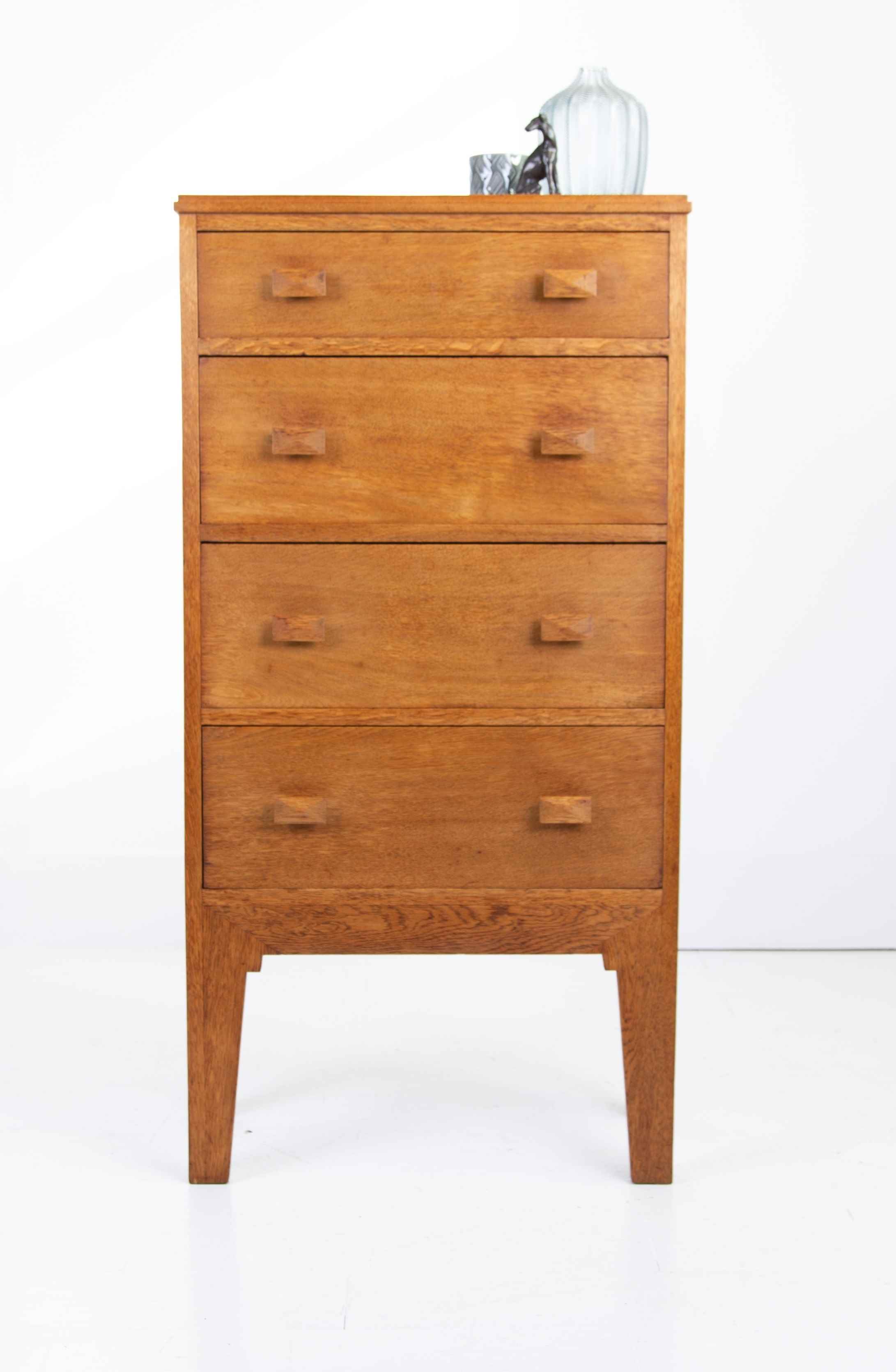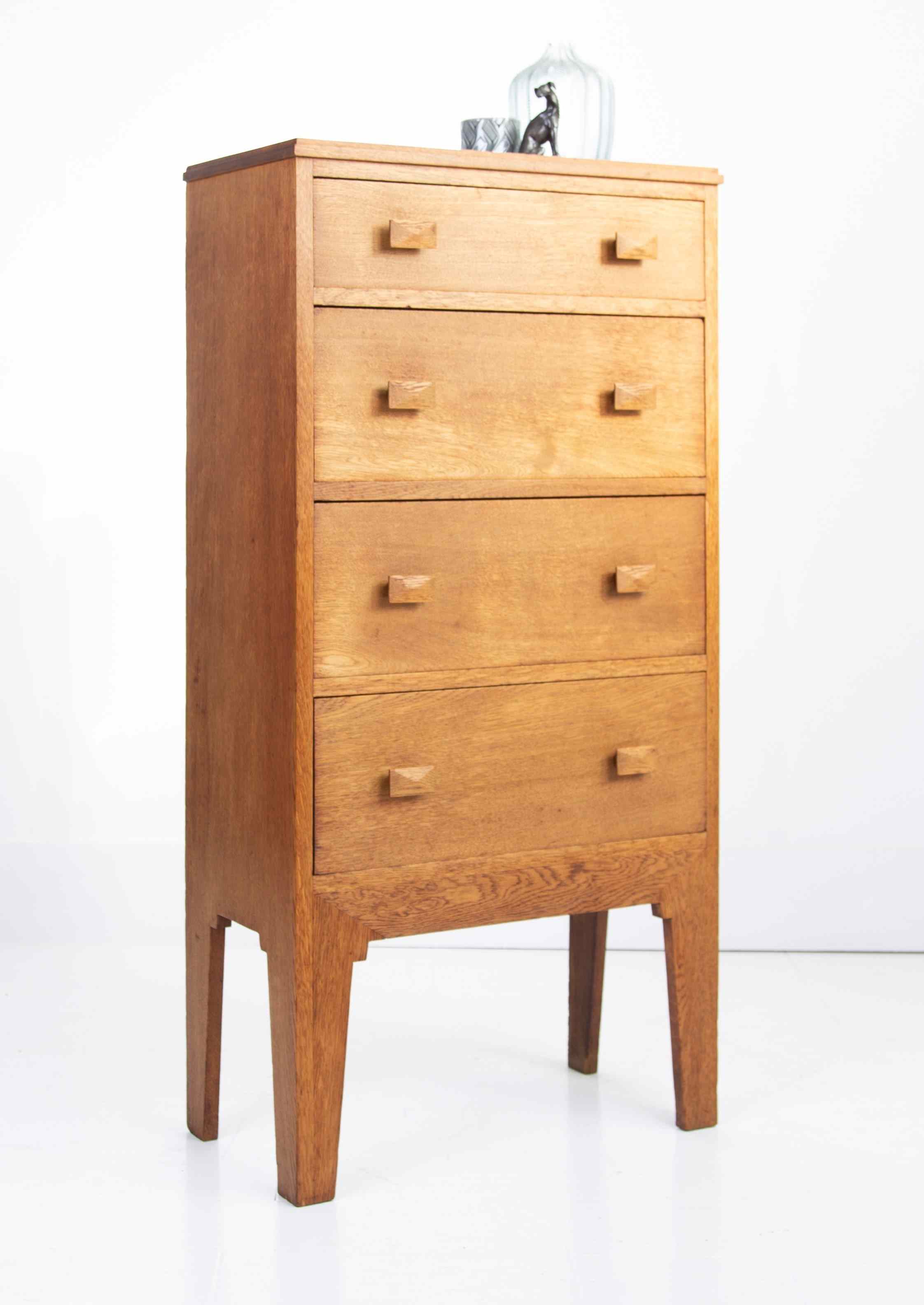 Very likely a commission piece, certainly a one off, we have a super looking chest of drawers in a golden oak C1940 with those extraordinarily wonderful long stepped legs and oak handles. Not only so attractive but carefully handmade with a great eye for design. Its scale and look make it so very placeable.