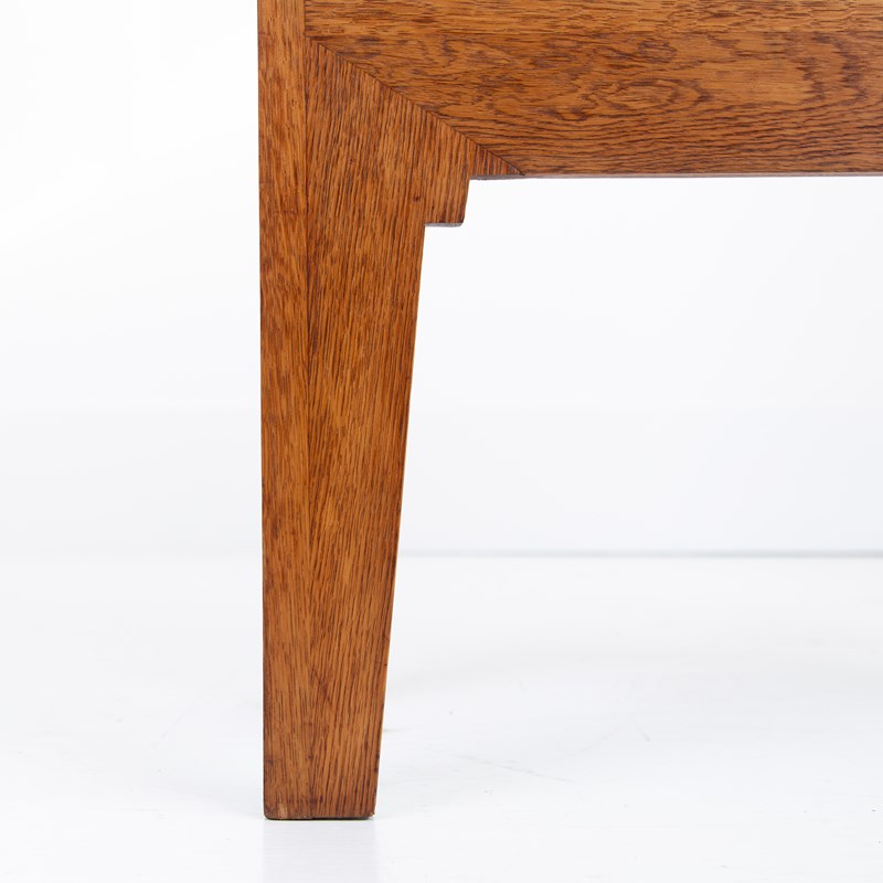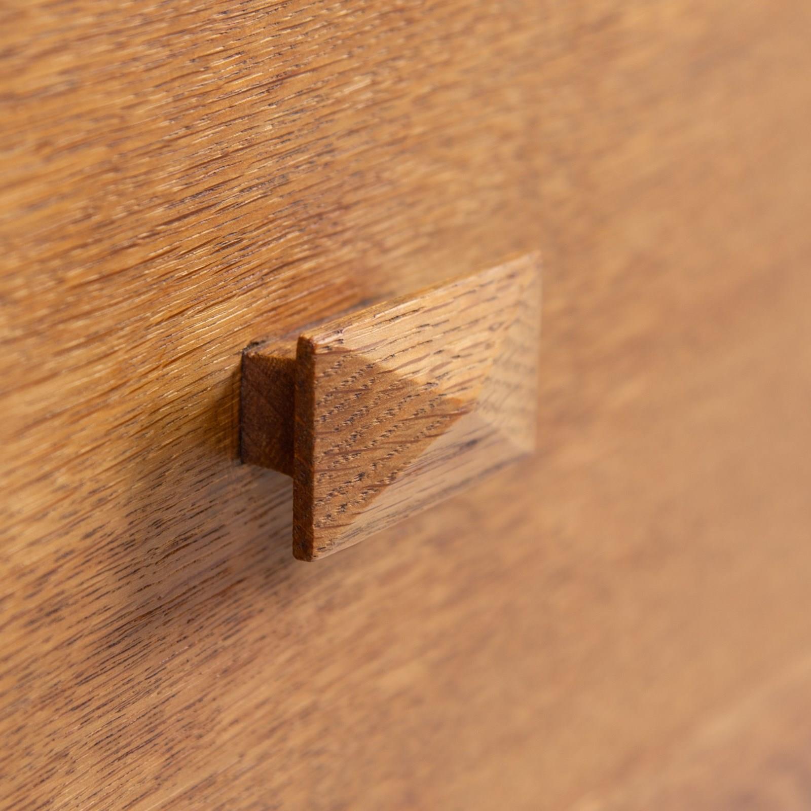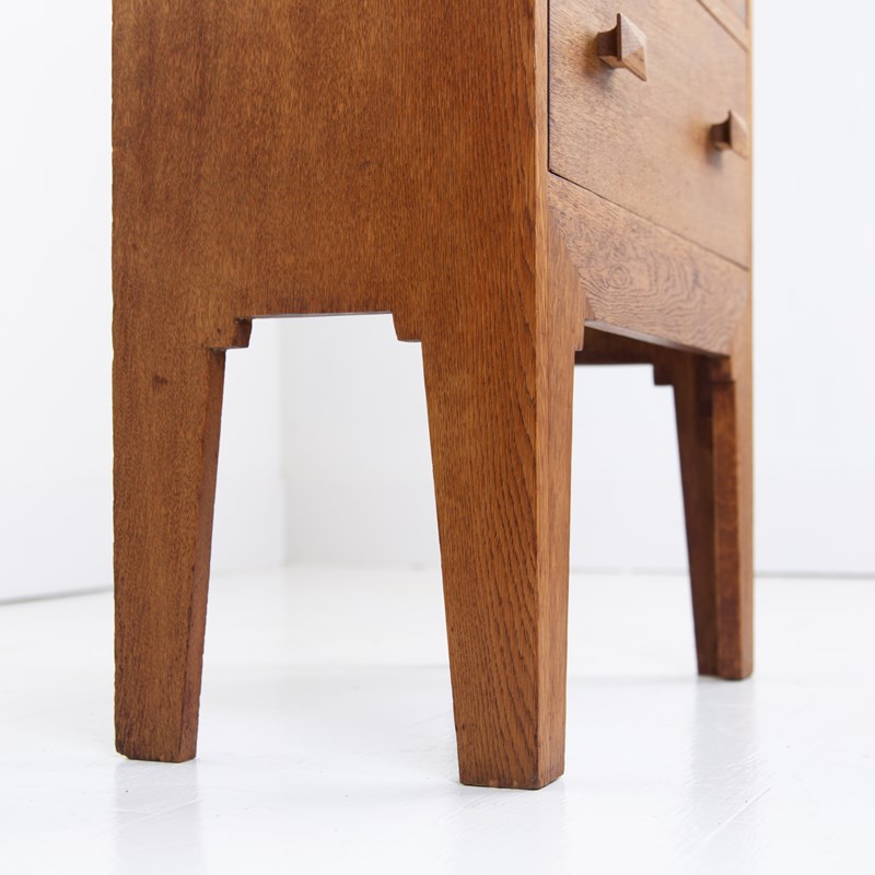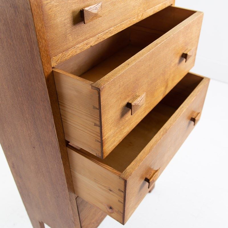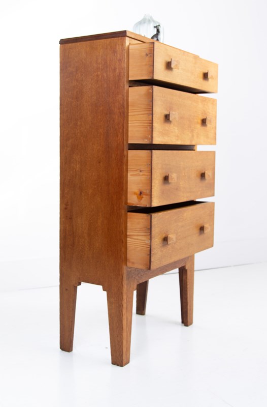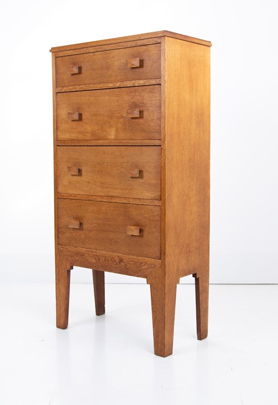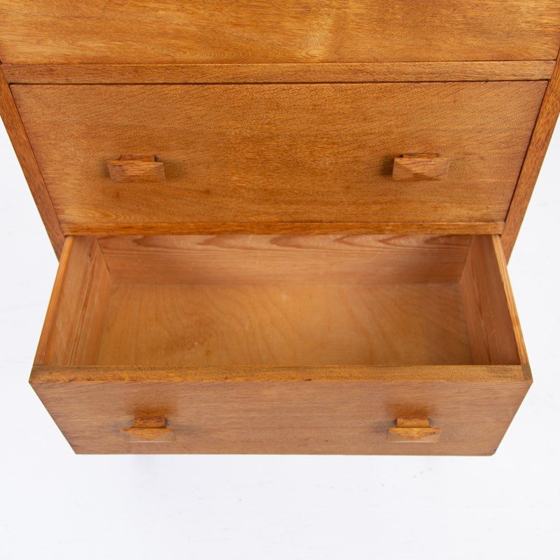 Very likely a commission piece, certainly a one off, we have a super looking chest of drawers in a golden oak C1940 with those extraordinarily wonderful long stepped legs and oak handles. Not only so attractive but carefully handmade with a great eye for design. Its scale and look make it so very placeable.