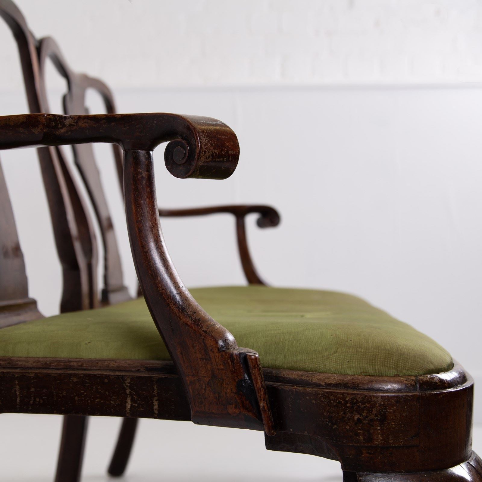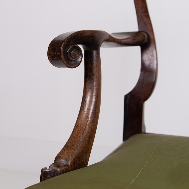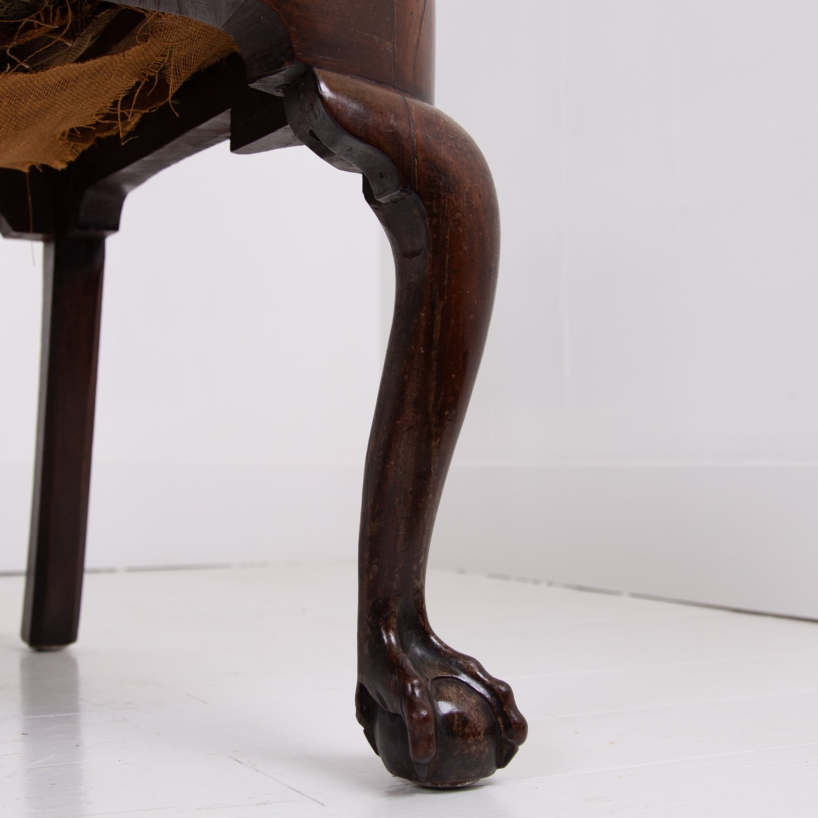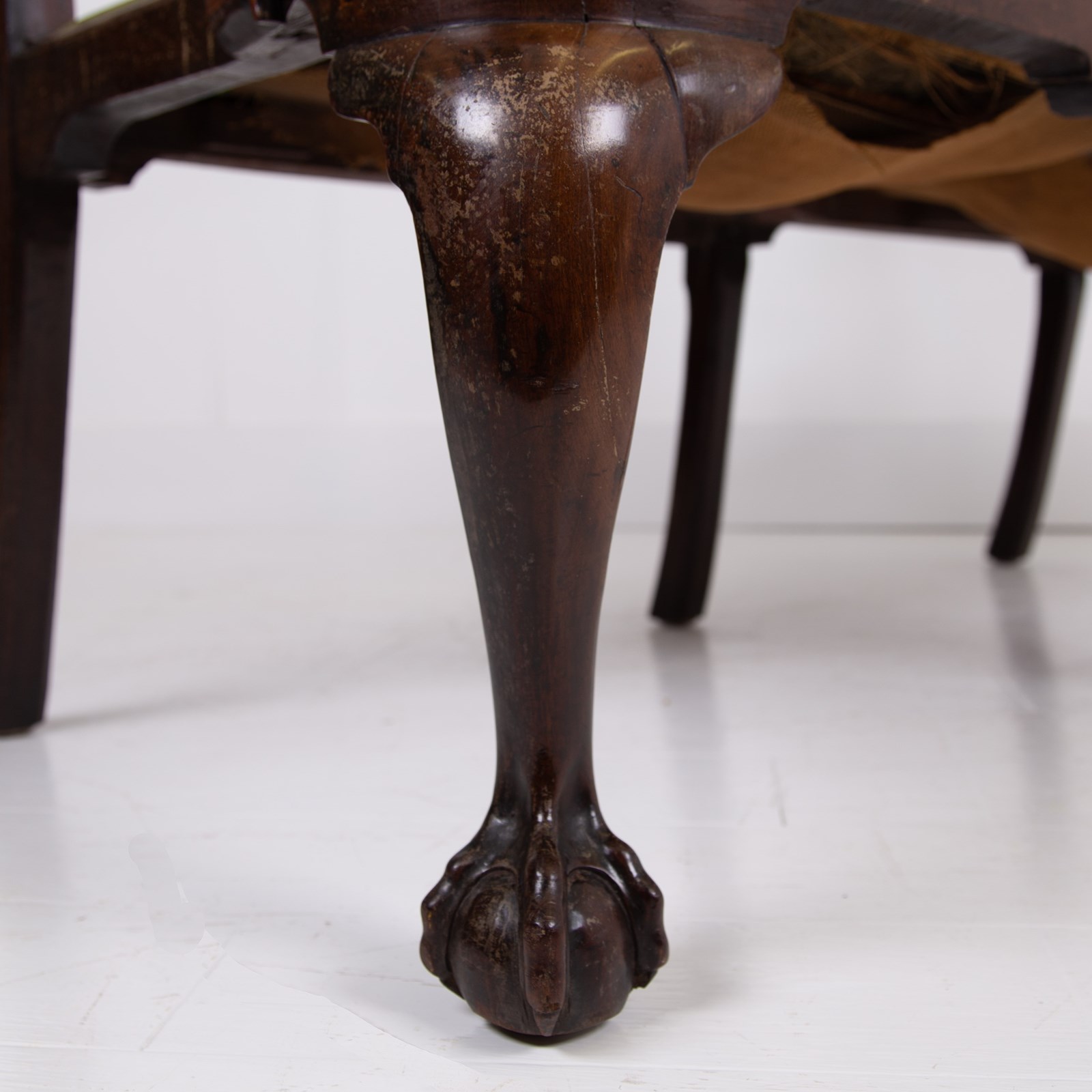 Sitting in sleepy “country house” condition we have scroll hand rests, lovely shaped dense cabriole forelegs, a well shaped back, ball and claw feet and a drop in seat with good depth. Mark our upholsterer would be able to fully reupholster the seat at a cost of £300 plus VAT - you would require 2-3 metres of fabric which we can assist in finding if you desire.