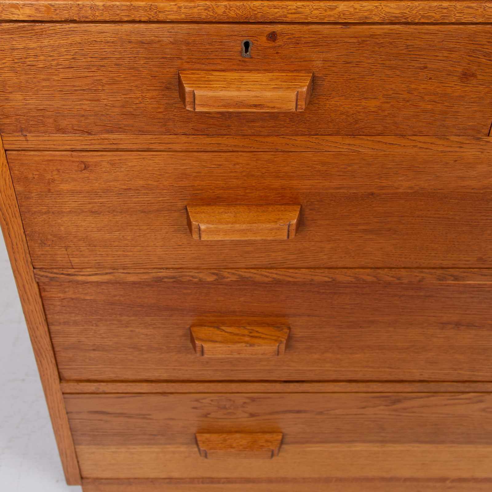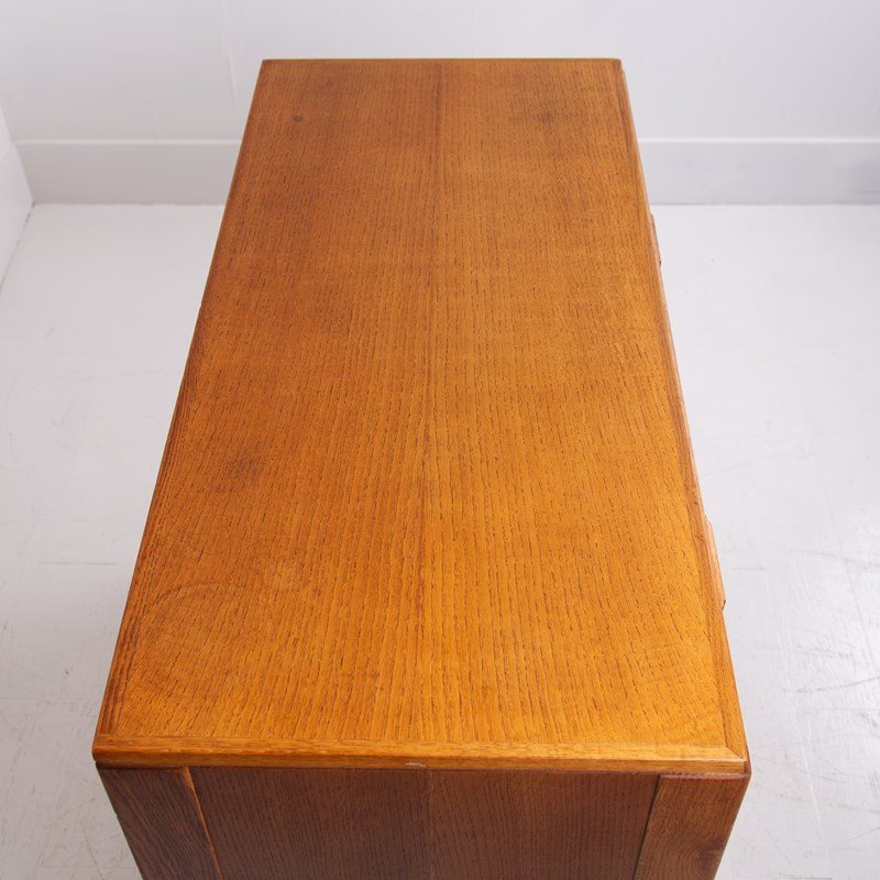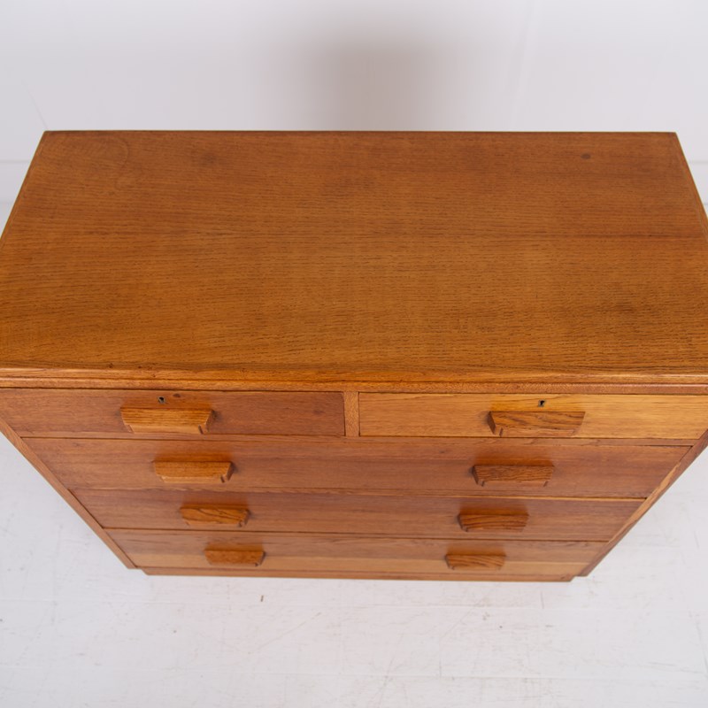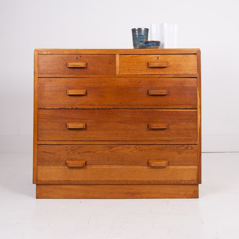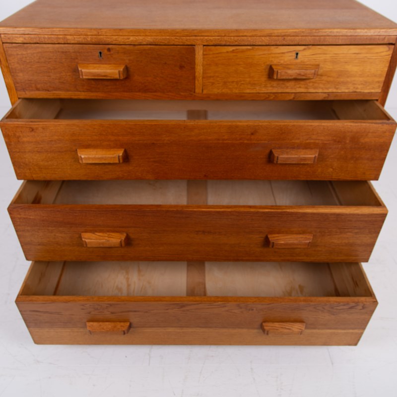 We have a super military issue English oak mid century chest of drawers of good scale. This one possesses the AM - Air Military mark to the back and is dated 1952. It would work in so many spaces throughout the home or commercial space.