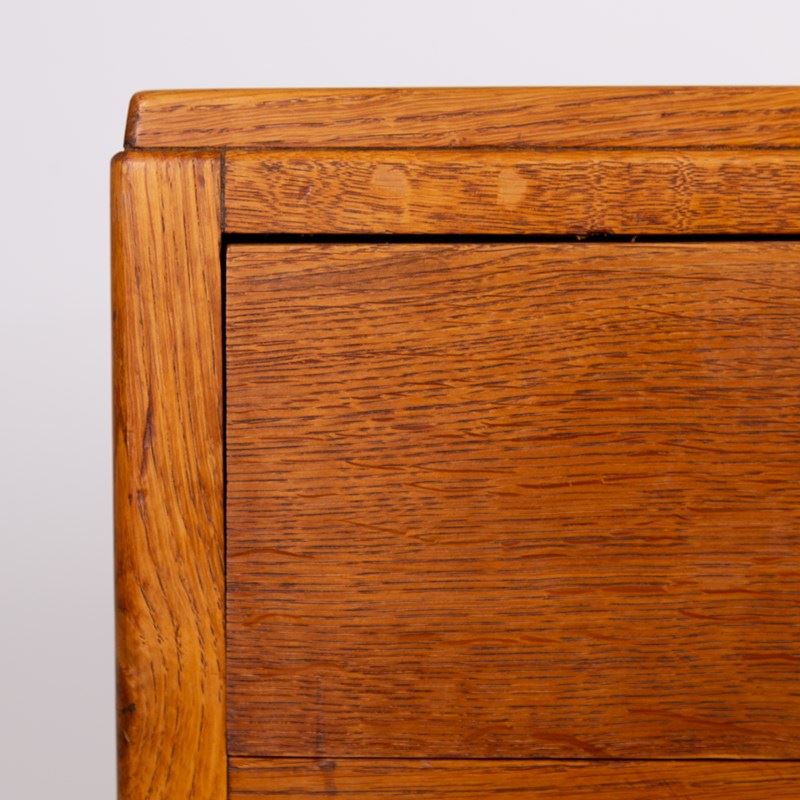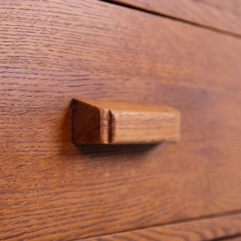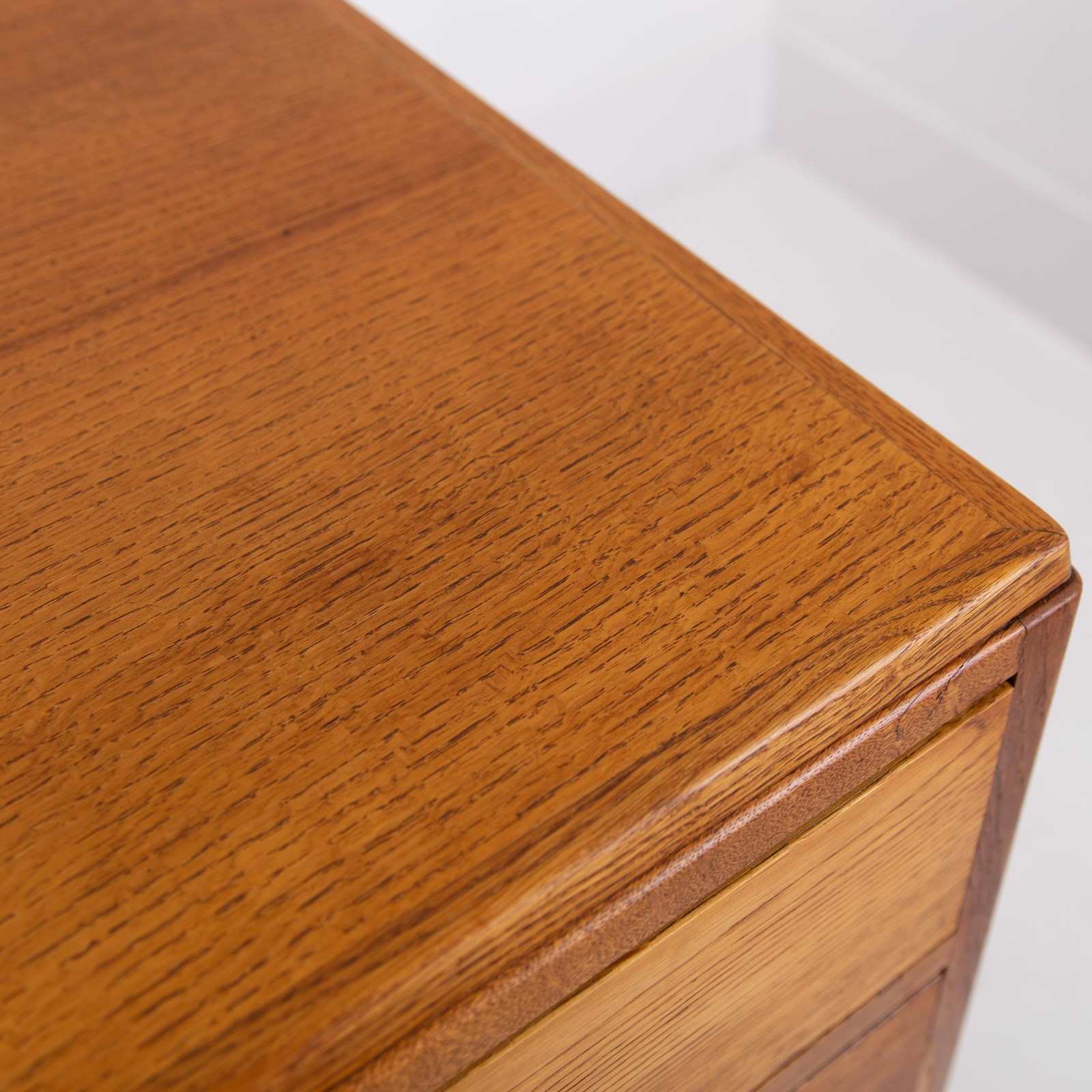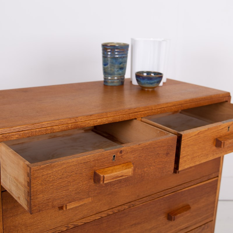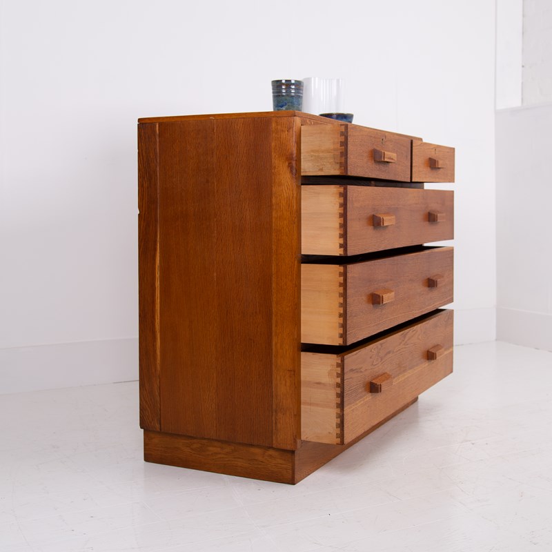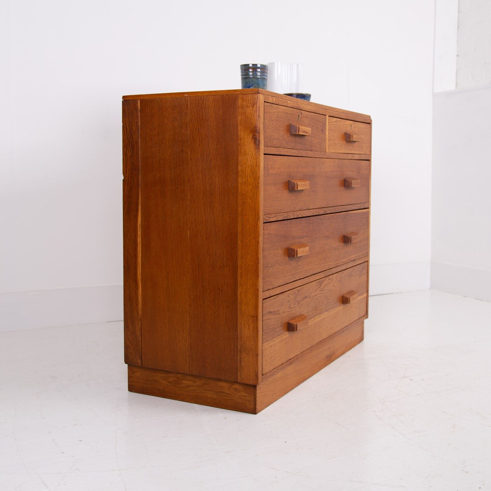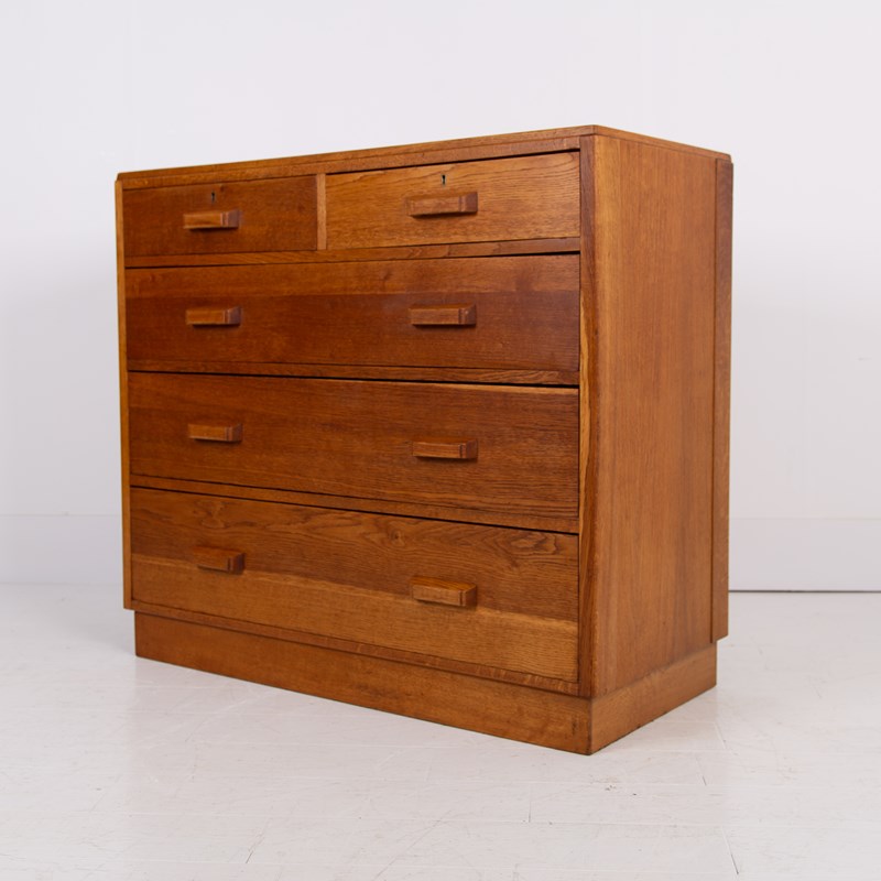 This design has been in favour by the military for a number of years - a flight of 3 deep drawers topped with 2 deep half drawers which works well for storage. This one sits in fine condition after a careful repolish in our workshop. We have the well shaped oak handles in situ and the inverted bottom plinth works well. Expect light day to day marks, nothing nasty.