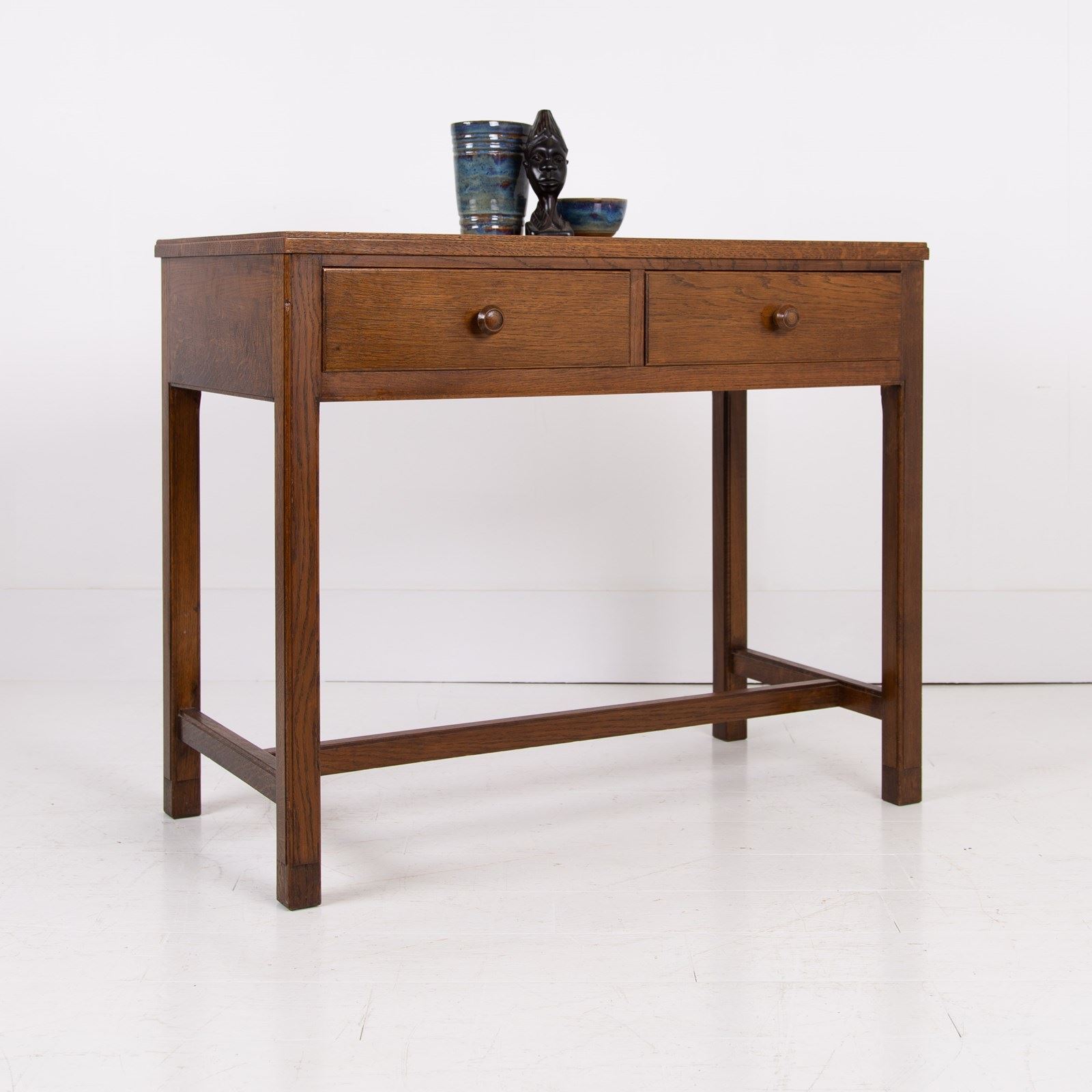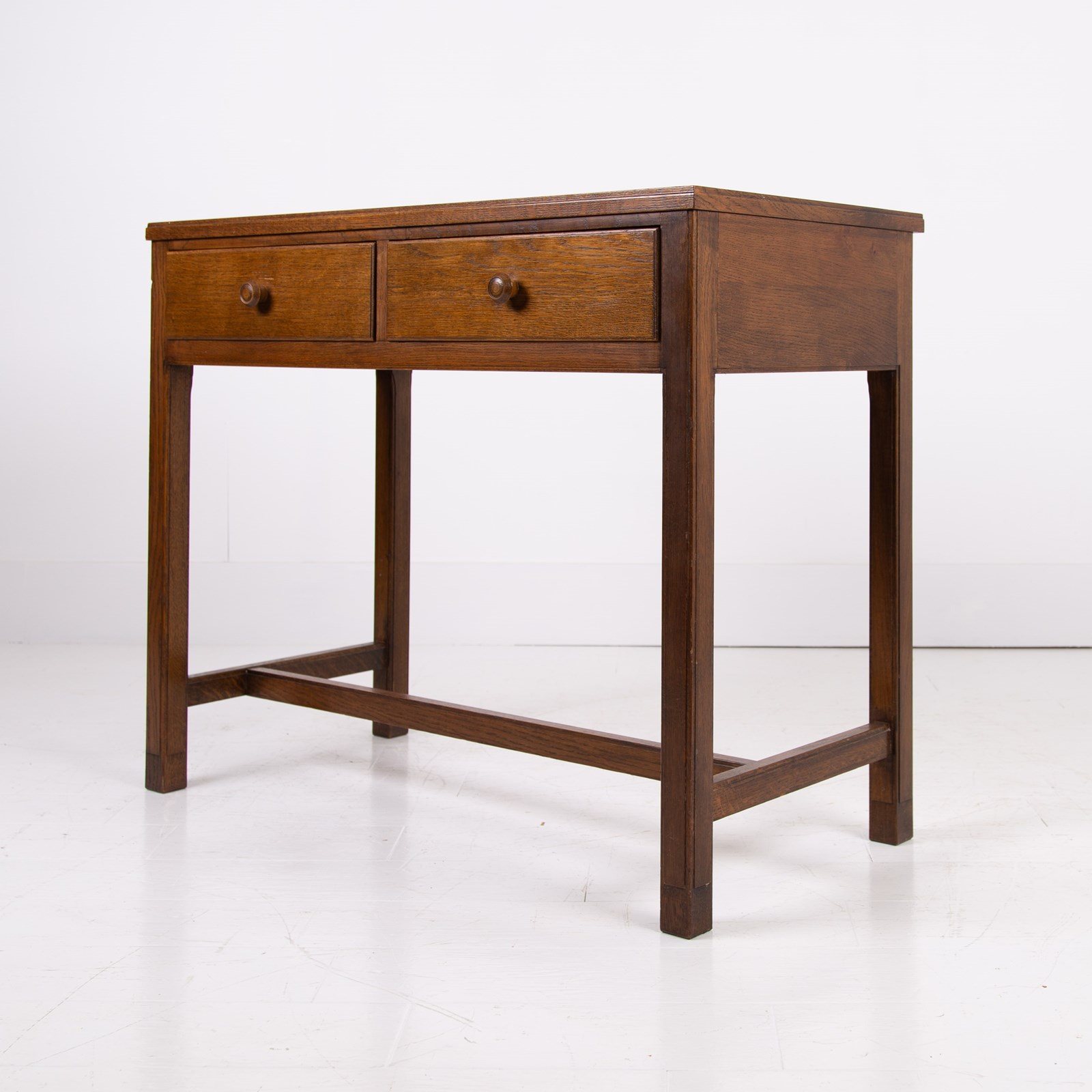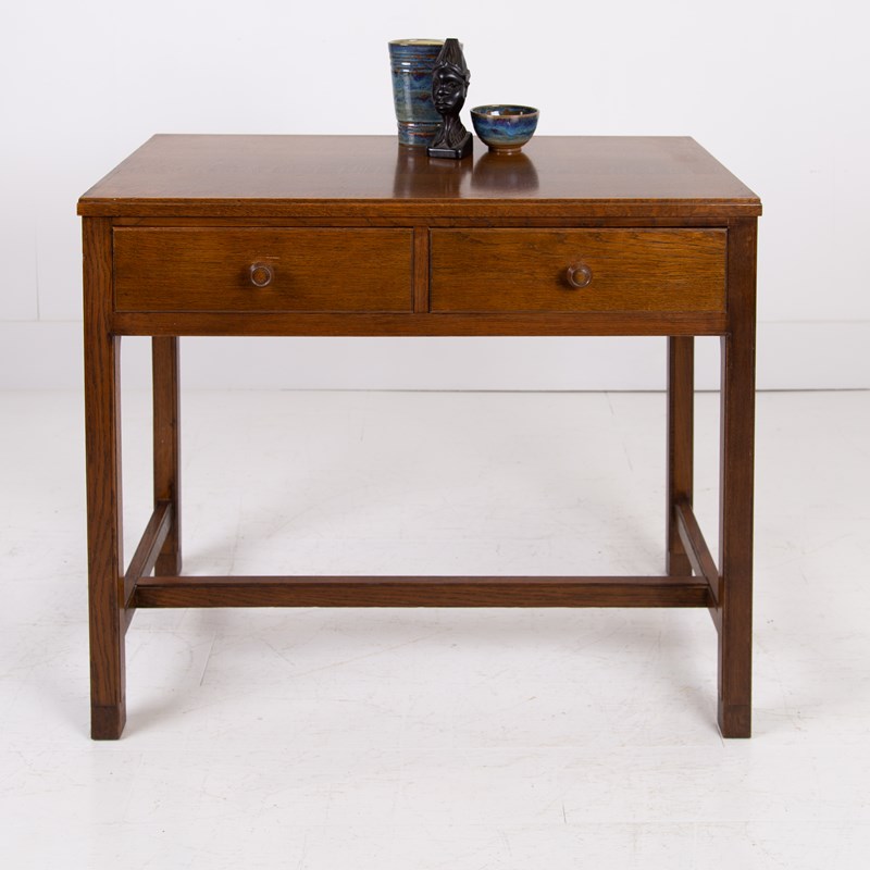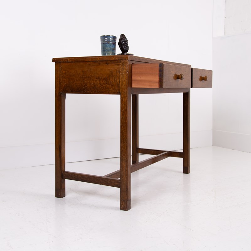 It’s a good, stylish Mid Century piece in English Cotswold School design, a good size with two drawers offering a generous workspace as a computer desk or writing table. In a well-toned oak, with a moulded top and chamfered legs united by a cross stretcher.