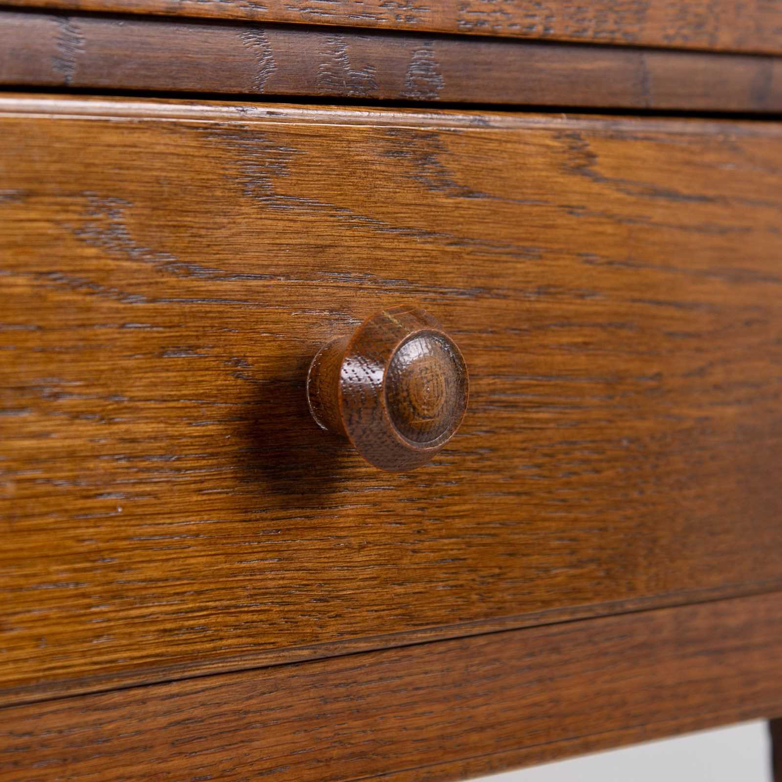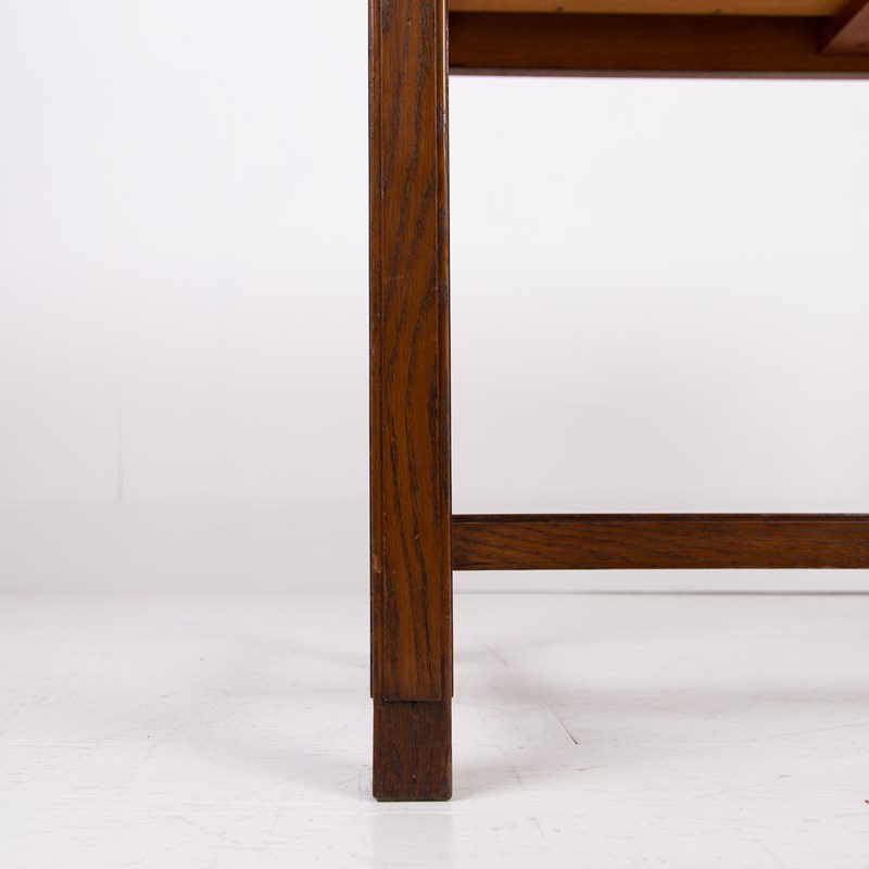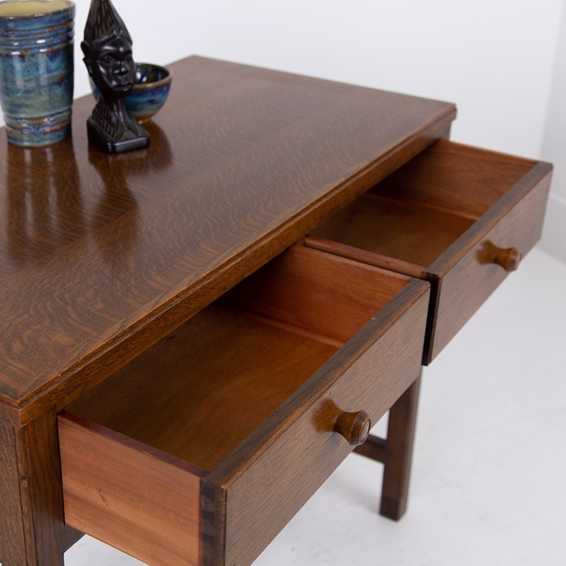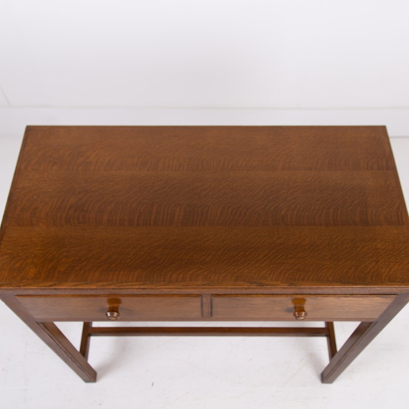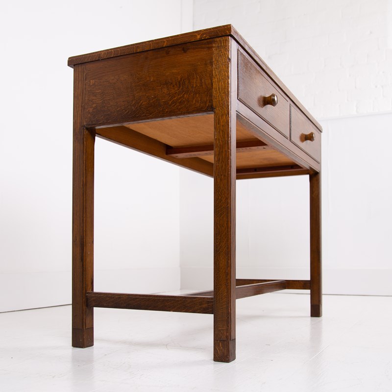It’s a good, stylish Mid Century piece in English Cotswold School design, a good size with two drawers offering a generous workspace as a computer desk or writing table. In a well-toned oak, with a moulded top and chamfered legs united by a cross stretcher.