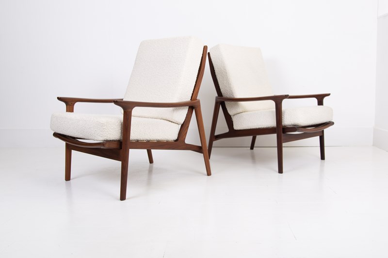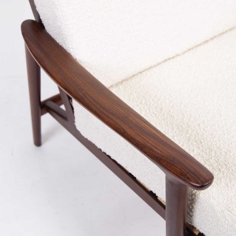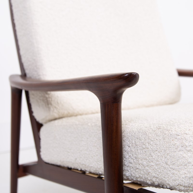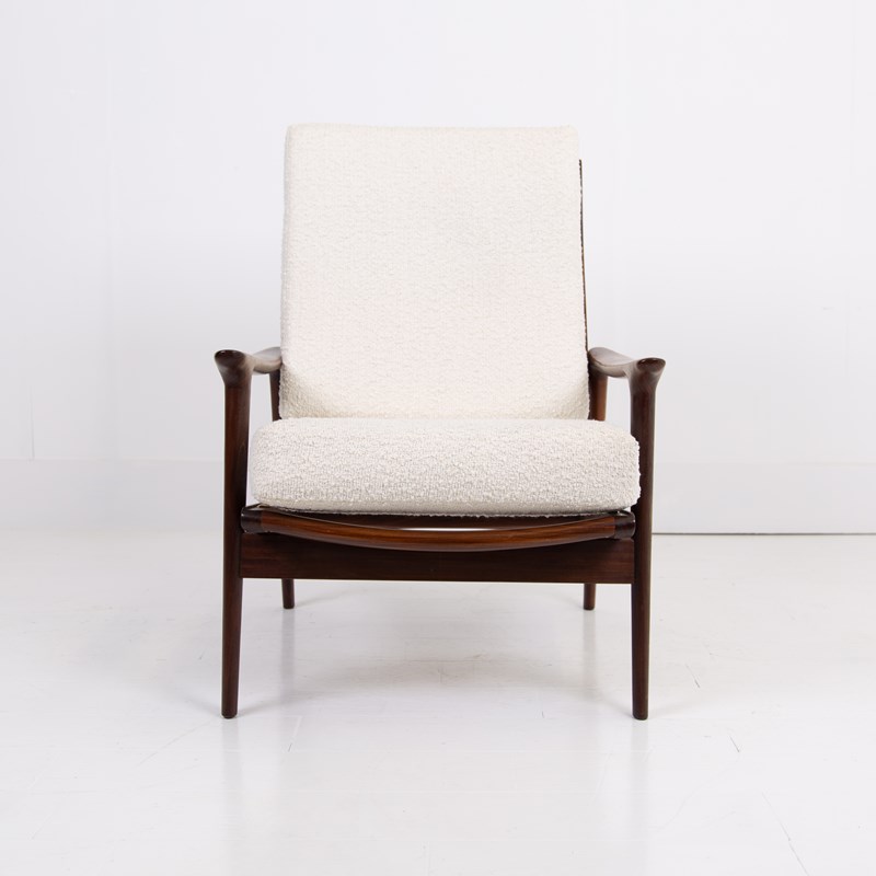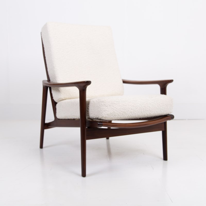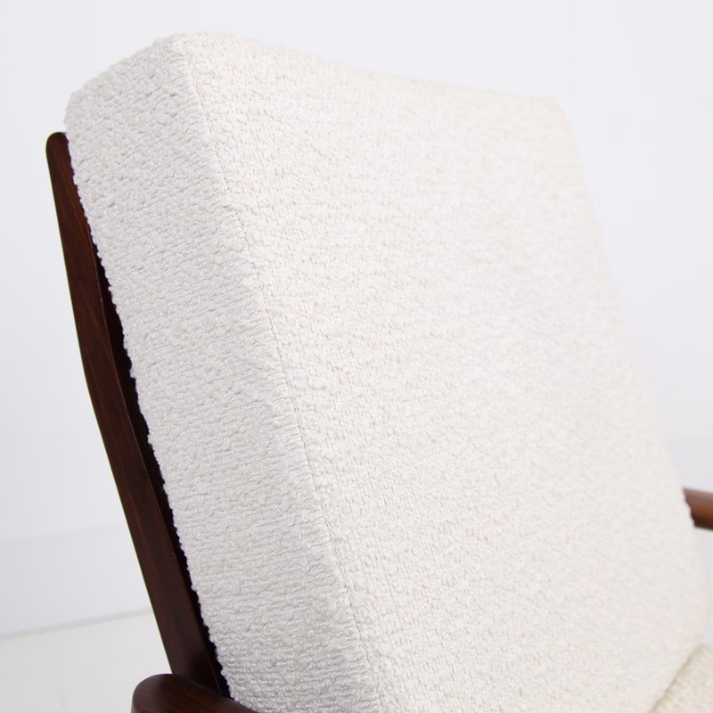 We have 2 of these which have been rewebbed and have new foam seat and back cushions covered in an ivory boucle weave fabric. The pair have been on display in a London show apartment so have had very, very little wear if any. The frames are deep in tone with no fade and sit well - no wobbles or splits to the frames or arms. Both armchairs are ready to place.