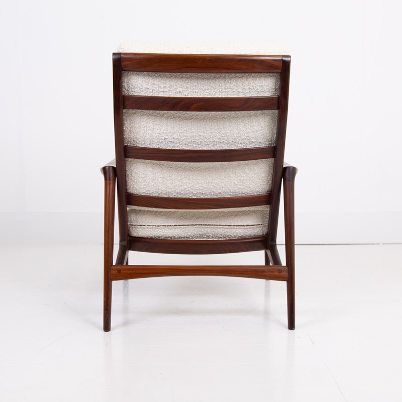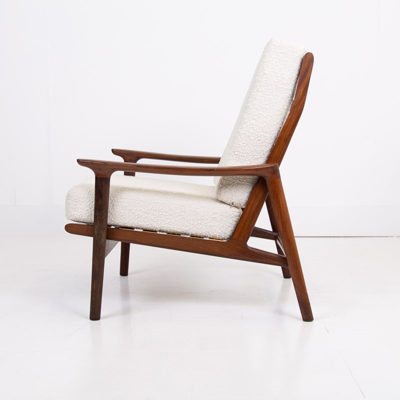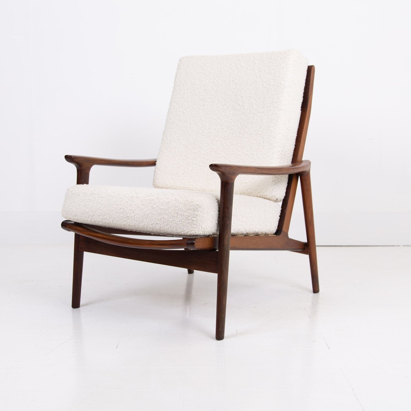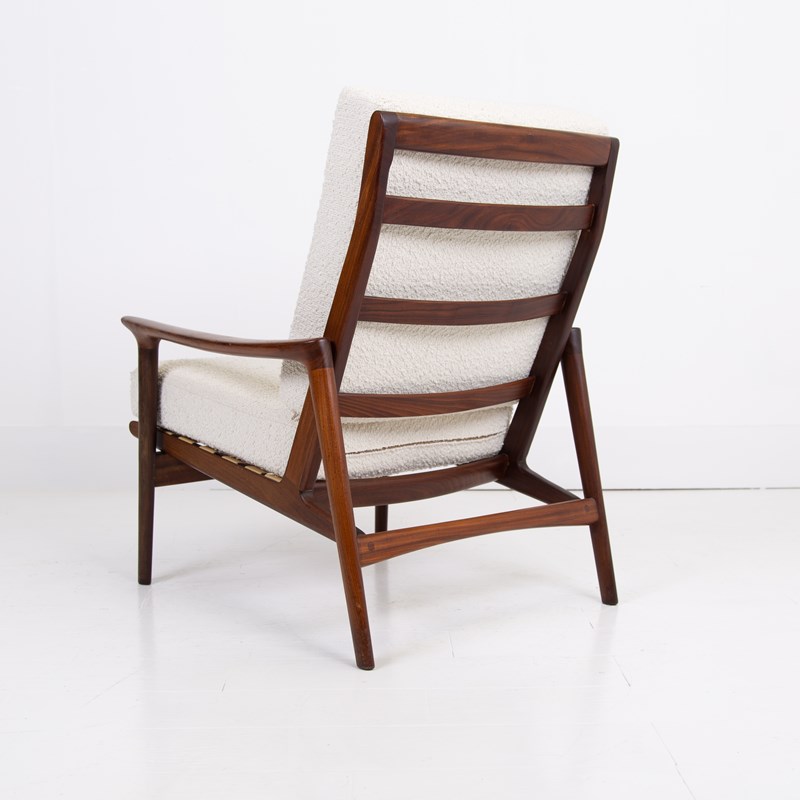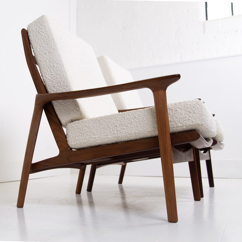 We have 2 of these which have been rewebbed and have new foam seat and back cushions covered in an ivory boucle weave fabric. The pair have been on display in a London show apartment so have had very, very little wear if any. The frames are deep in tone with no fade and sit well - no wobbles or splits to the frames or arms. Both armchairs are ready to place.