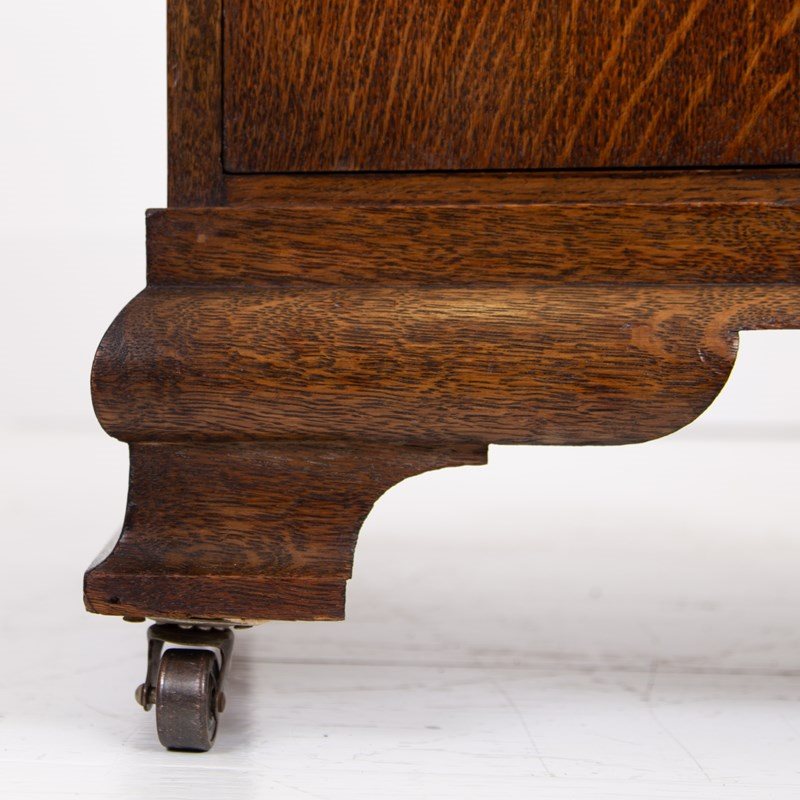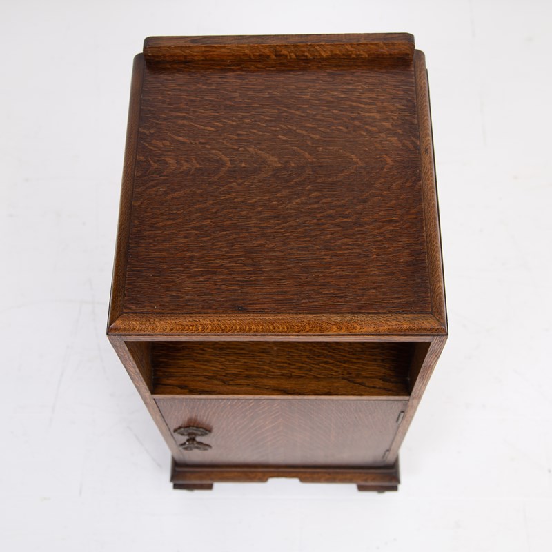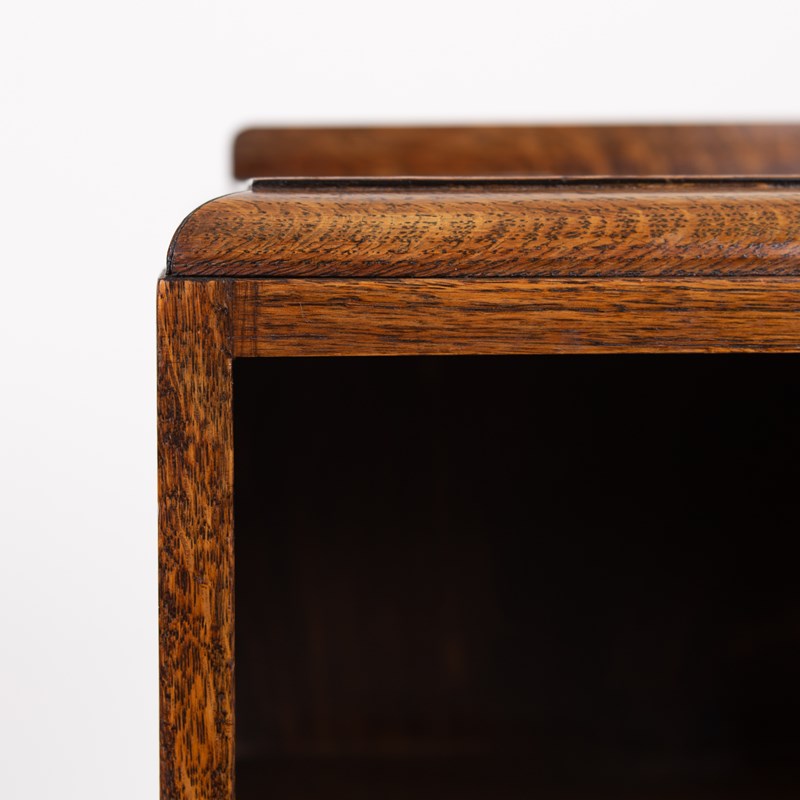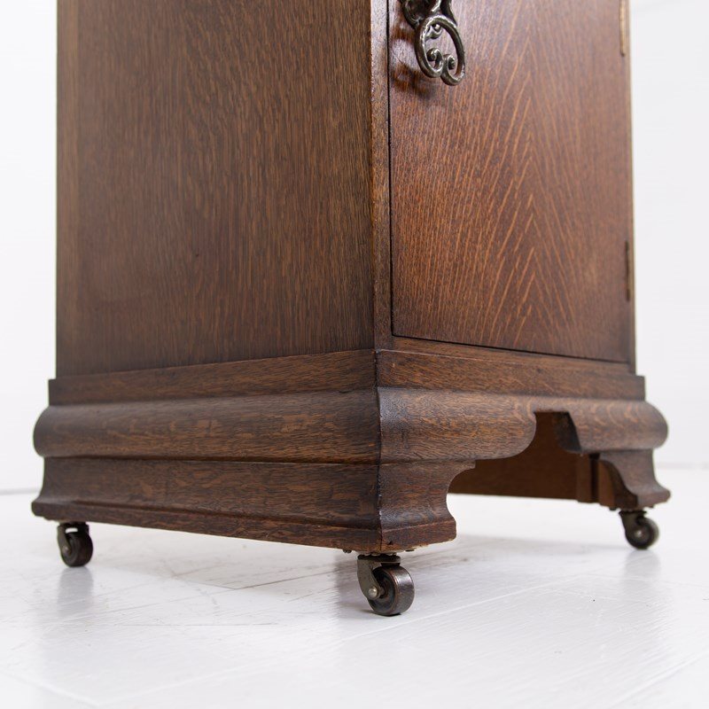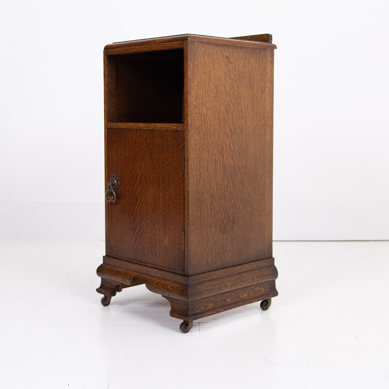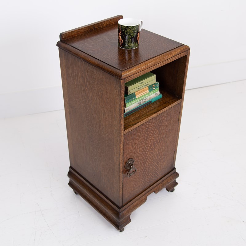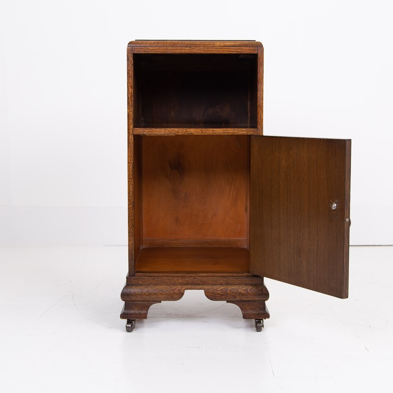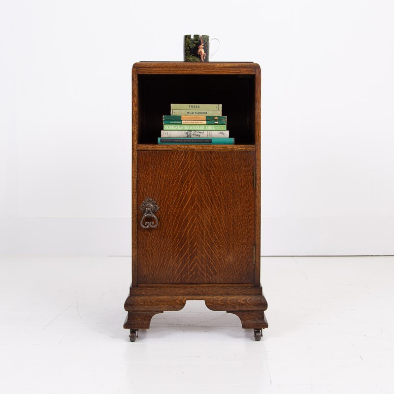 We have a good looking oak side cabinet C1930s which could be placed in the bedroom, small hallway or maybe the living room. The design is attractive on this one - we have original iron castors sitting under the ogee style bracket feet on which a single cupboard sits with an open space above this, with the top having a small upstand. The cabinet also benefits from a glass top if required…