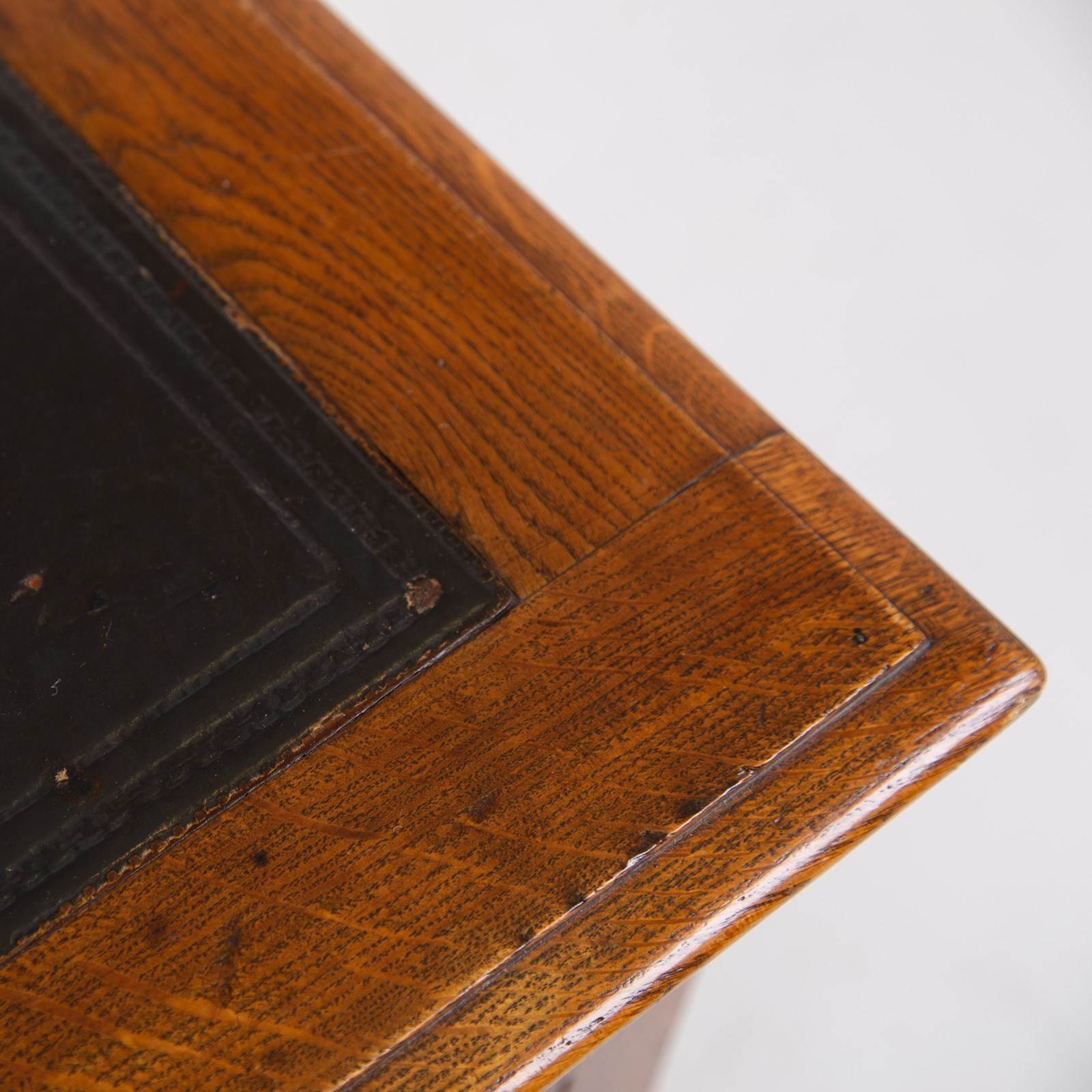 It's certainly a handsome little desk with its well shaped oak feet, tooled leather insert top, decorative drawer fronts, panelled sides and back and the overall scale. We also have a working lock and key to the long drawer. Condition is good with sensible historic wear and we have cleaned and ensured the desk is ready for placing. No makers mark but very much Angus of London in quality.