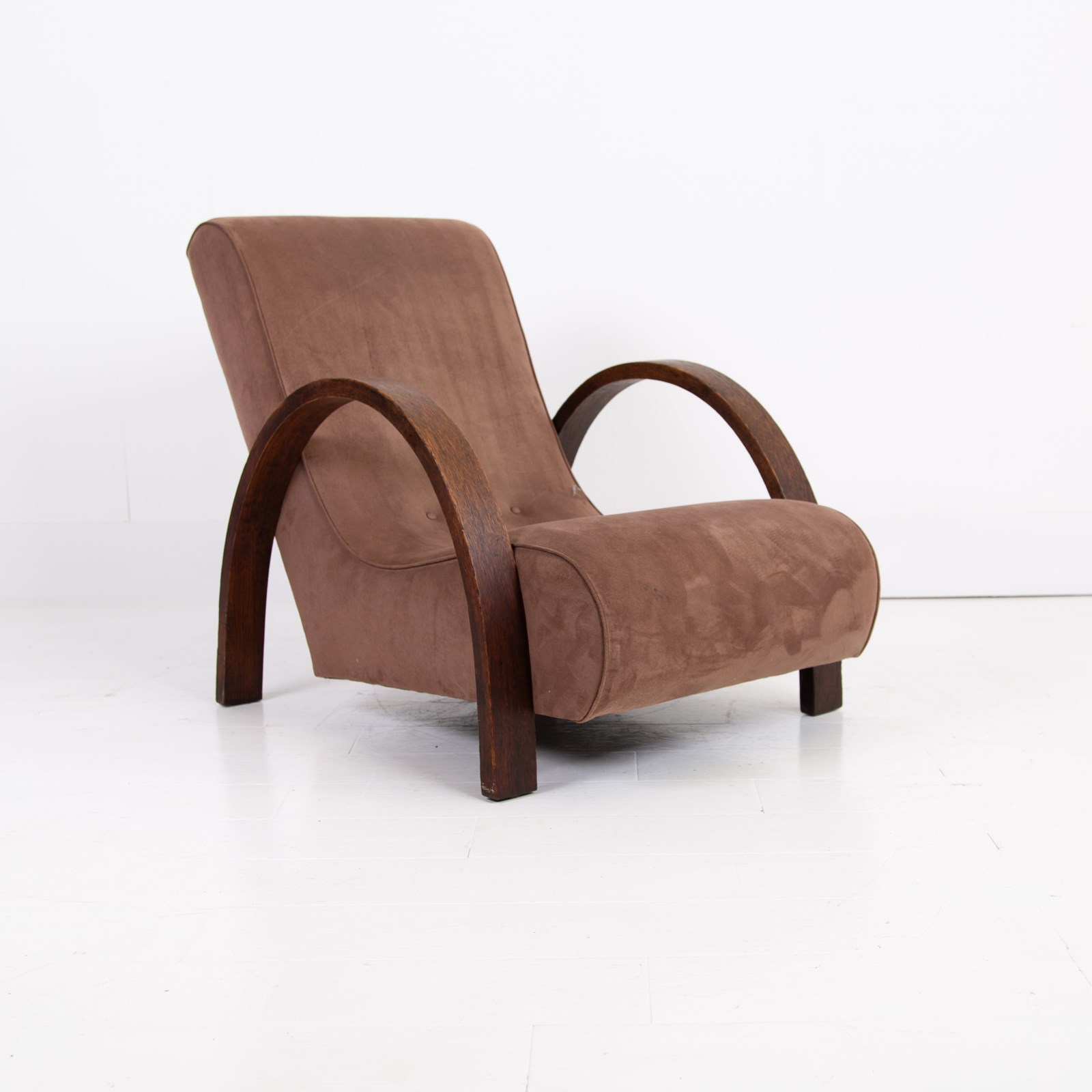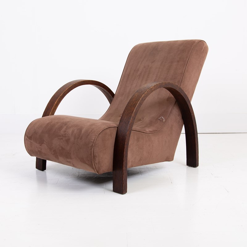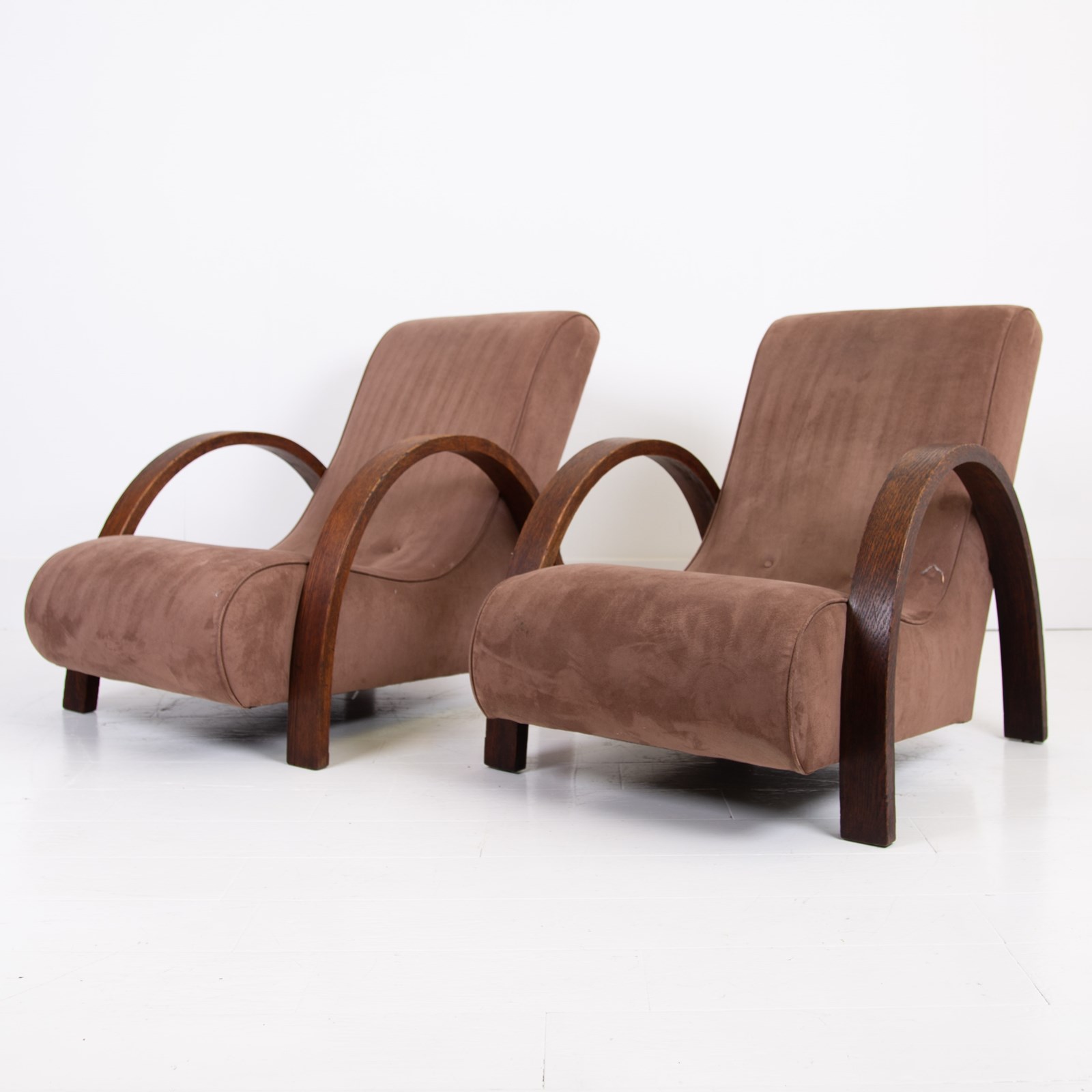 Both armchairs with those great looking sweeping deco inspired oak bentwood arms are in similar condition - the current fabric a milk chocolate toned faux suede is usable if you want with wear and with small rips in both. We have lightly waxed the oak and they sit firm with tight joints etc.