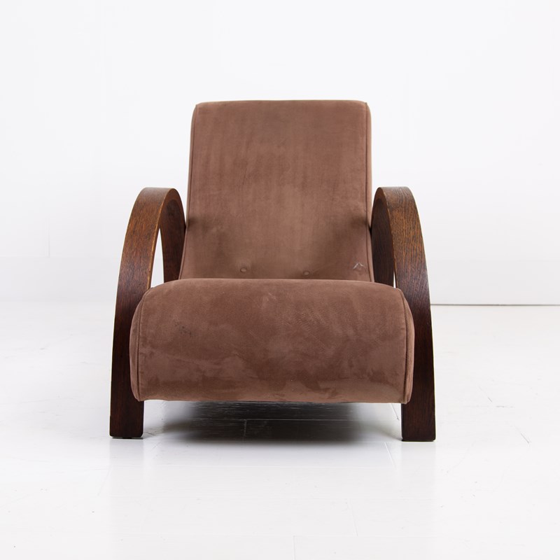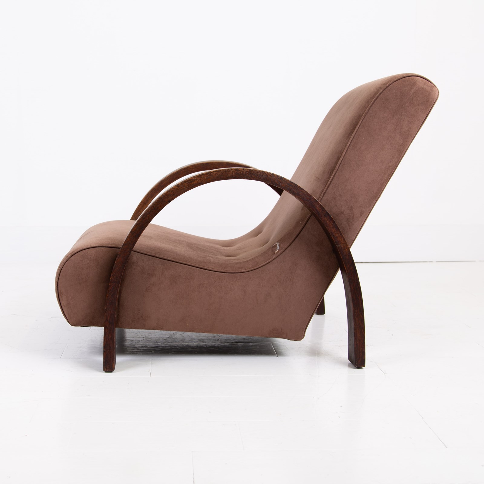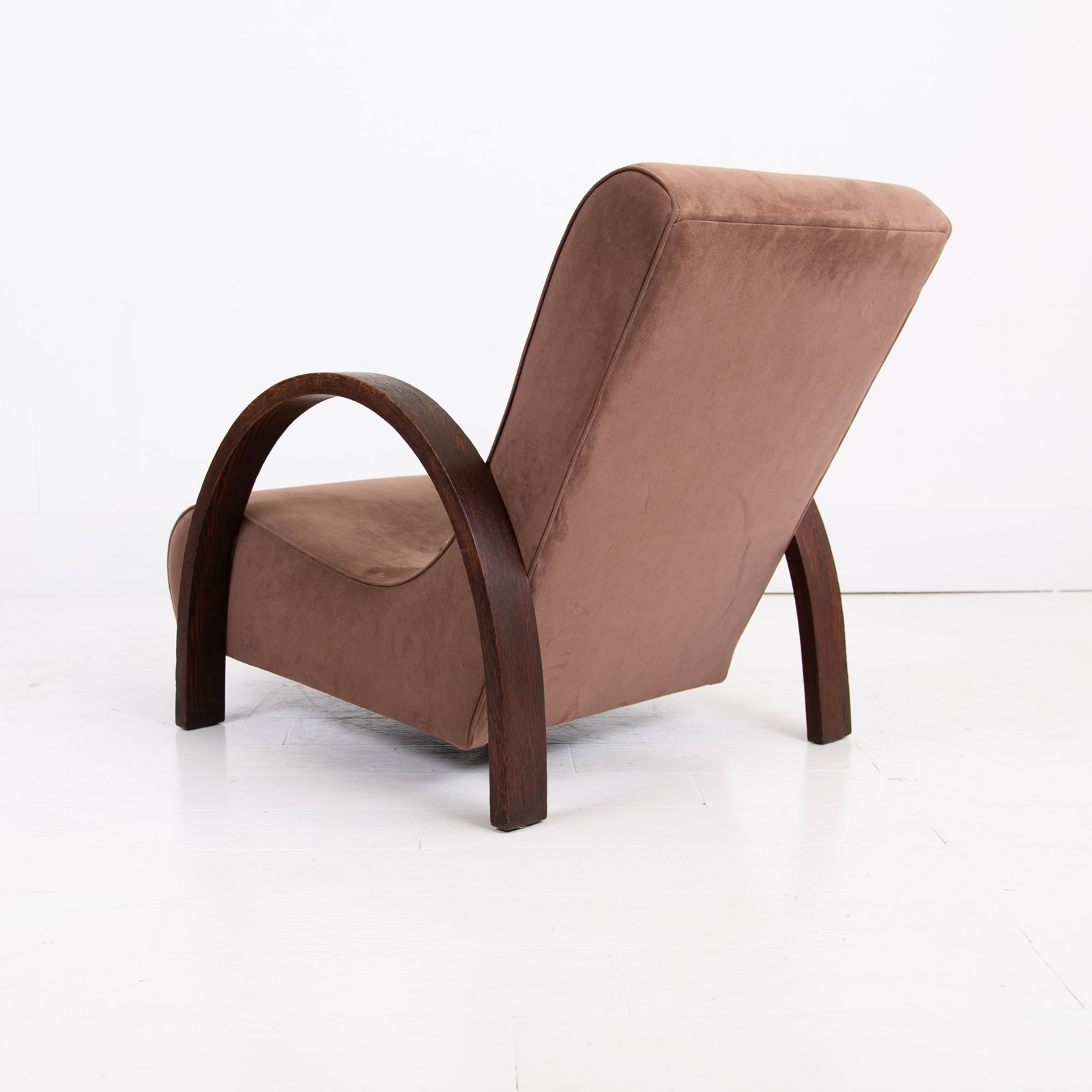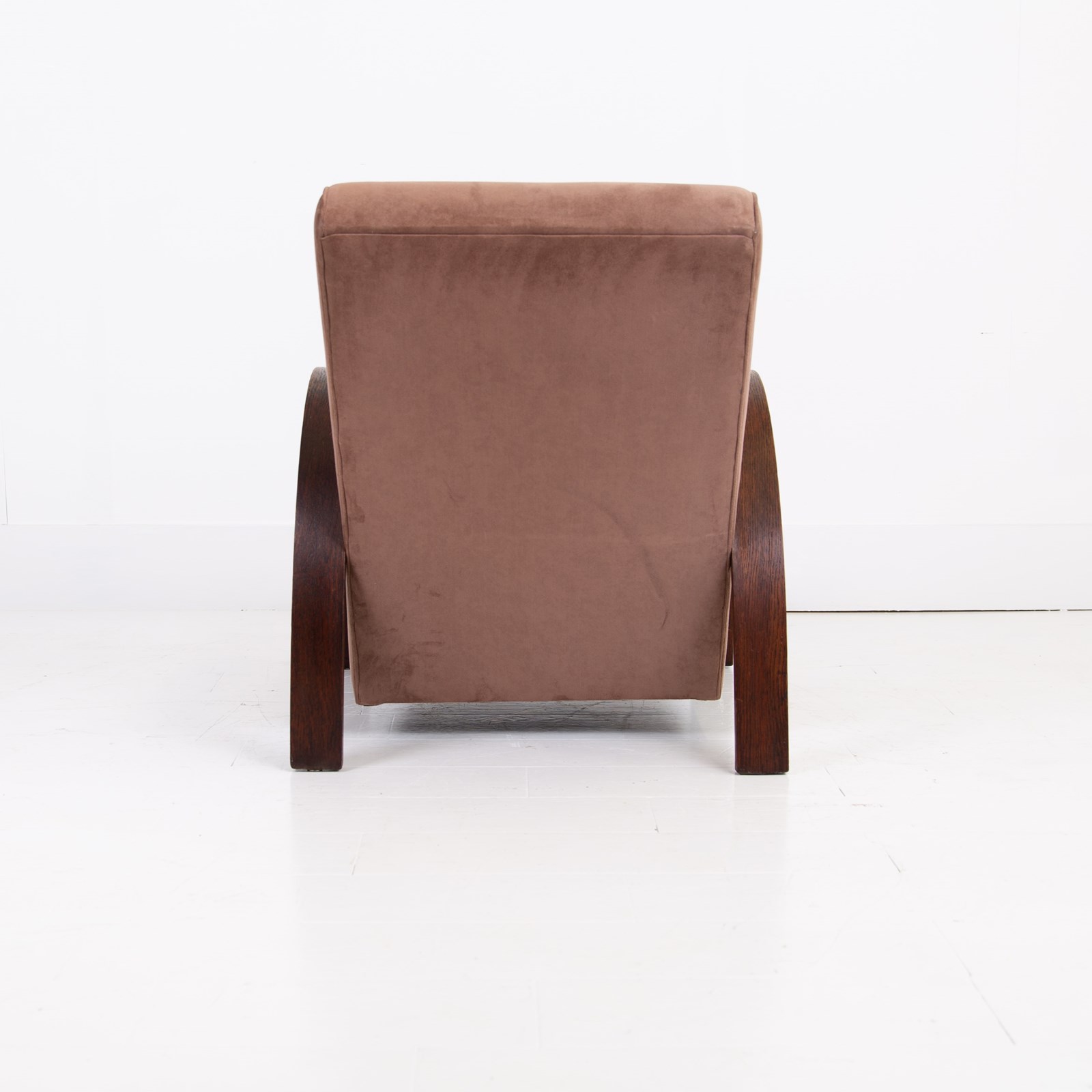 Both armchairs with those great looking sweeping deco inspired oak bentwood arms are in similar condition - the current fabric a milk chocolate toned faux suede is usable if you want with wear and with small rips in both. We have lightly waxed the oak and they sit firm with tight joints etc.