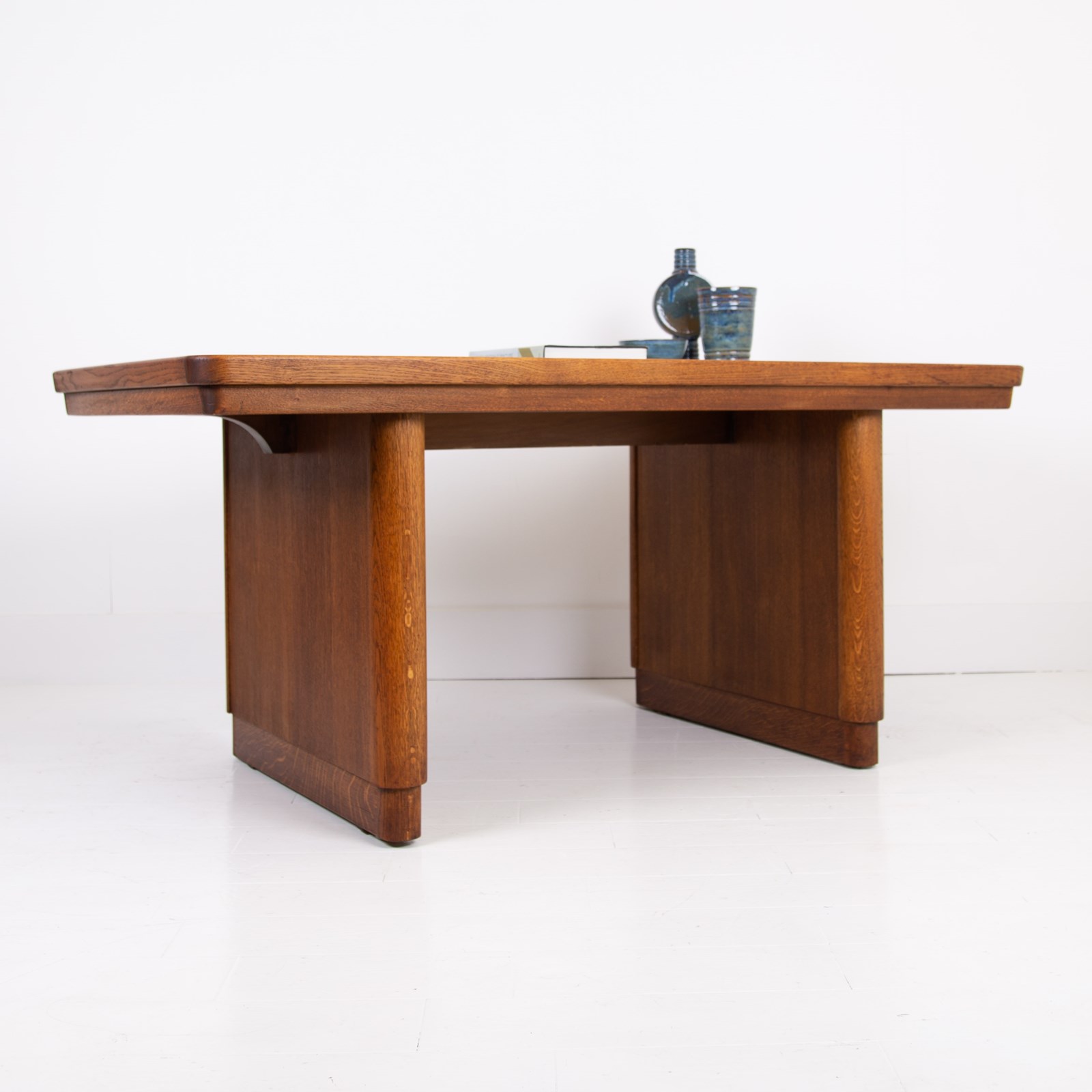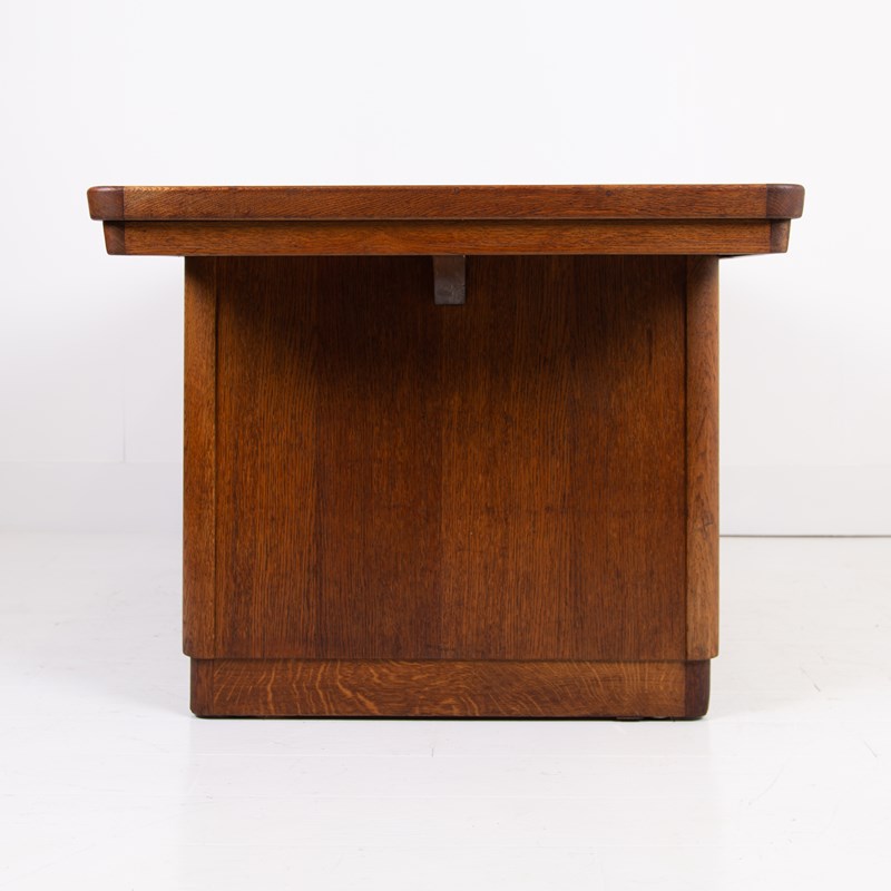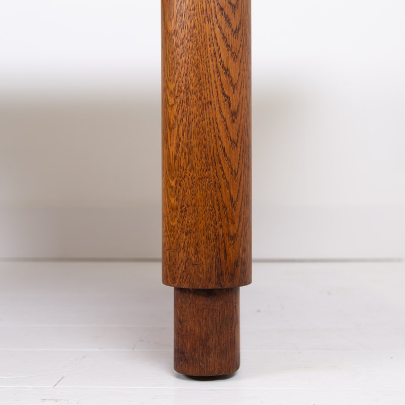 Liking this one an awful lot - the top with its green leather tool edged surface which sits inside a decent well shaped oak surround, those highly distinctive oak supports and the little inverted base sitting under the supports make it so good looking and practical with sizable space for working.