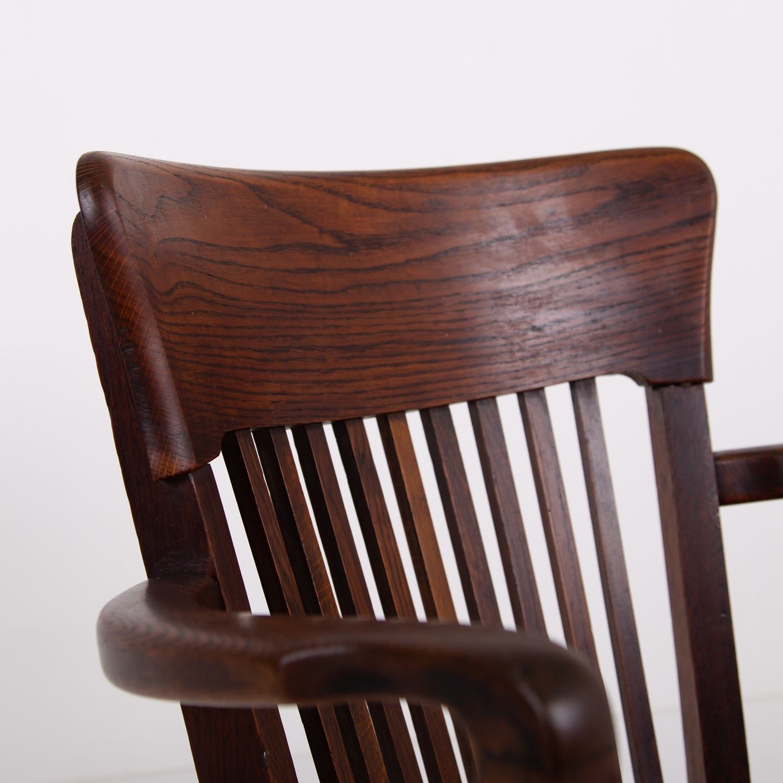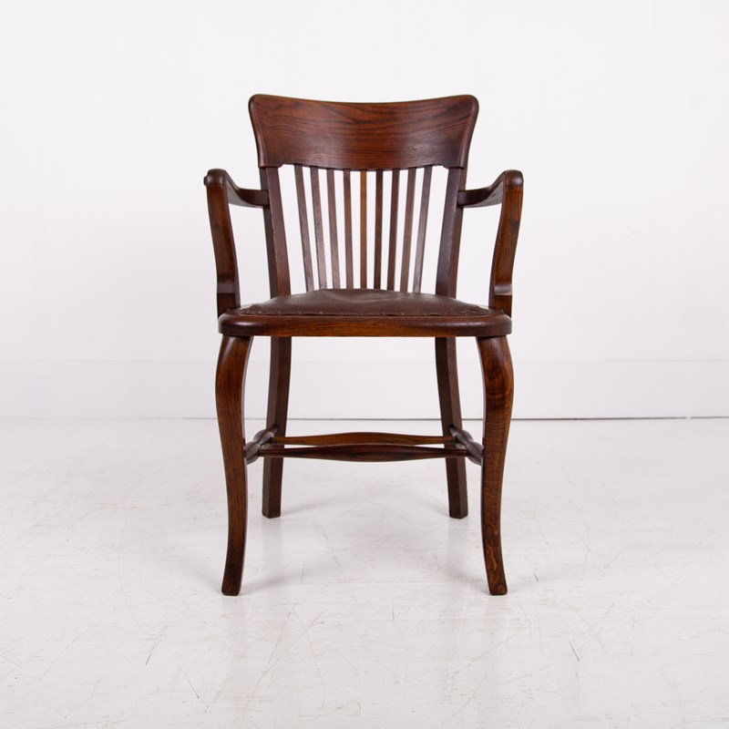We have a good looking English oak desk chair C1910, very likely by Cookes of Finsbury - “Cooke’s of Finsbury was a London-based manufacturer established in 1885, renowned for high-quality Edwardian and Art Deco office furniture, particularly in English oak and walnut.”
