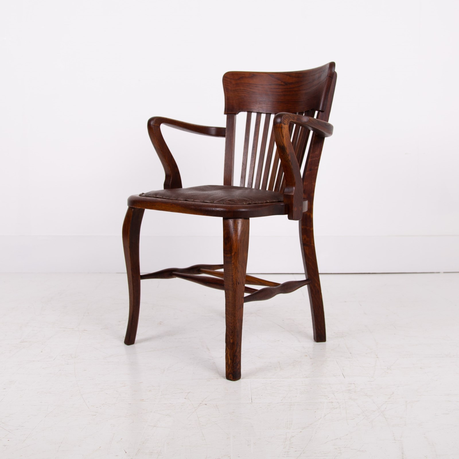 Sitting in a highly desirable original condition we have a good looking oak frame with pleasing on the eye shaped arms, double stretcher, deep back rail and slatted back. Our workshop has carefully lifted the original grain Rexine seat, replaced the tired webbing with new webbing and carefully refitted the Rexine with the original brass aged studs. If you wish for a new leather seat our upholsterer would be happy to oblige at a cost of £80 plus VAT plus leather - we do have some colours in stock.