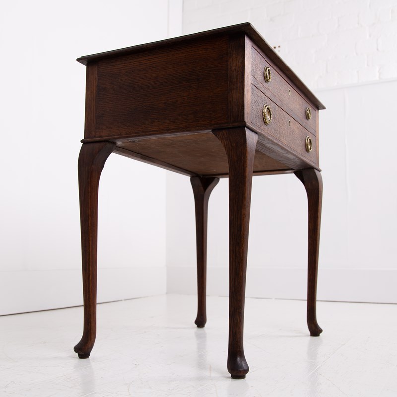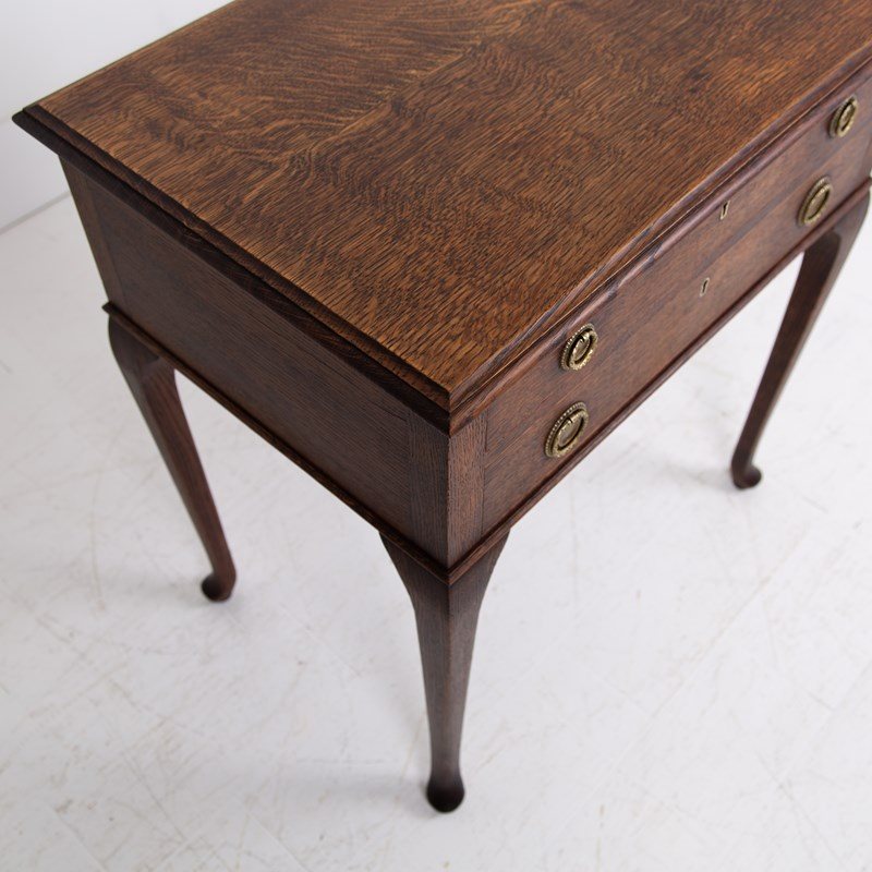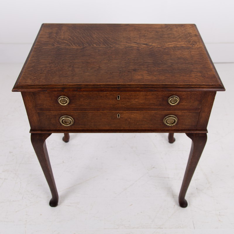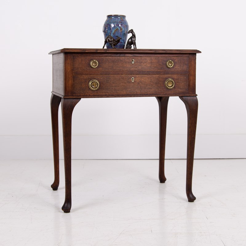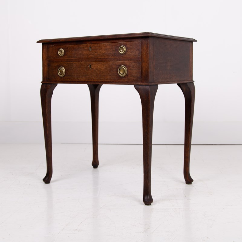 A rather handsome looking 2 drawer solid English oak side table of sensible scale and good quality. Enjoying the look of this one with its slender shapely legs, well grained over sailing top and pretty round handles.