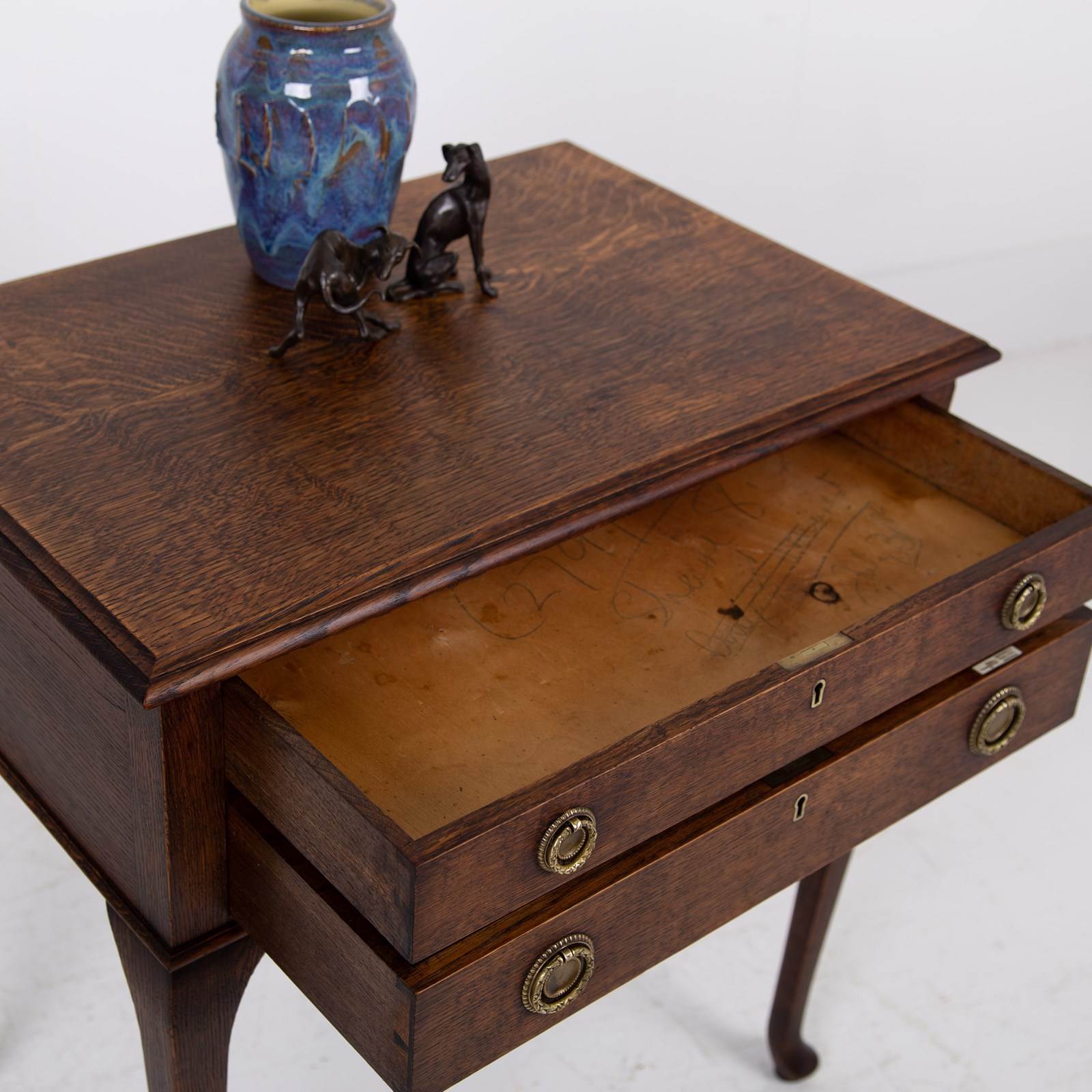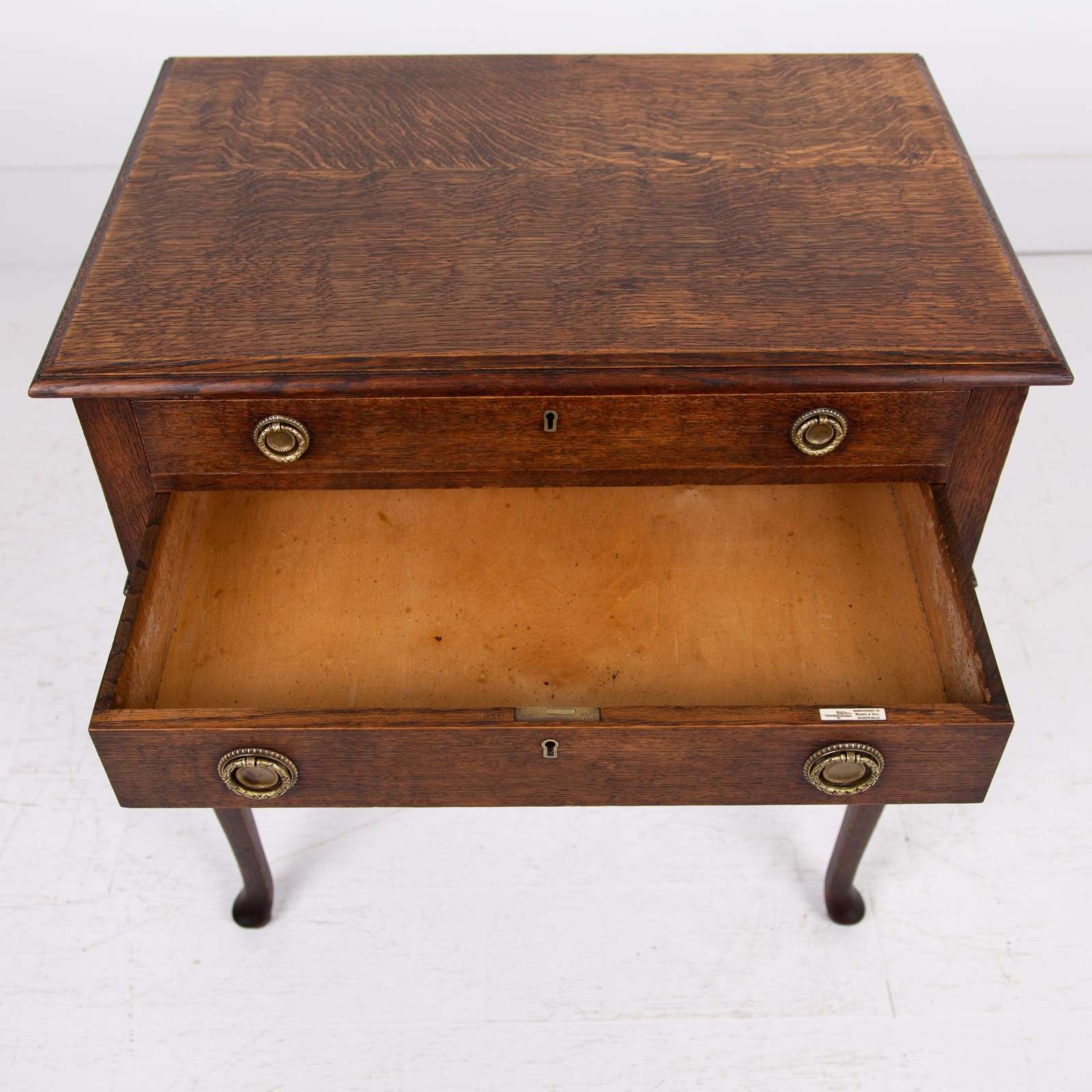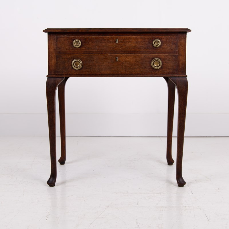 A rather handsome looking 2 drawer solid English oak side table of sensible scale and good quality. Enjoying the look of this one with its slender shapely legs, well grained over sailing top and pretty round handles.