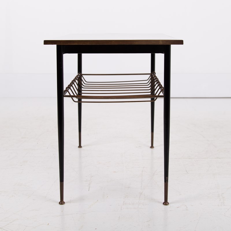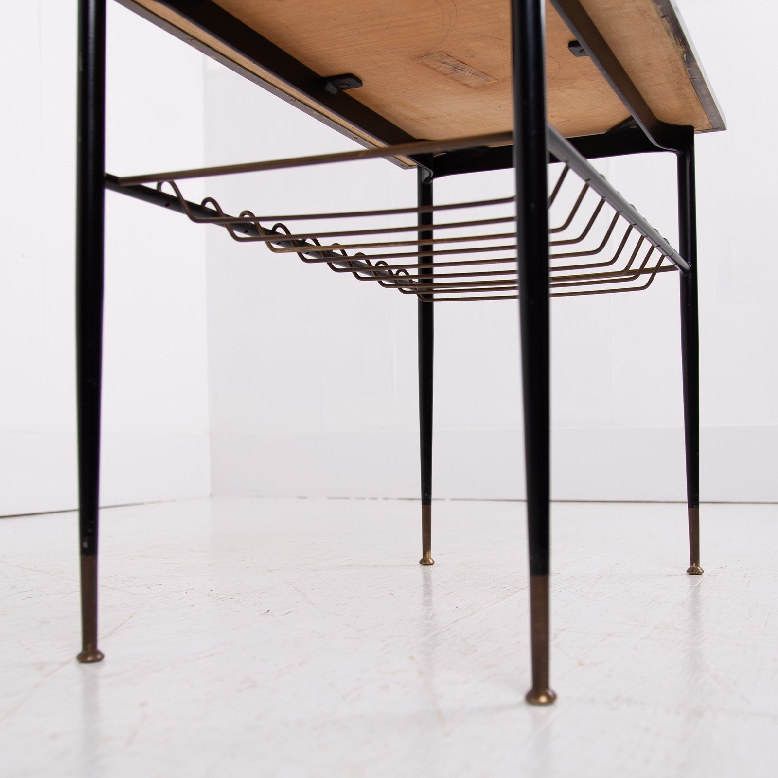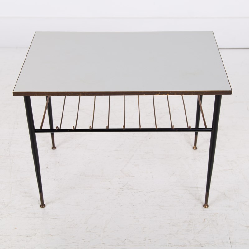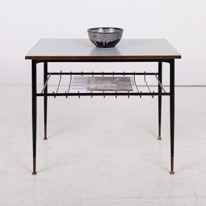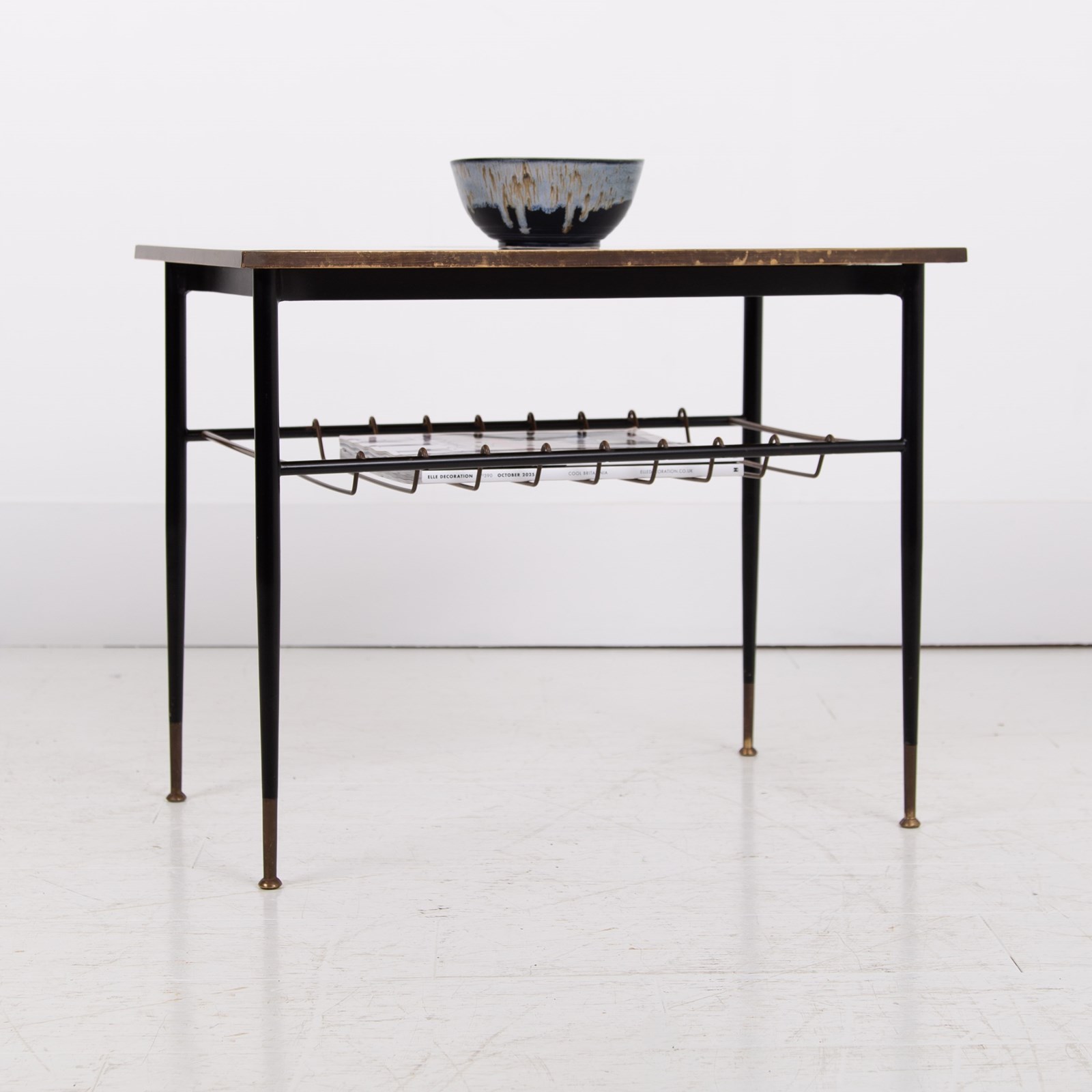 An extremely stylish and rare vintage coffee/side table of super quality. This one dates from the 1960-70’s and is beautifully made from brass, with its pale grey with white abstract patterned Formica top and brass magazine rack underneath (the label beneath reads “Special Top”. The frame is solid brass with black legs with the feet caps in natural solid brass finish and are nicely tarnished. This one is in a rather excellent condition for its age with light day to day marks. The quality is truly evident throughout.