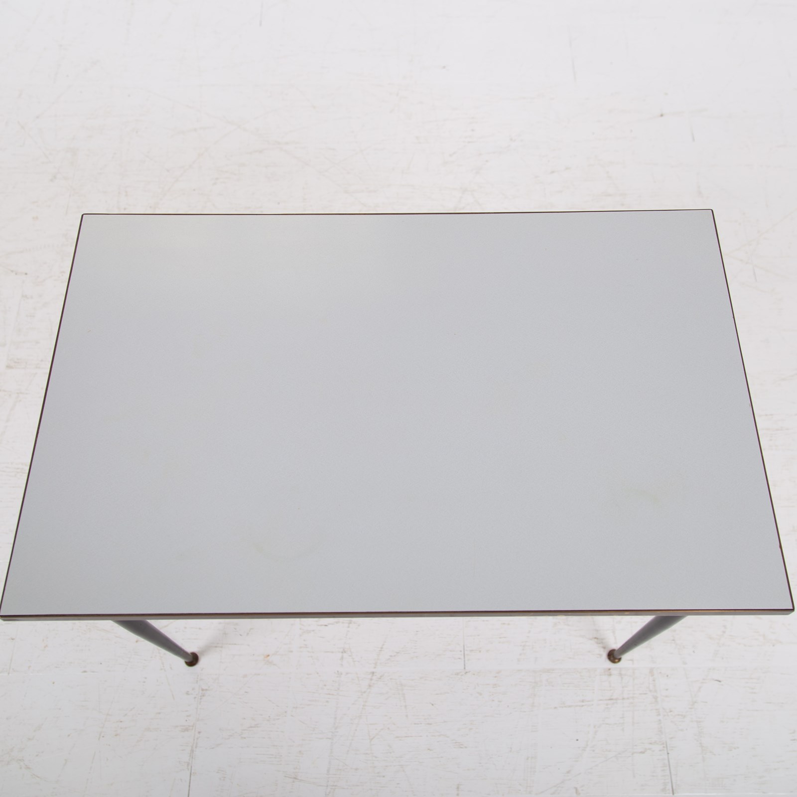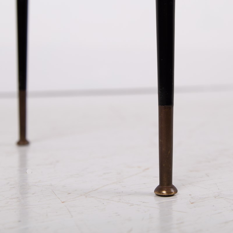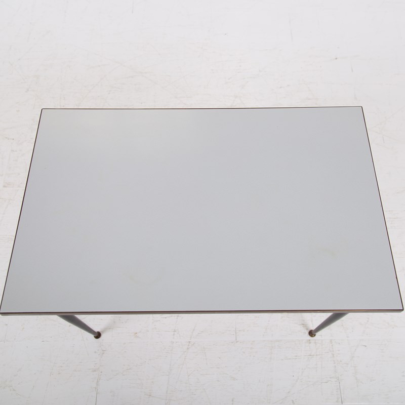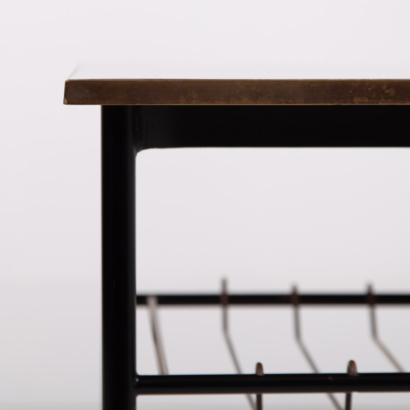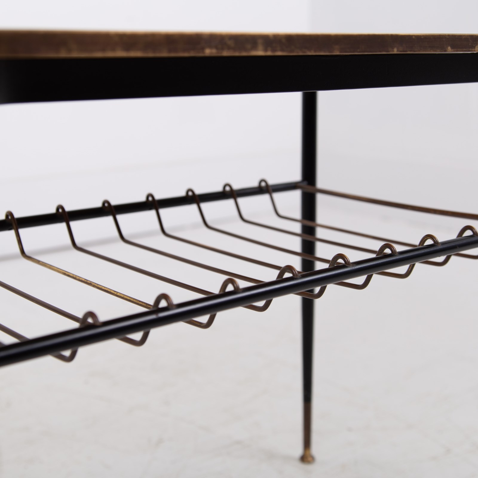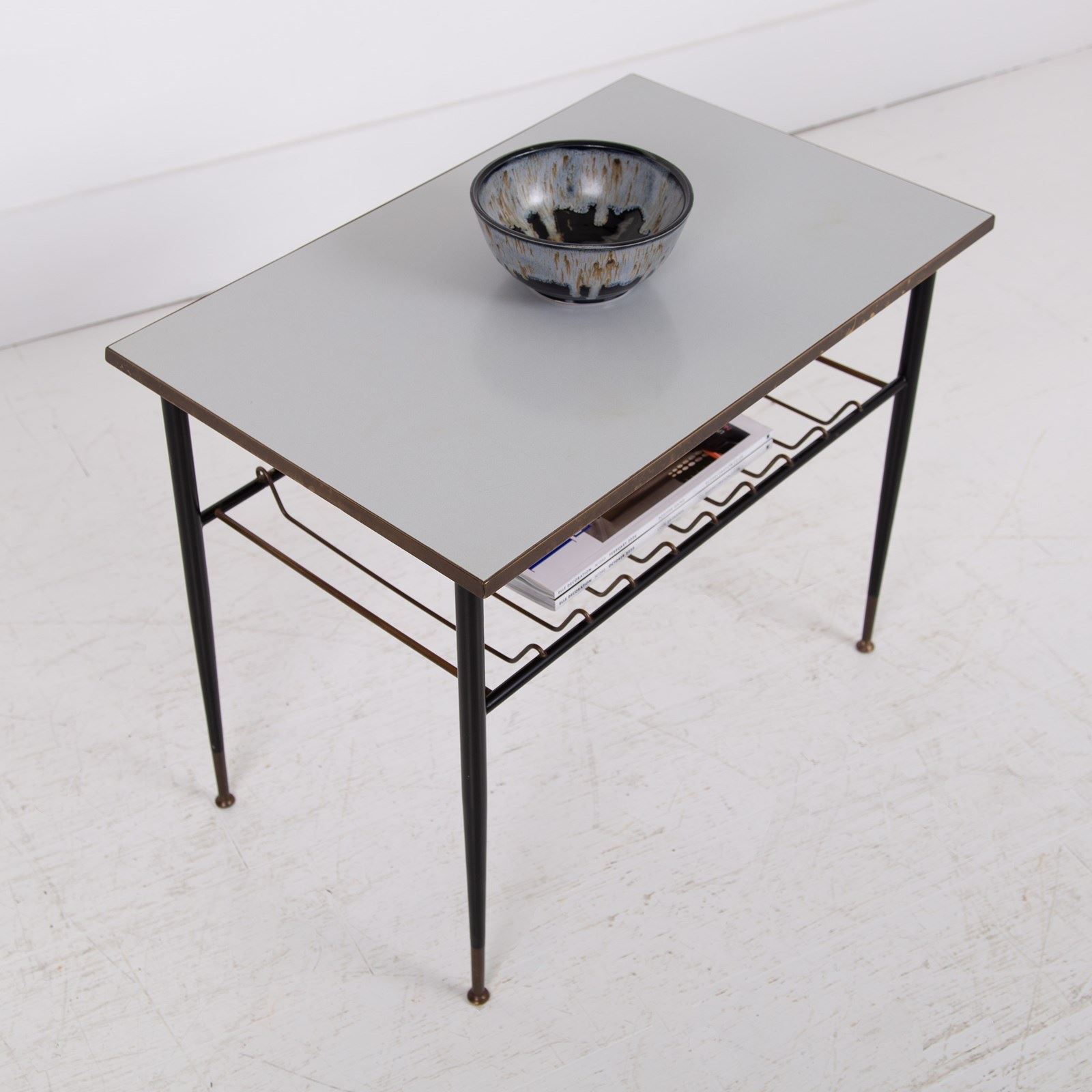 An extremely stylish and rare vintage coffee/side table of super quality. This one dates from the 1960-70’s and is beautifully made from brass, with its pale grey with white abstract patterned Formica top and brass magazine rack underneath (the label beneath reads “Special Top”. The frame is solid brass with black legs with the feet caps in natural solid brass finish and are nicely tarnished. This one is in a rather excellent condition for its age with light day to day marks. The quality is truly evident throughout.