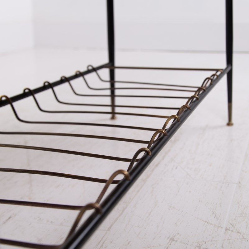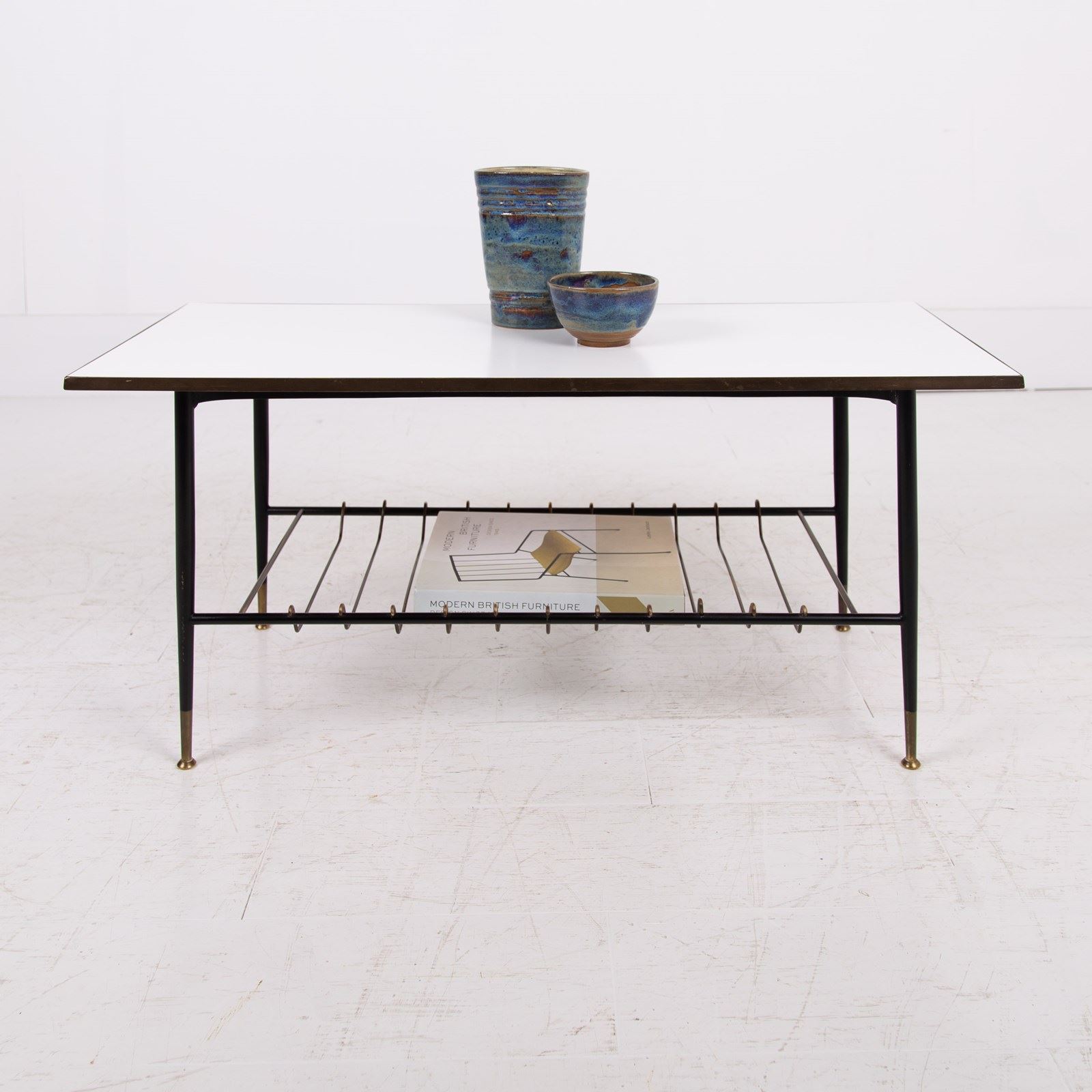 An extremely stylish and rare vintage coffee/side table of super quality. This one dates from the 1960-70’s and is beautifully made from brass, with its white Formica top and brass magazine rack underneath. The frame is solid brass with black legs with the feet caps in natural solid brass finish and are nicely tarnished. This one is in a rather excellent condition for its age with light day to day marks. The quality is truly evident throughout.