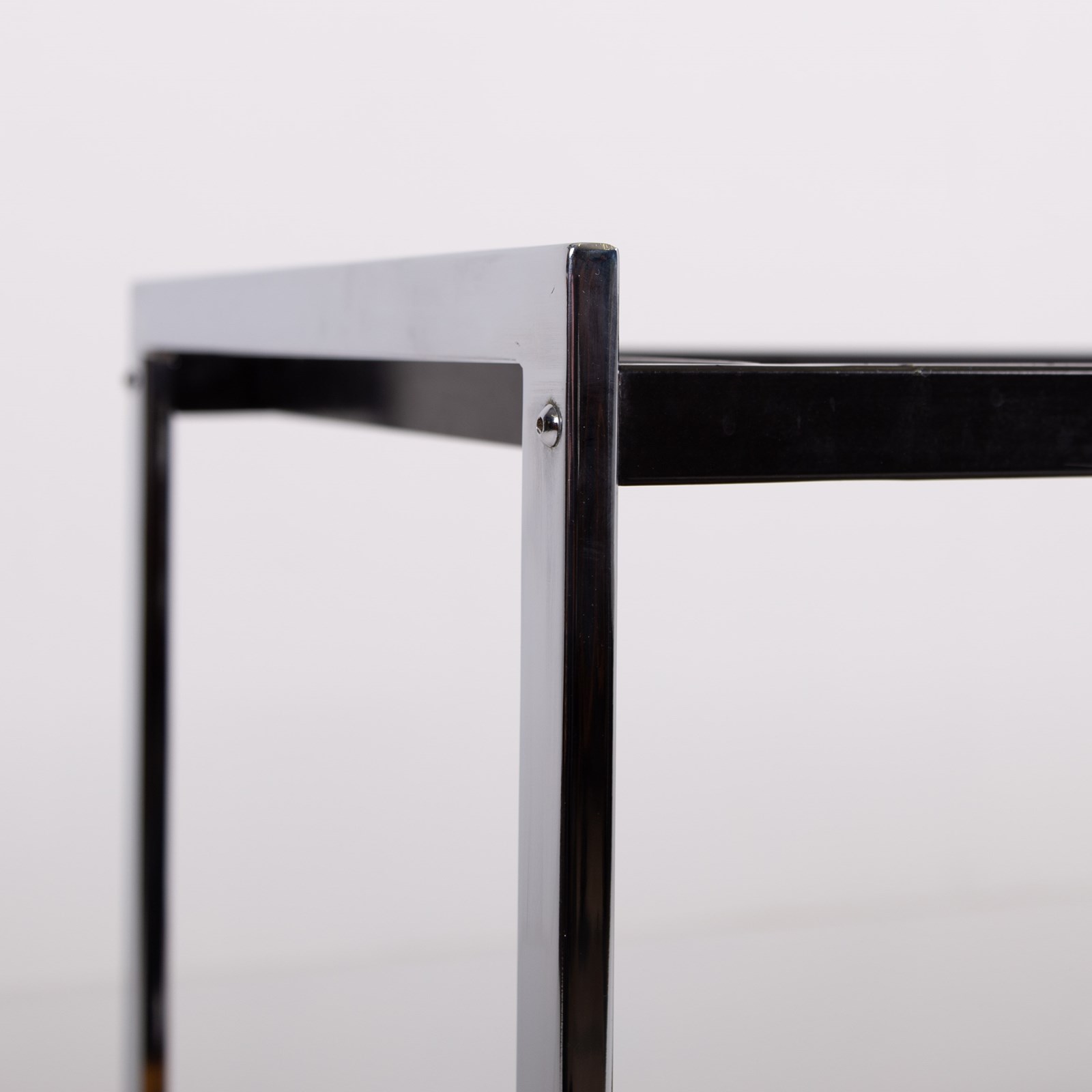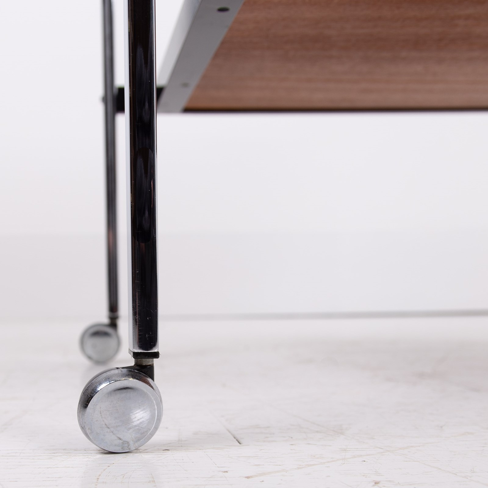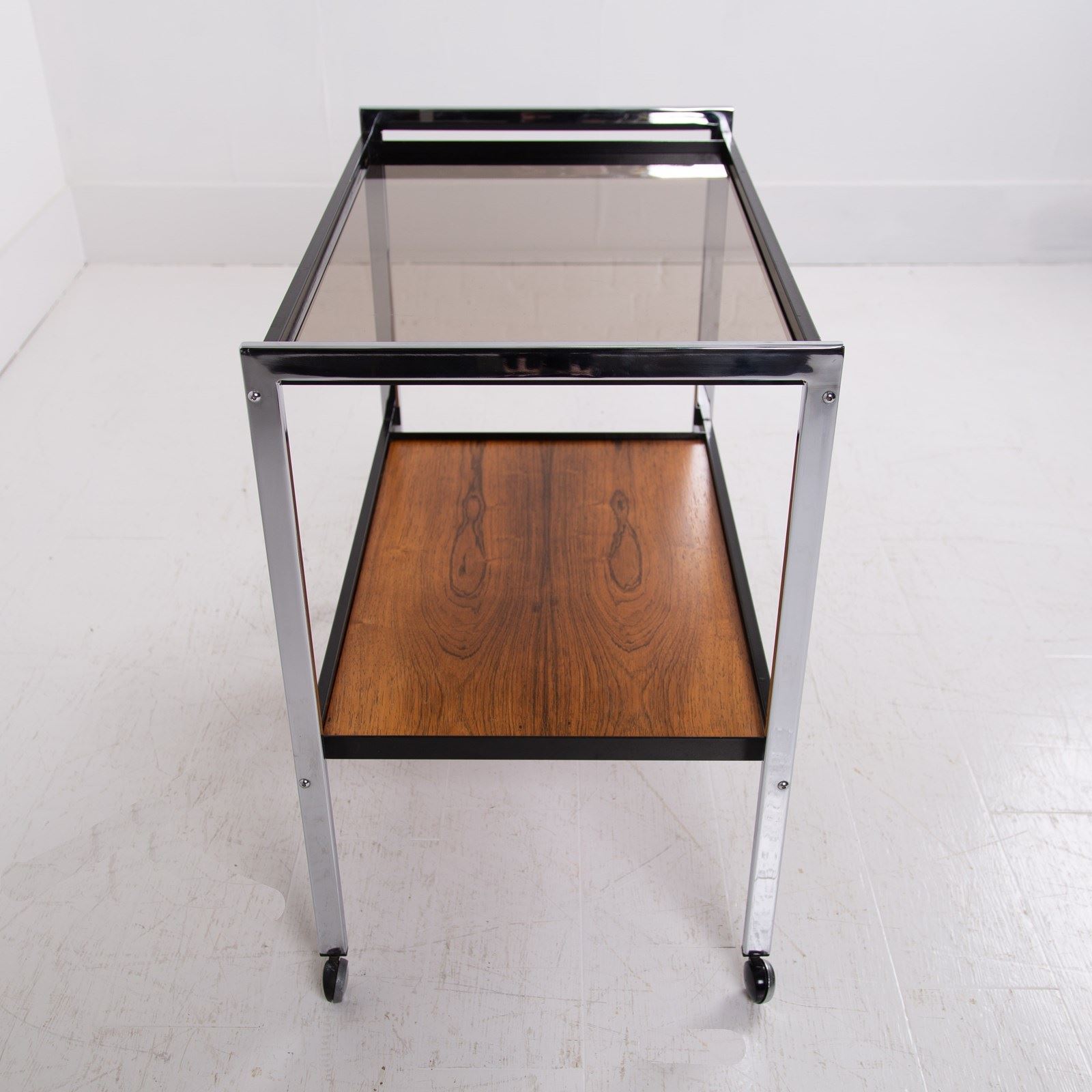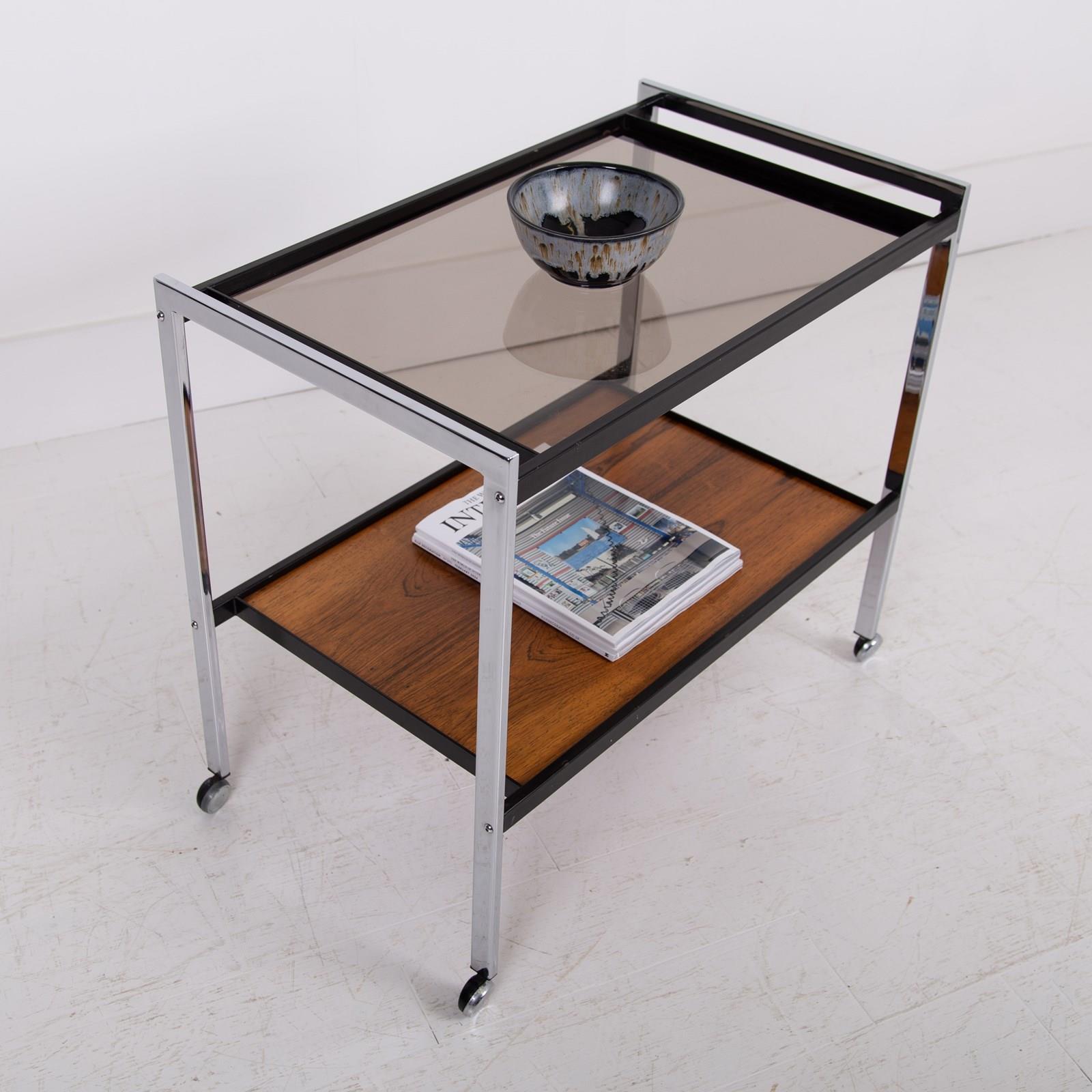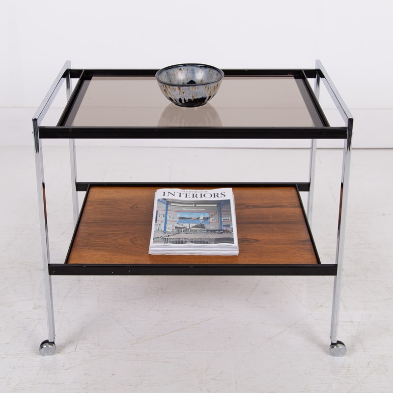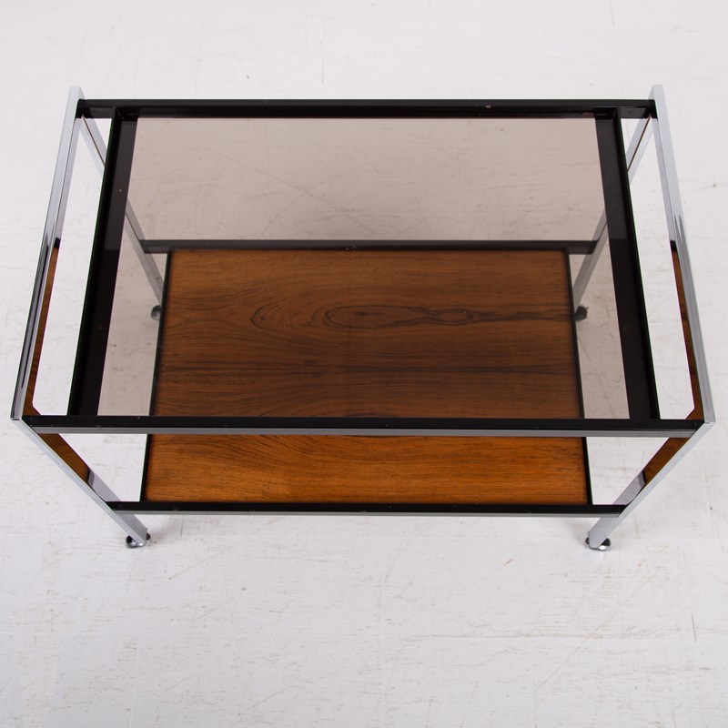 Condition is good with sensible marks to the smoked glass and rosewood shelf but nothing nasty or off putting. The chrome frame is good with no cracks, kinks or repairs with the castors working as they should. Altogether a very well presented original piece.