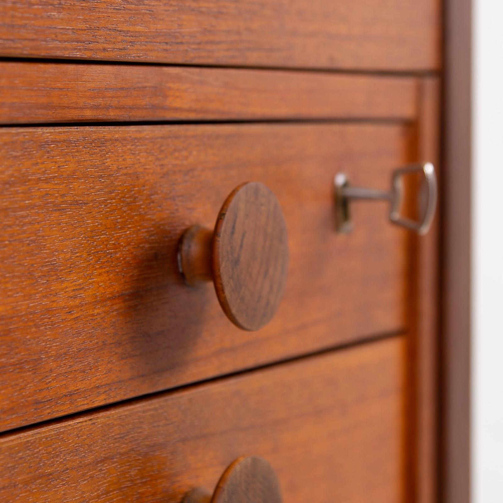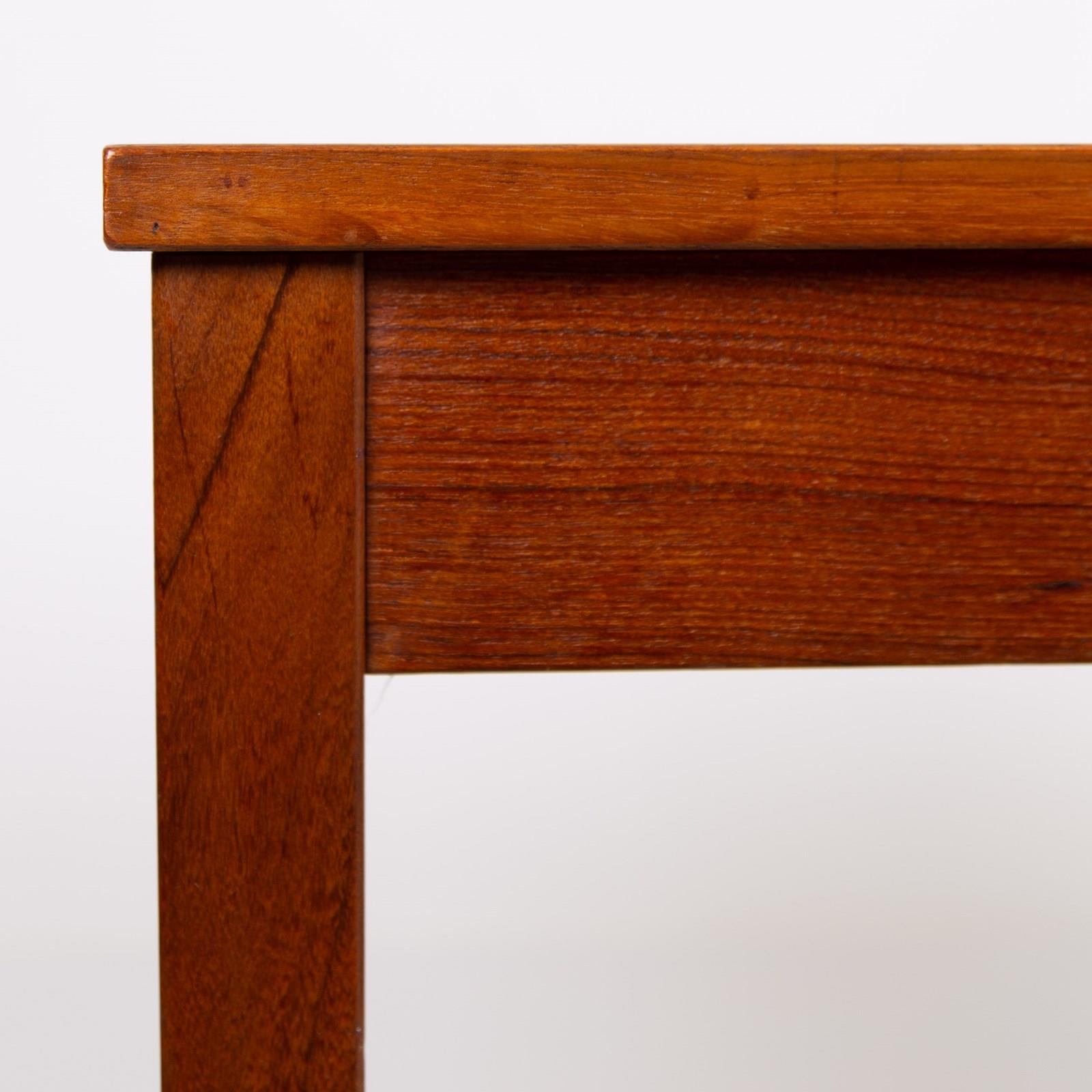 The condition is good with no splits, flakes or cracks to the afromisa or teak veneer. All drawers are running well and have been cleaned inside with just some faint ink marks, as mentioned a working lock and key is present. The top is aged marked but nothing fresh or nasty.