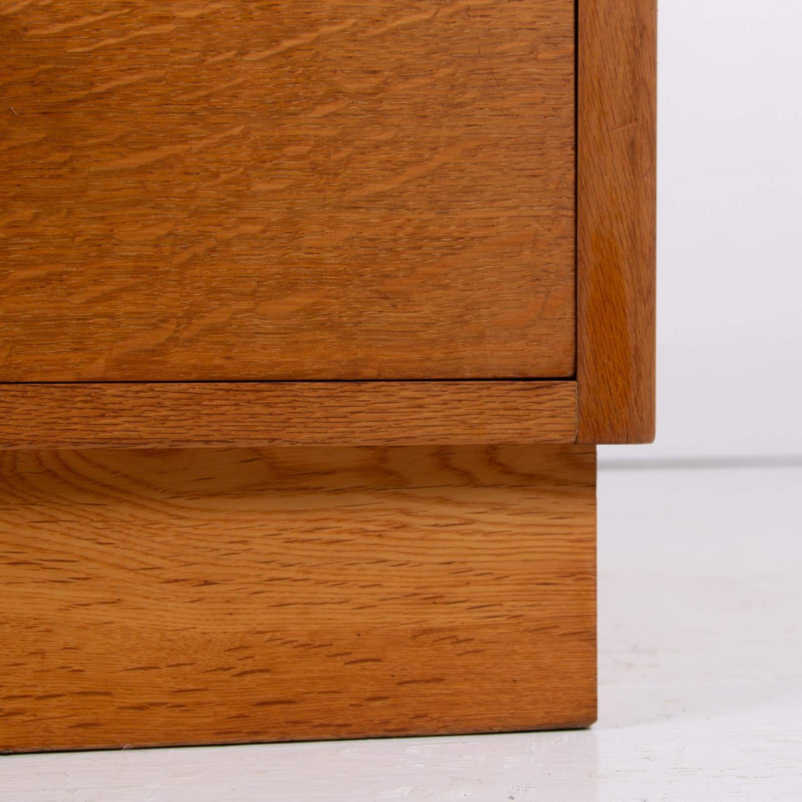 This design has been in favour by the military for a number of years - a flight of 3 deep drawers topped with 2 deep half drawers which works well for storage. This one sits in fine condition after a careful repolish in our workshop. We have the well shaped oak handles in situ and the inverted bottom plinth works well. Expect light day to day marks, nothing nasty.