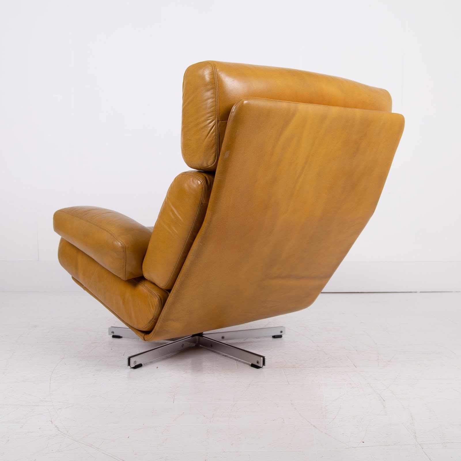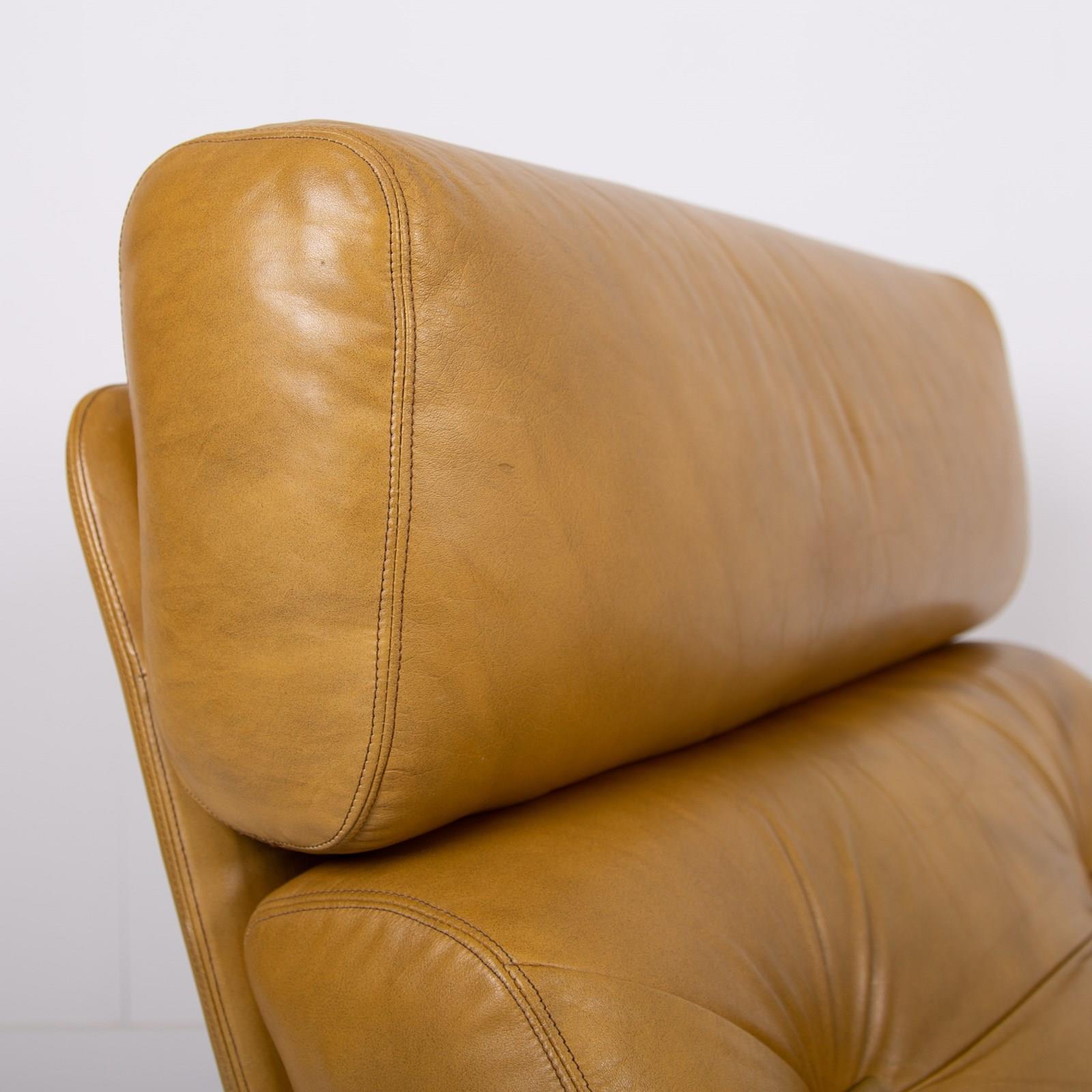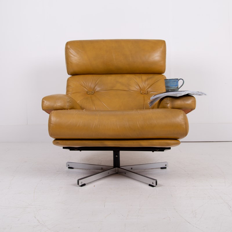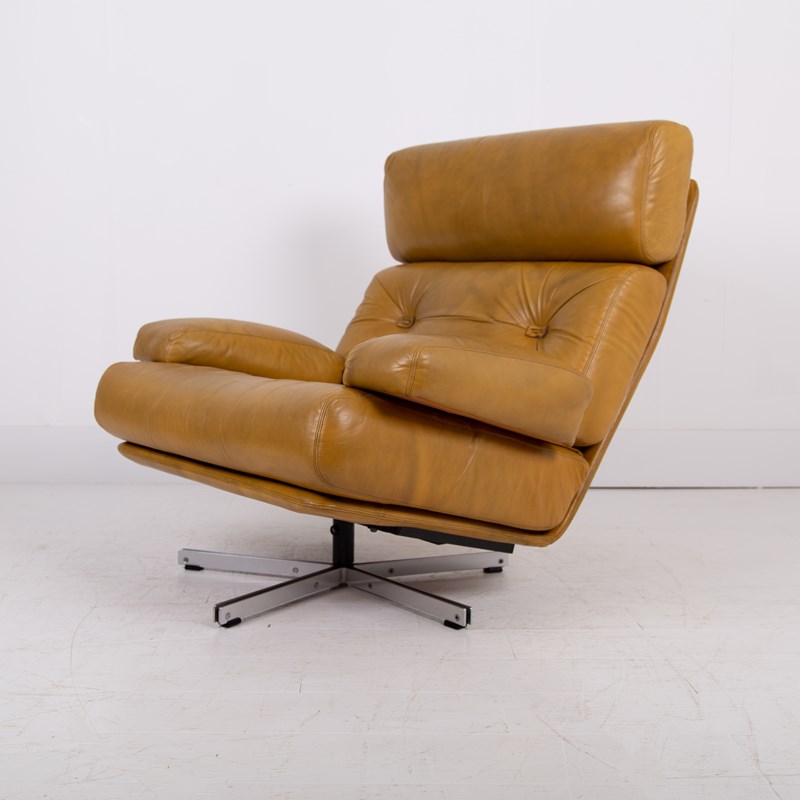 This chair benefits from being carefully used and possessing a cracking profile. The images really display the quality of the craftsmanship and also the quality of the materials used. We are constantly purchasing this type of chair and this one is in a great condition with sensible aged creasing and wear to the deep speckled mustard leather, please note that the leather would have been “antiqued” when originally produced, hence the variation in tones. No rips or tears, the swivel is working fine, no cracks to the base and it smells fine. The chair has been carefully cleaned and nourished with a leather balm to give it a soft natural glow rather than a heavy handed gloss finish.