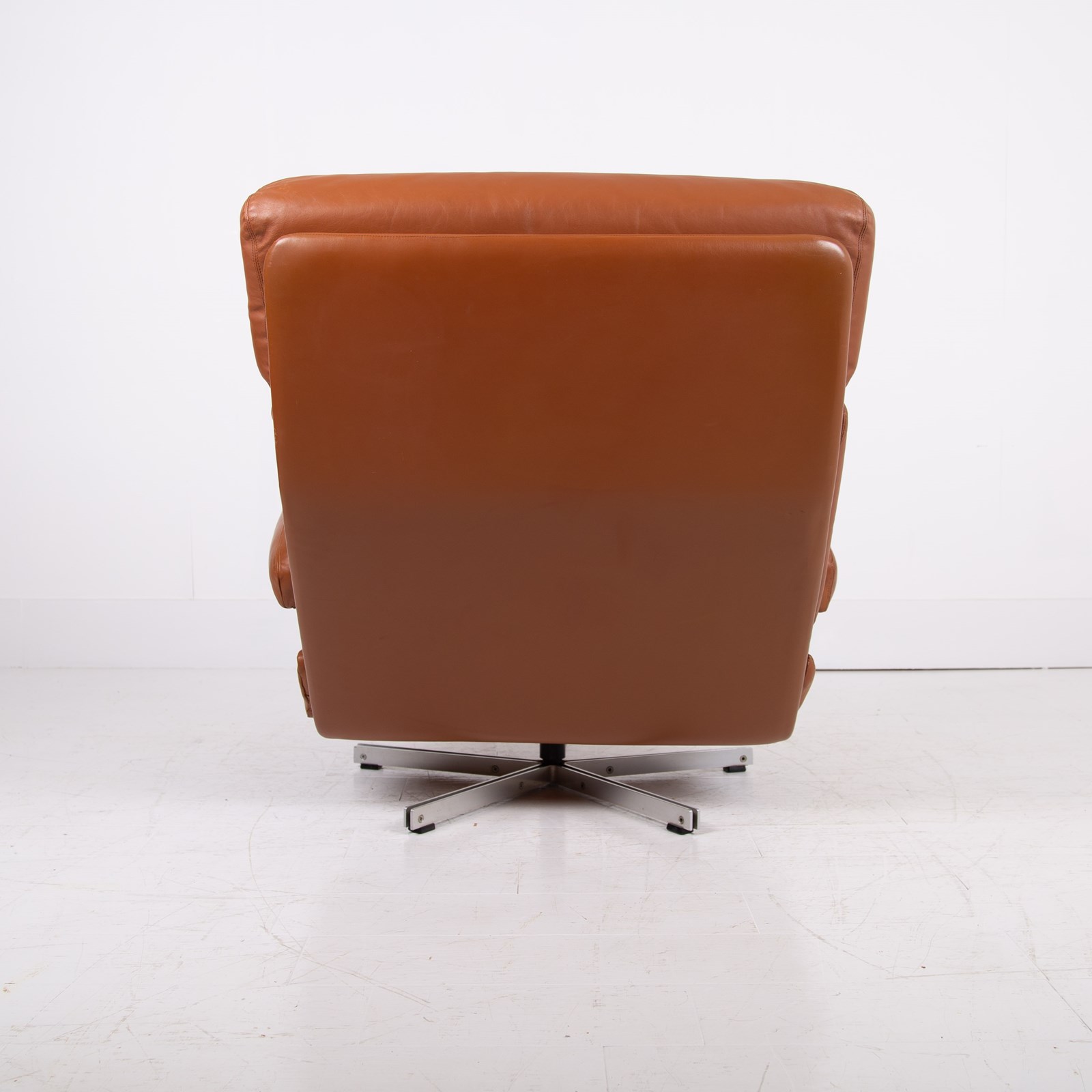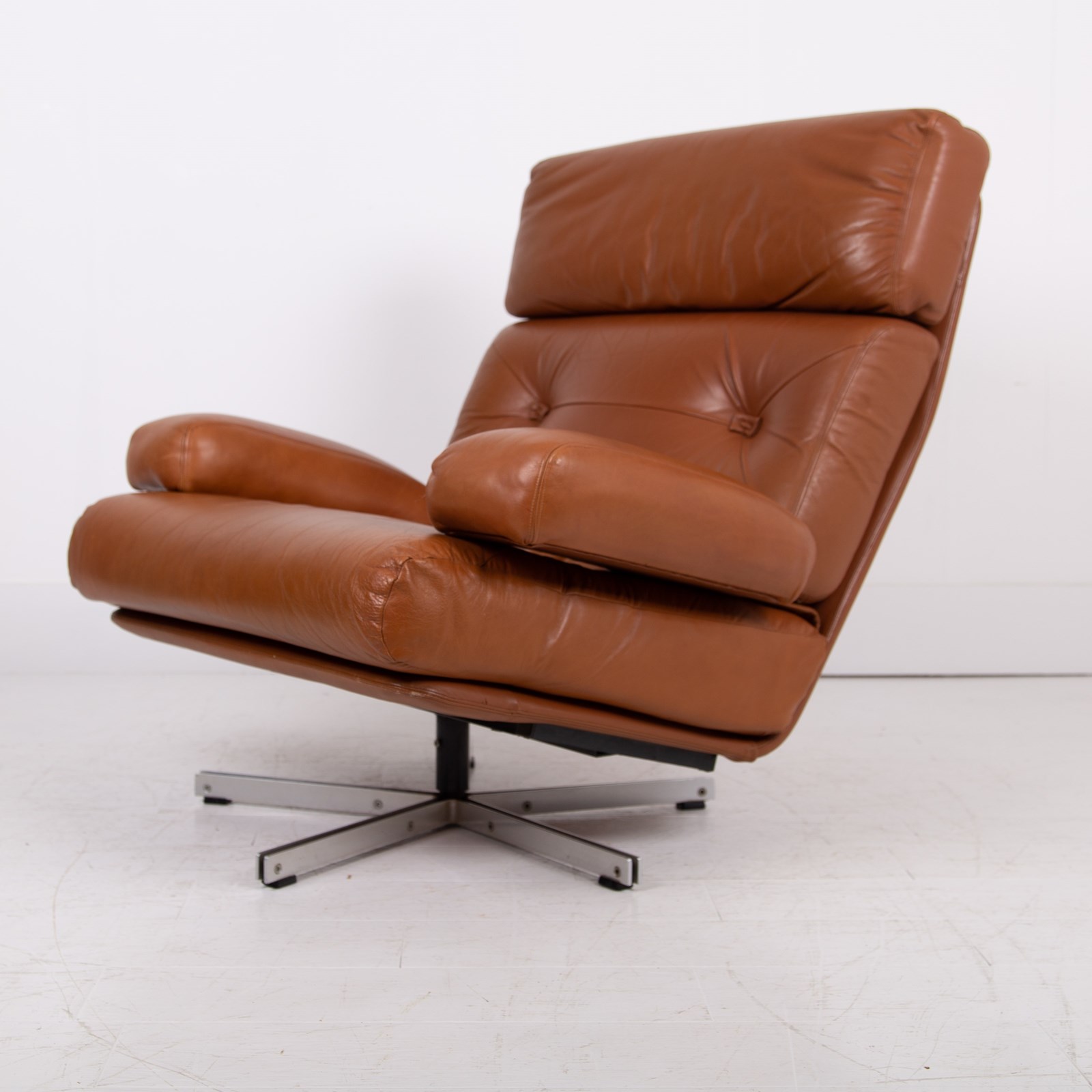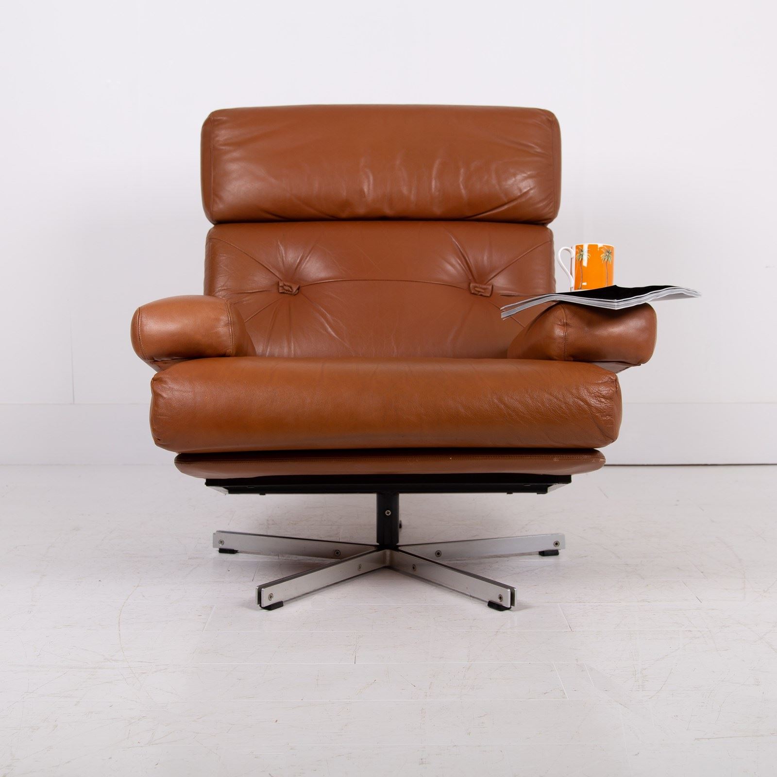 This chair benefits from being carefully used and possessing a cracking profile. The images really display the quality of the craftsmanship and also the quality of the materials used. We are constantly purchasing this type of chair and this one is in a great condition with light sensible aged creasing and wear to the deep speckled mustard leather. No rips or tears, the swivel is working fine, no cracks to the base and it smells fine. The chair has been carefully cleaned and nourished with a leather balm to give it a soft natural glow rather than a heavy handed gloss finish.