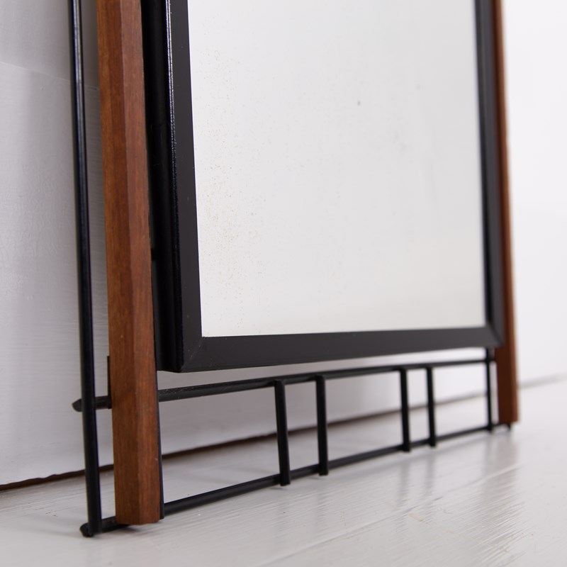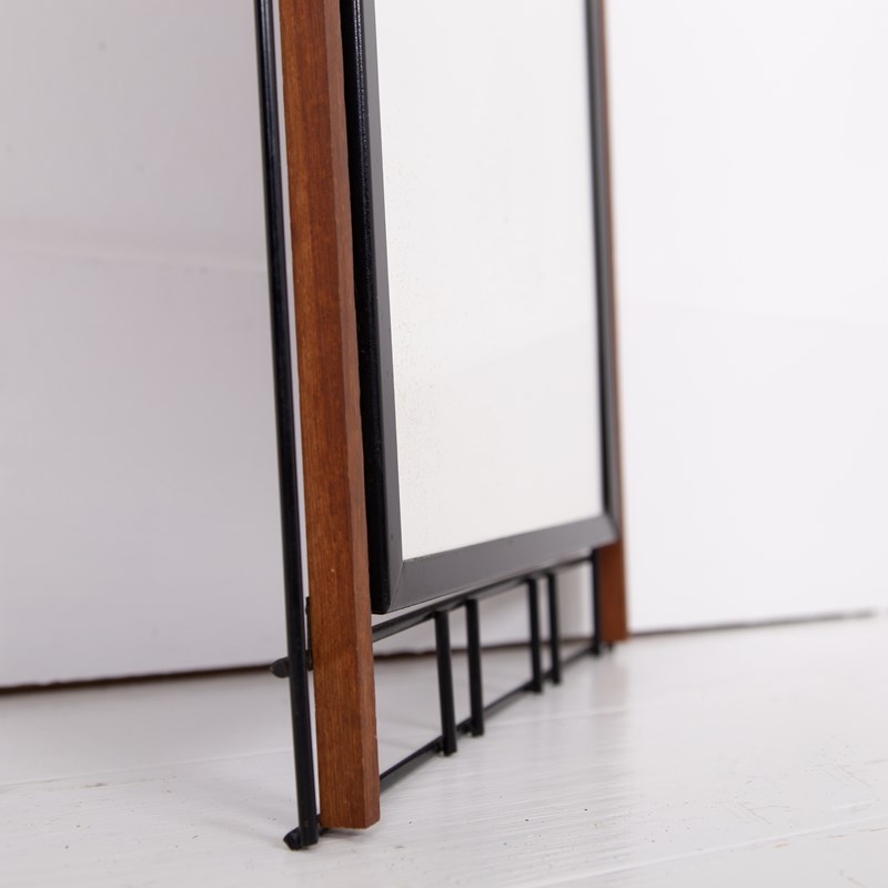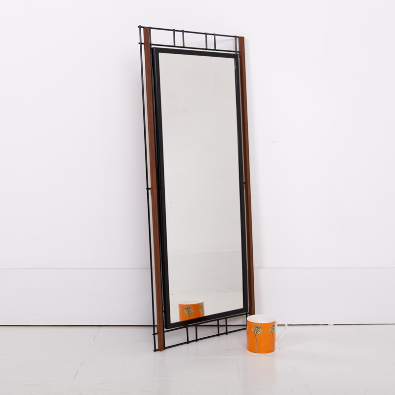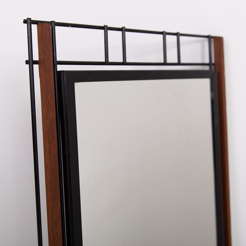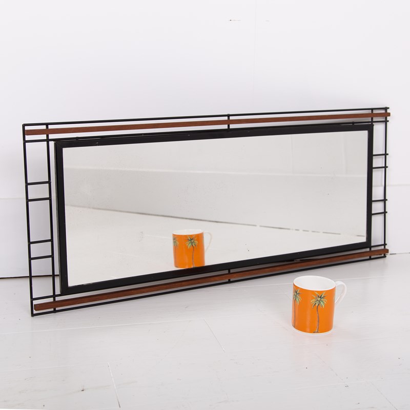 An attractive Mid Century steel mirror with accents in teak. It's a good looking piece of good quality and very much of the era when new materials were being used alongside timber such as teak.