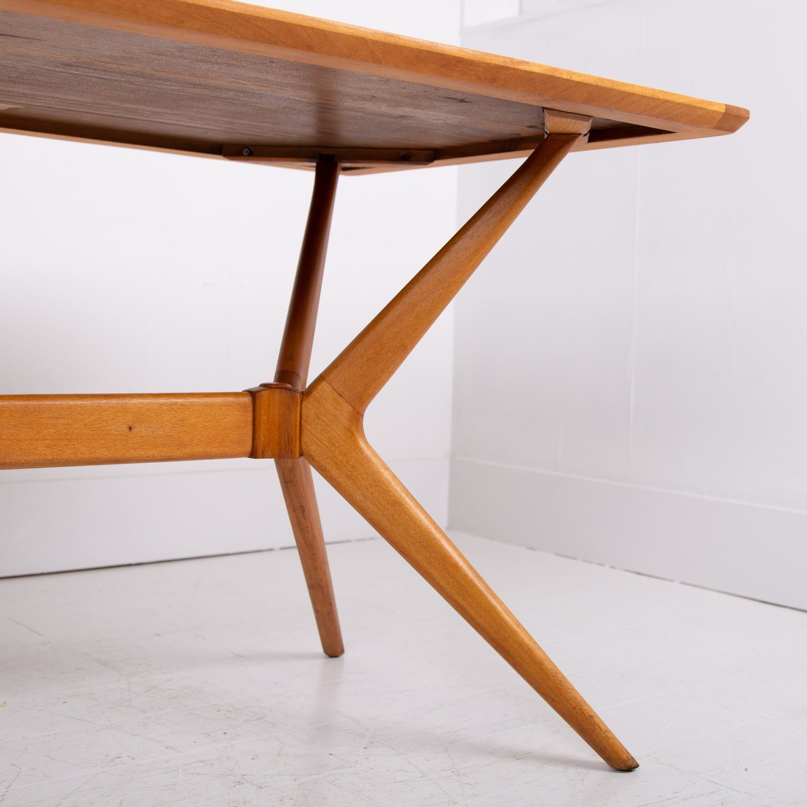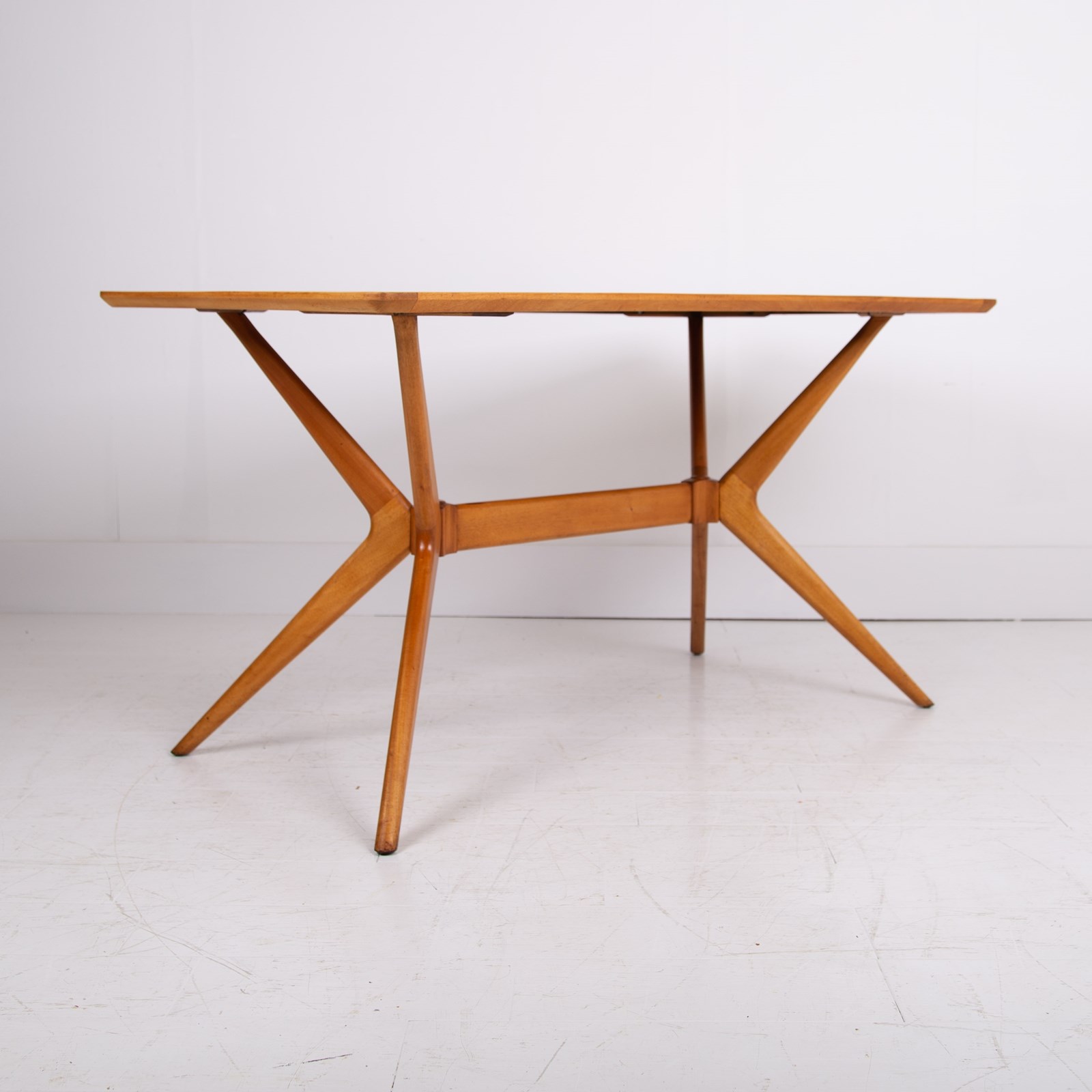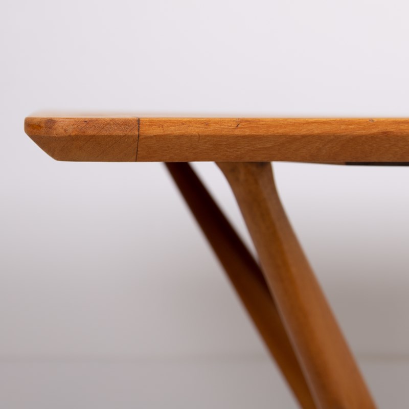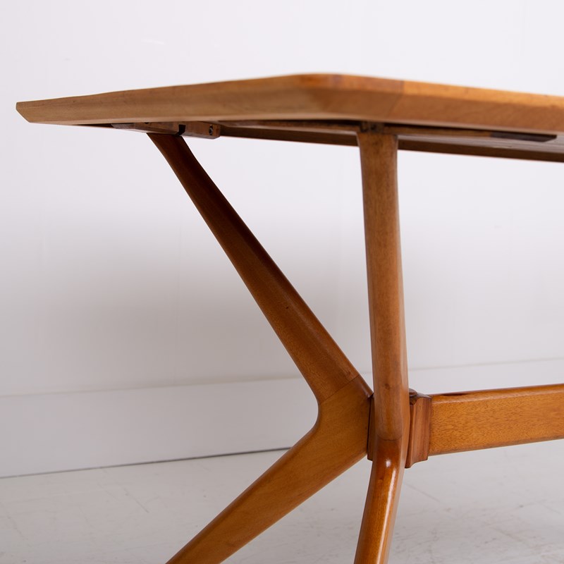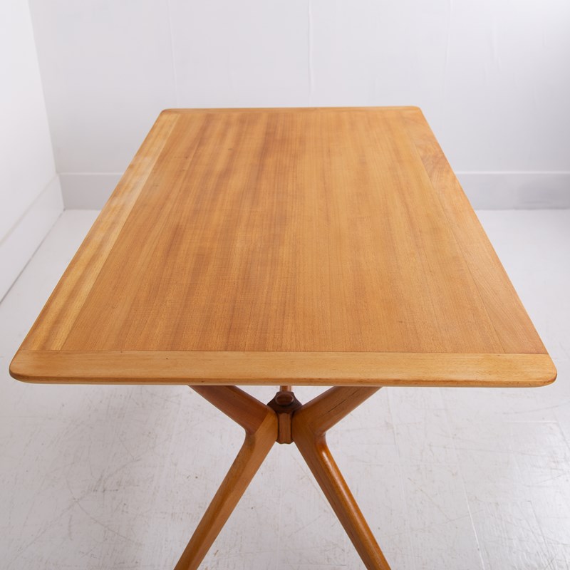 We have a Mid Century G-Plan 'Helicopter' table/desk featuring a teak top with a teak sculptural base. The angled, splayed legs connect through a central stretcher, creating a striking silhouette that exemplifies Mid Century British design.
