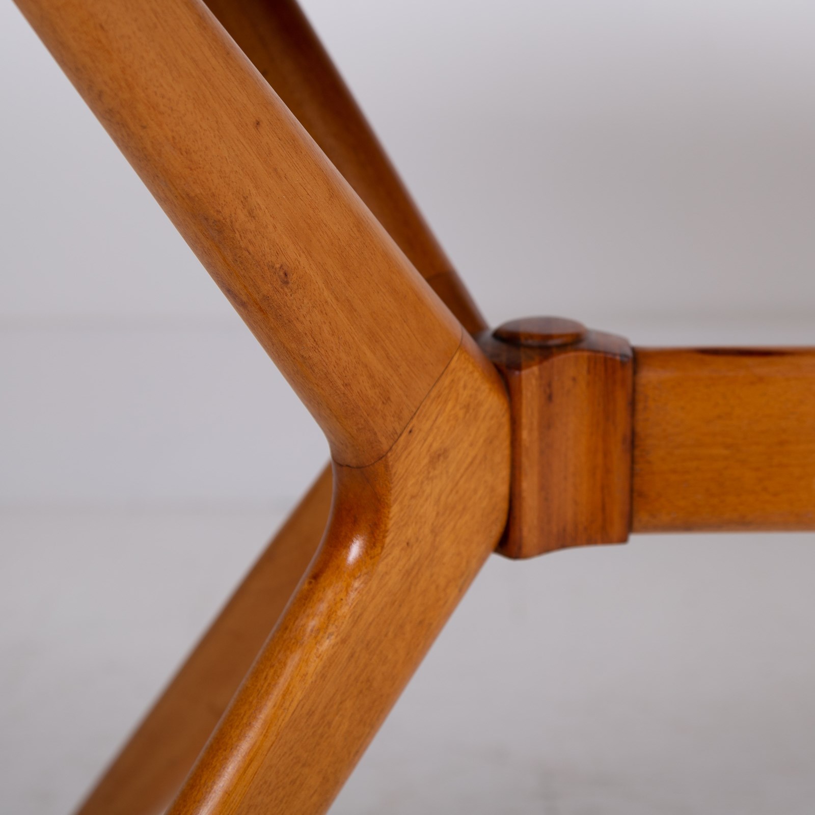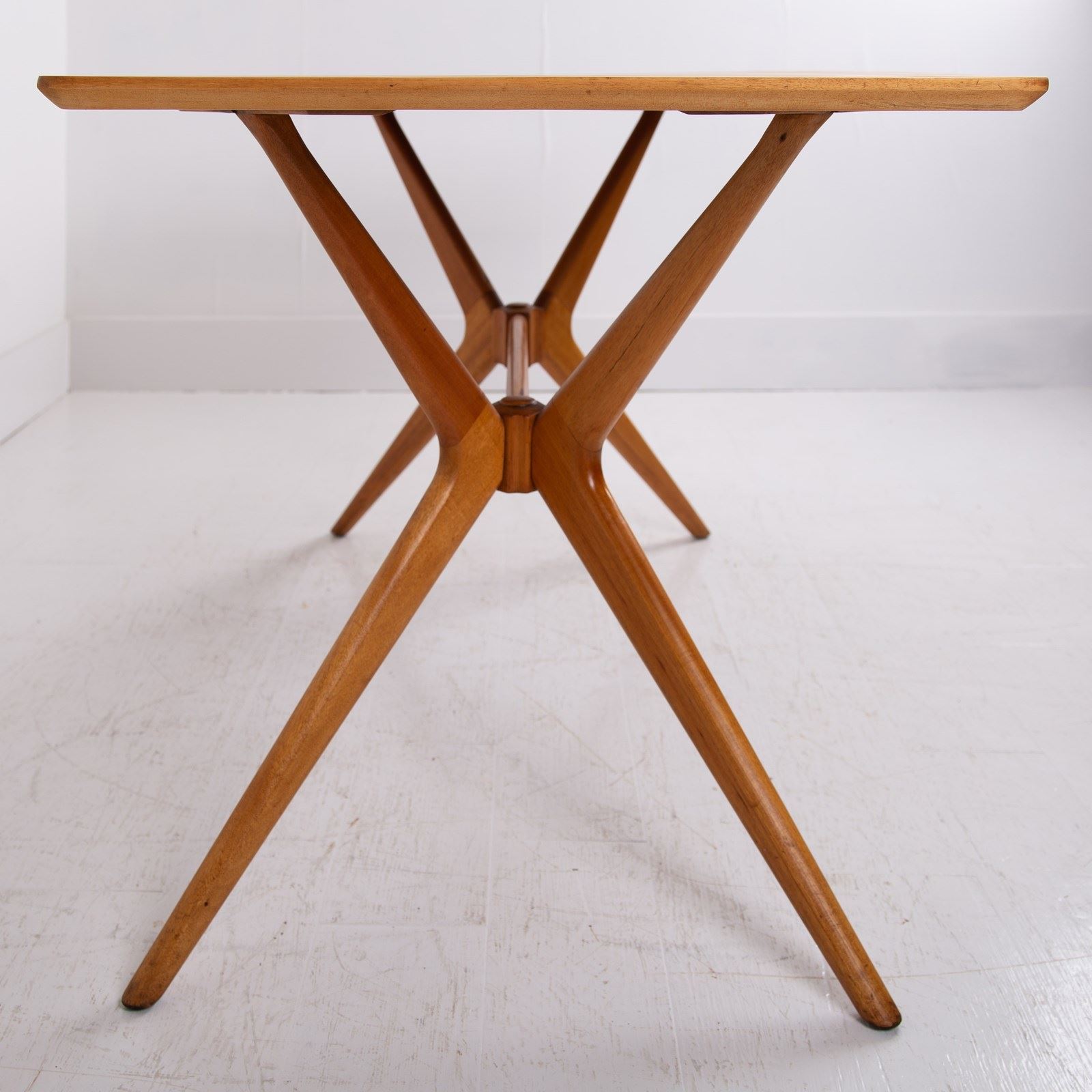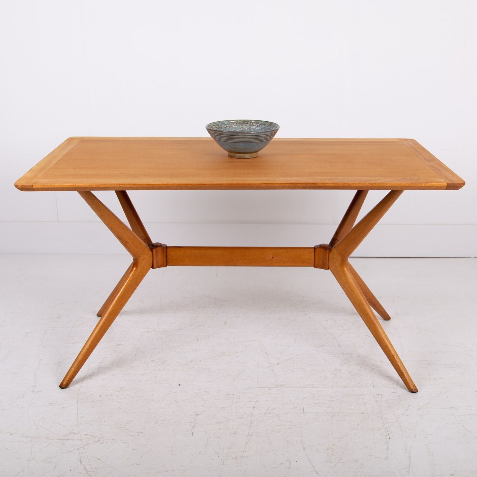 We have a Mid Century G-Plan 'Helicopter' table/desk featuring a teak top with a teak sculptural base. The angled, splayed legs connect through a central stretcher, creating a striking silhouette that exemplifies Mid Century British design.