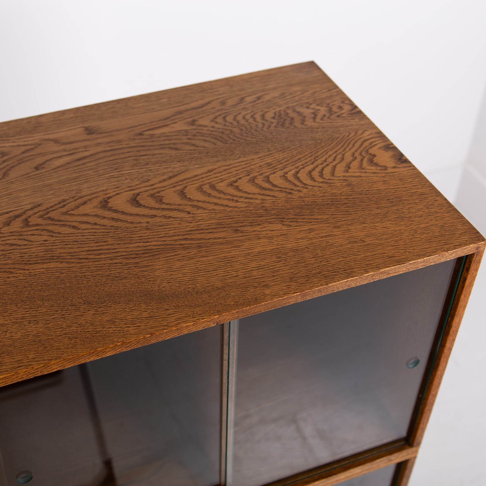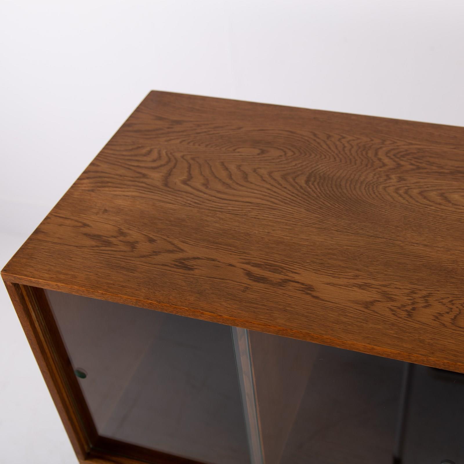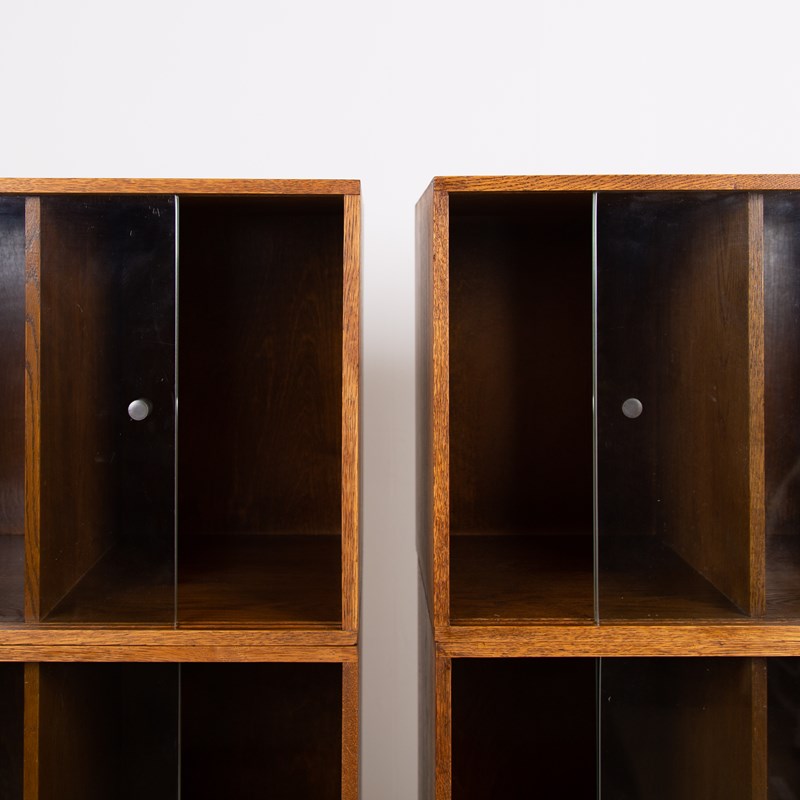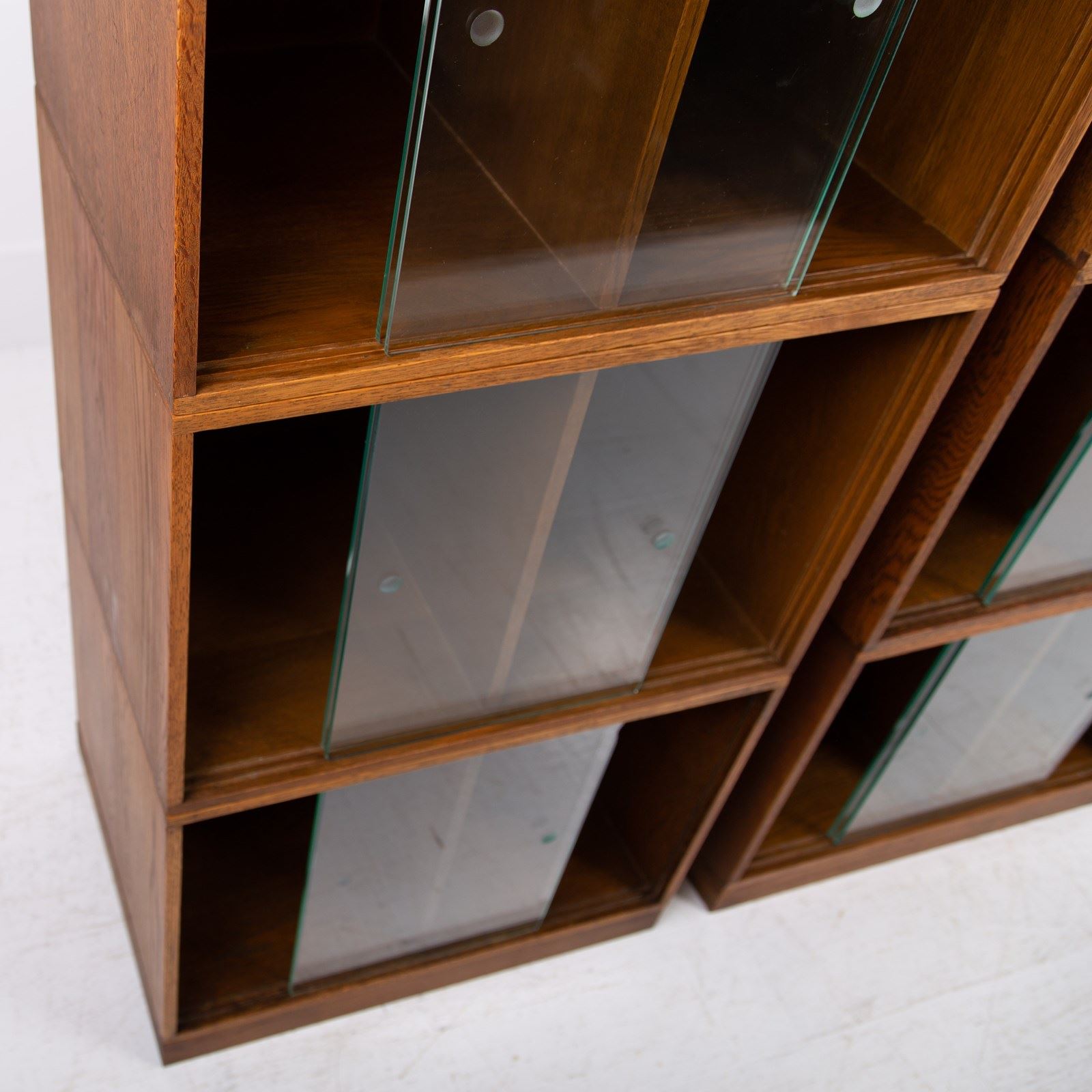 The design is perfect and effortless in looks - we have 3 oak sections, all with two sliding glass doors which will fit records perfectly. The Unix units on this one separate into 3 and a base for easier moving and placing. The cabinet has been cleaned and repolished in our workshop so we have sensible wear to the well toned oak. We have a very small chip to one of the doors which you do not see when closed and a small sliver to the back side of one of the sections again historic and not particularly noticeable. Both cabinets are the same in configuration and scale.