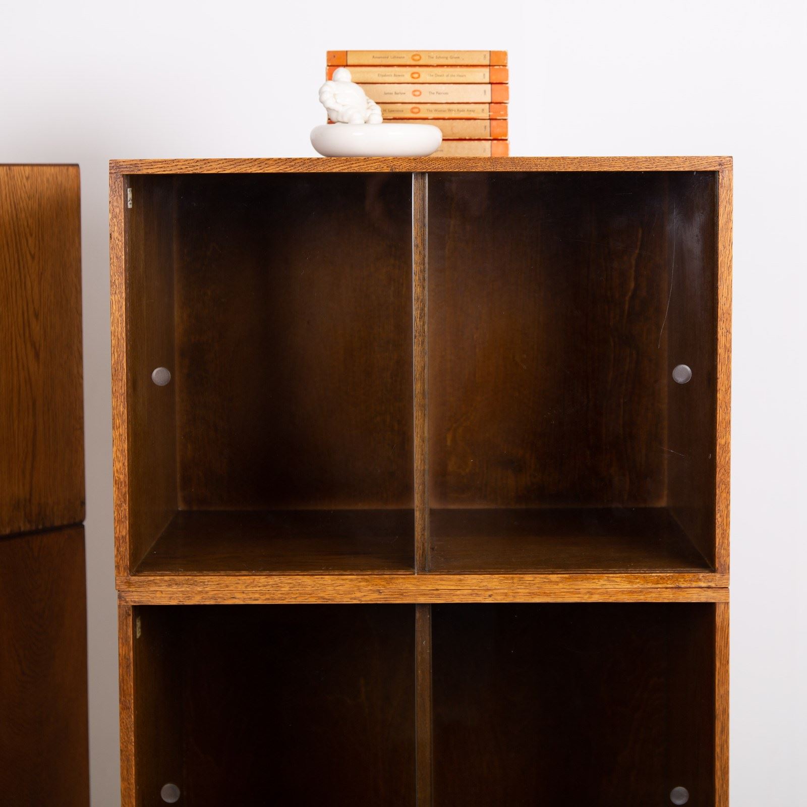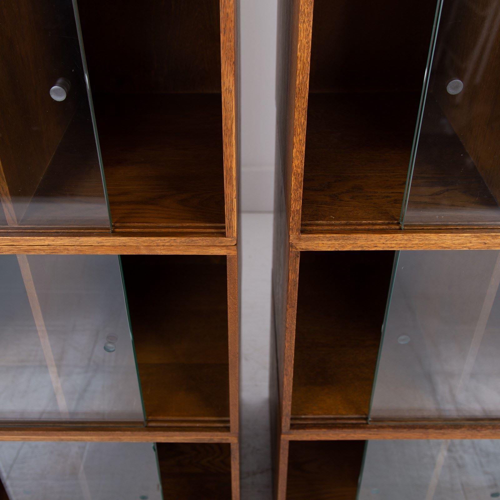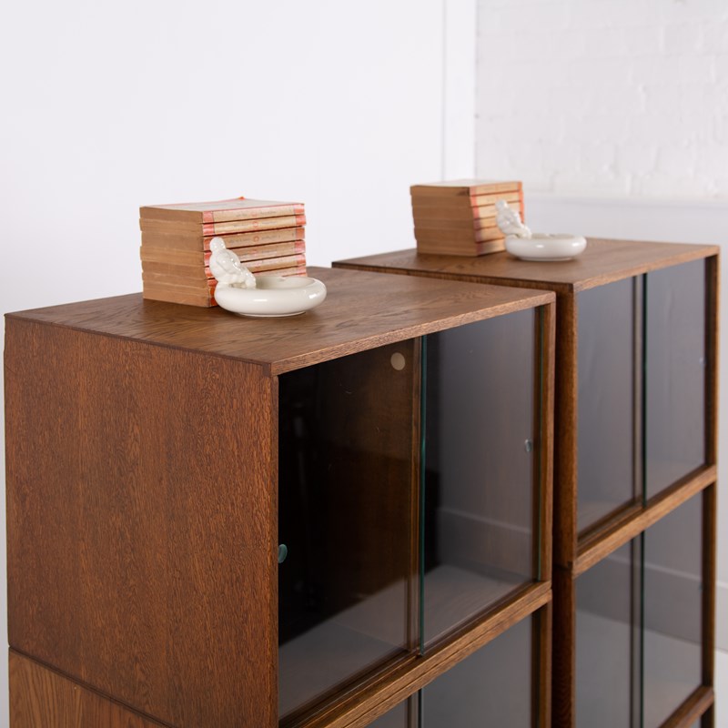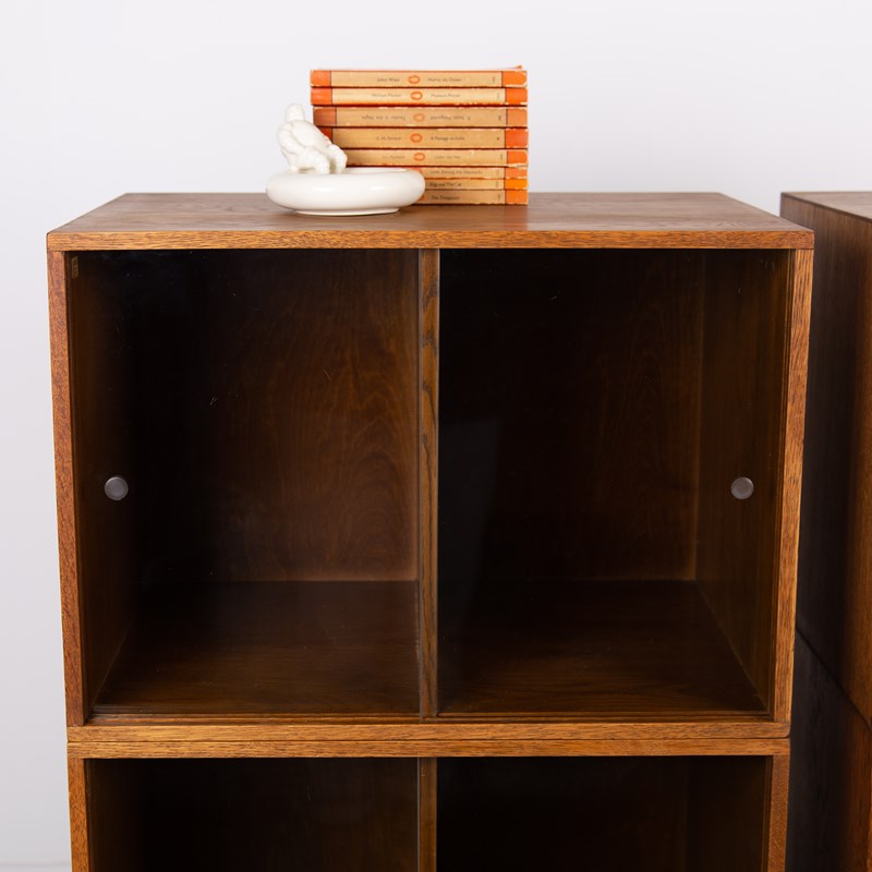 The design is perfect and effortless in looks - we have 3 oak sections, all with two sliding glass doors which will fit records perfectly. The Unix units on this one separate into 3 and a base for easier moving and placing. The cabinet has been cleaned and repolished in our workshop so we have sensible wear to the well toned oak. We have a very small chip to one of the doors which you do not see when closed and a small sliver to the back side of one of the sections again historic and not particularly noticeable. Both cabinets are the same in configuration and scale.
