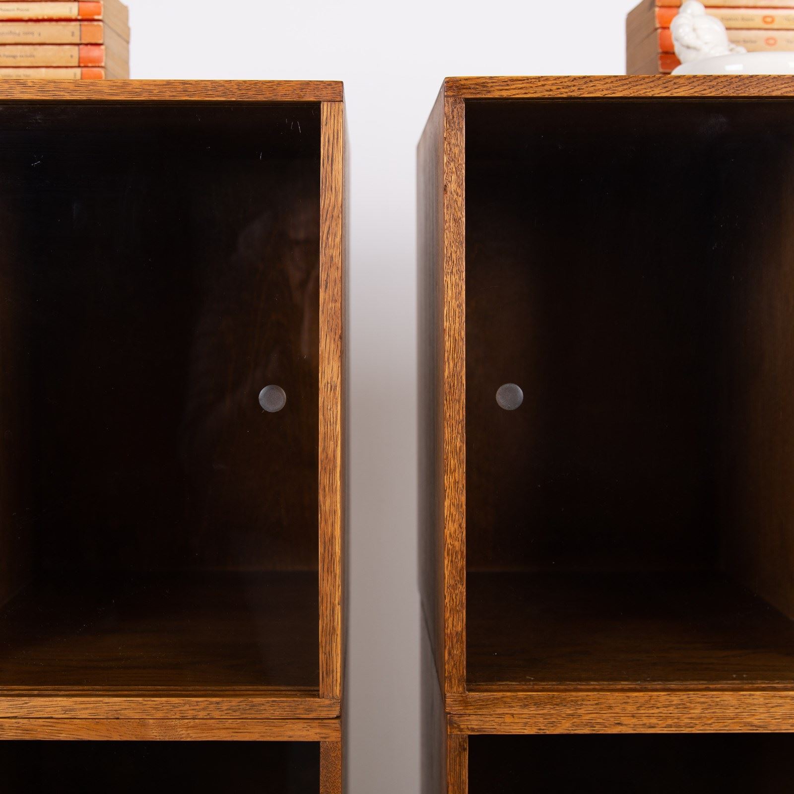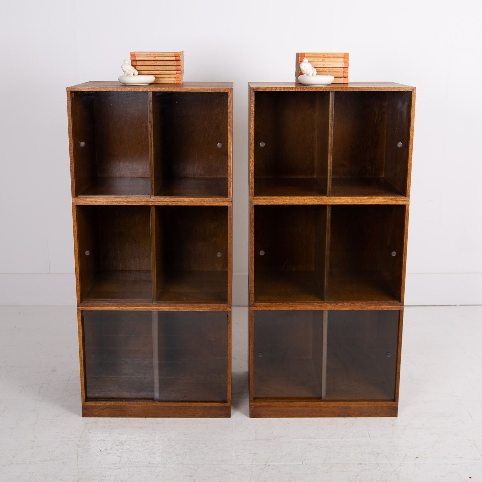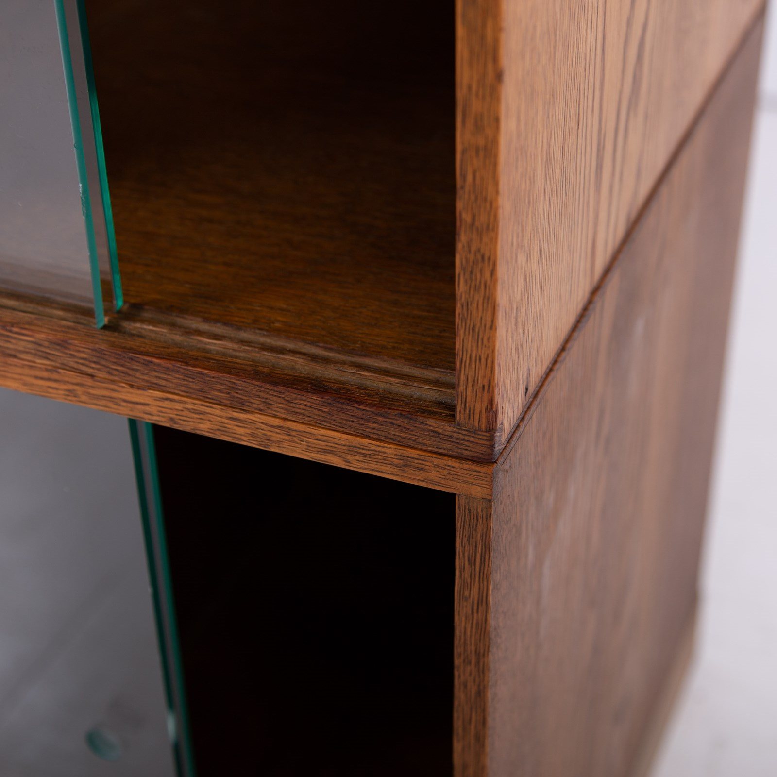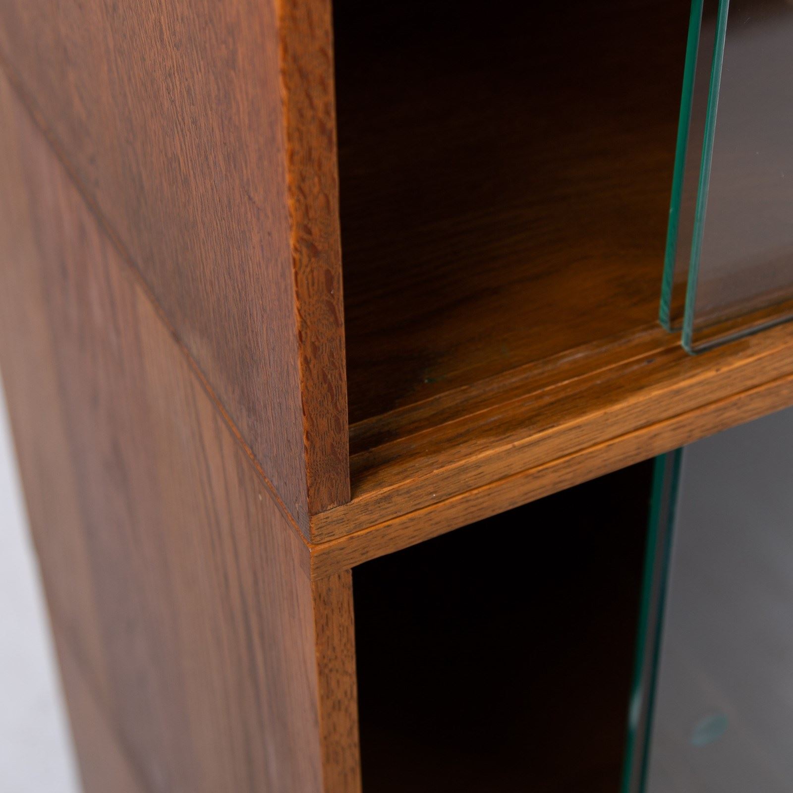 The design is perfect and effortless in looks - we have 3 oak sections, all with two sliding glass doors which will fit records perfectly. The Unix units on this one separate into 3 and a base for easier moving and placing. The cabinet has been cleaned and repolished in our workshop so we have sensible wear to the well toned oak. We have a very small chip to one of the doors which you do not see when closed and a small sliver to the back side of one of the sections again historic and not particularly noticeable. Both cabinets are the same in configuration and scale.
