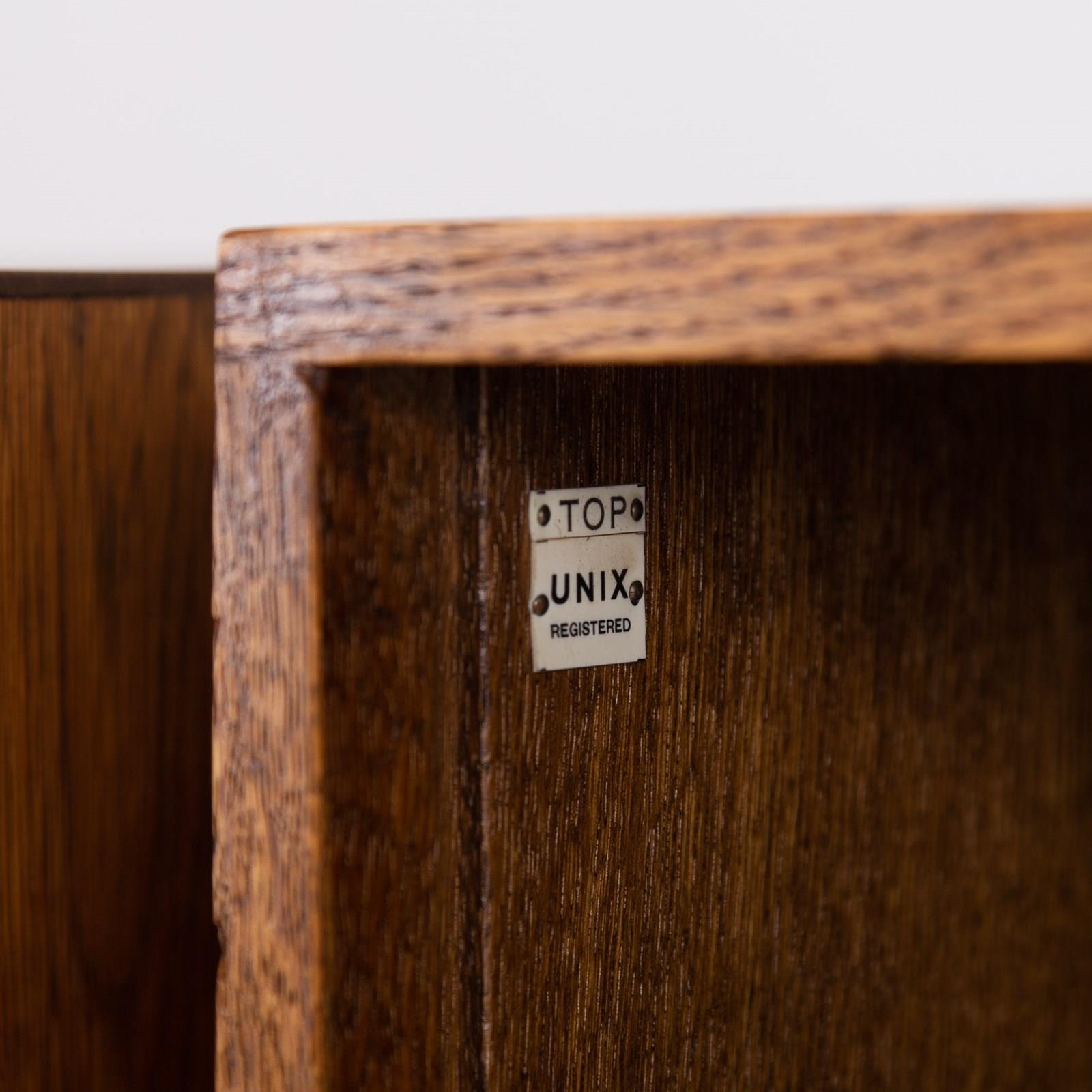 We have a Unix oak modular cabinet retailed by the Phoenix Gallery of St. Martins Lane, Charing Cross, London. Unix were fortunate to be chosen for The Festival of Britain South Bank Exhibition. The little ivorine Unix label is inside the top cabinet with the Phoenix Gallery paper delivery label attached to the rear of the base.