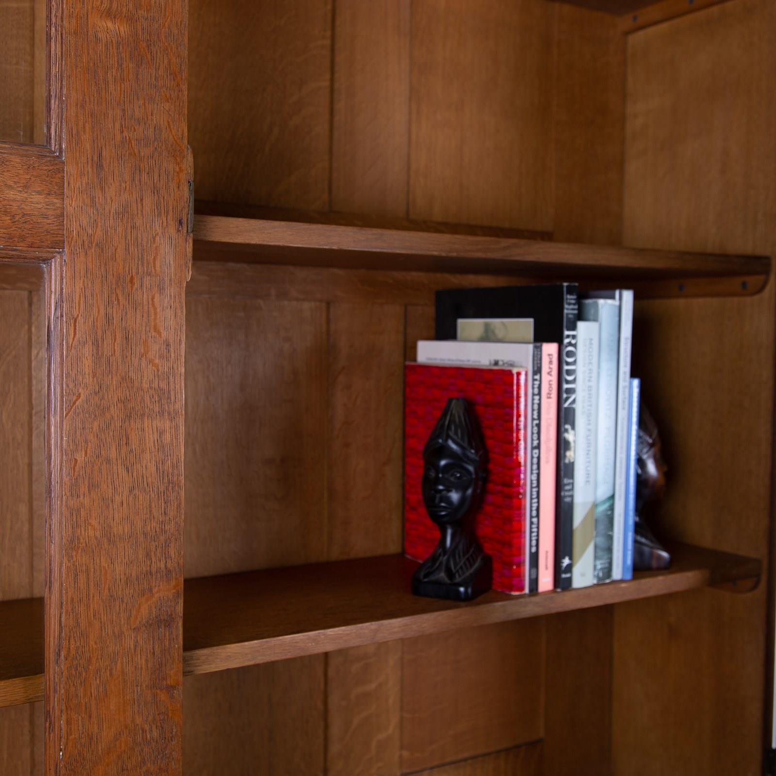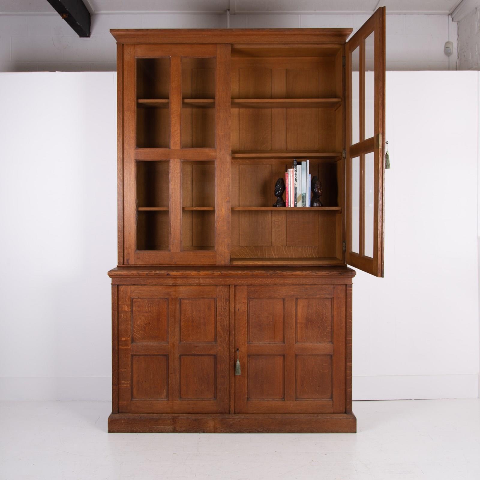A superb quality solid English oak Arts & Crafts bookcase from a school library in the Home Counties. He is a tall chap and sits very handsomely in a lovely tone of timber and is an effortless design compared to some taking its influence from the Arts & Crafts era with a sense of real craftsmanship in its construction - true joints, balanced use of timber and good hardware.