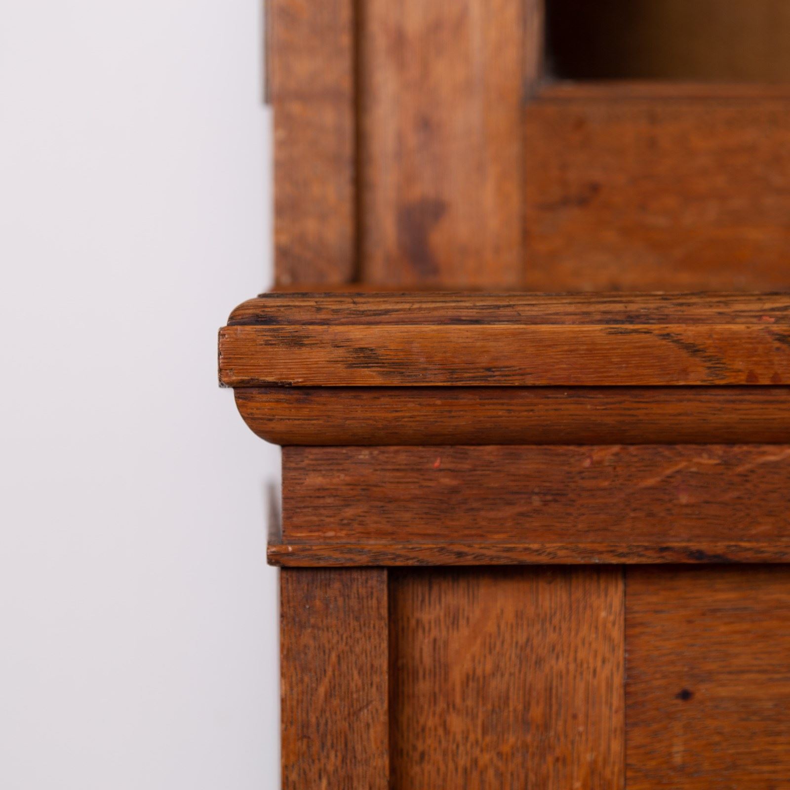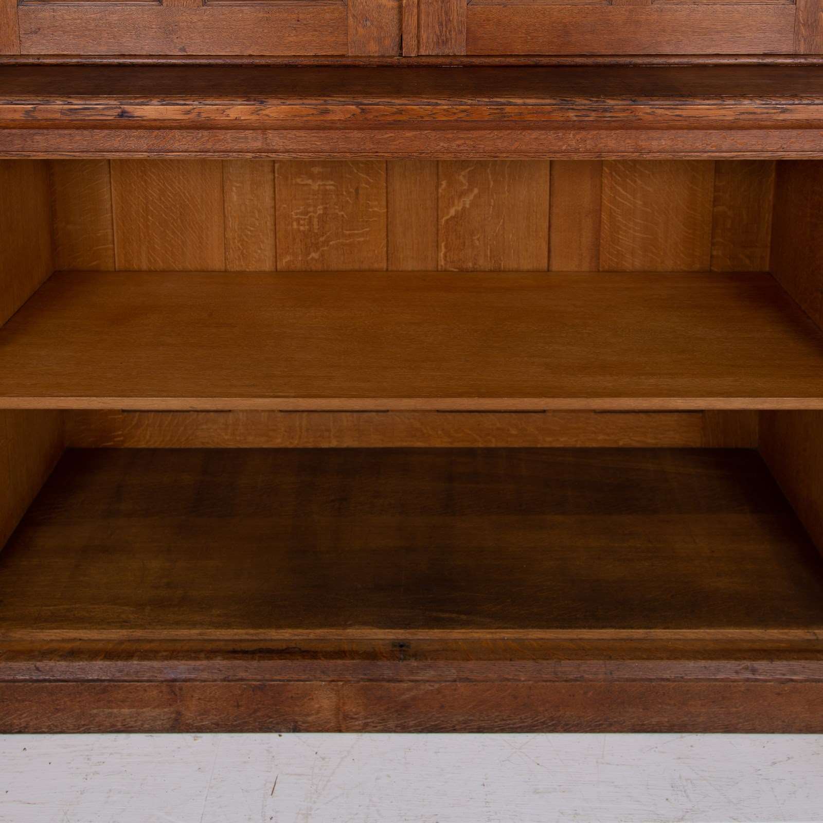 The piece incorporates a pair of panelled oak cupboard doors at the lower level which possesses a solid oak removable shelf; these are topped with a pair of oak framed glazed doors which reveal a flight of 3 solid oak shelves. We have a deep plinth to the bottom and the top has a deep decorative moulding which is all complete. The piece makes use of some quality English oak and the back is panelled. We have working locks and keys to the top and base. In all a very nice piece of furniture. Please note the bookcase does split into 2 and will be delivered as such, it's a solid and heavy piece. Please expect sensible historic wear.