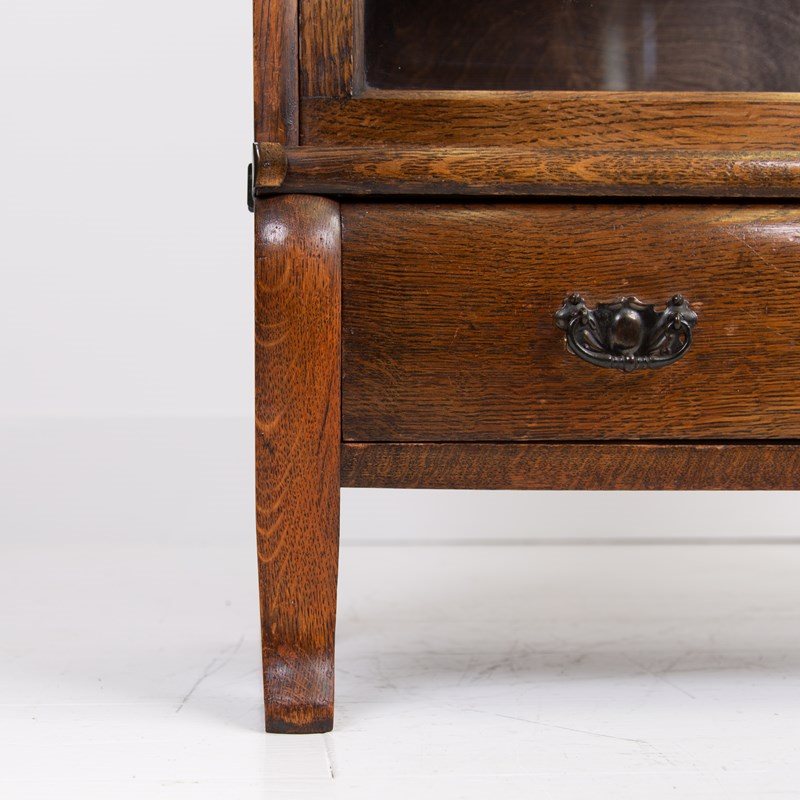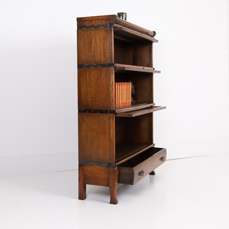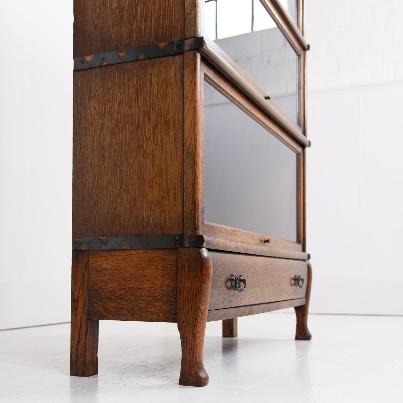 A good looking Globe Wernicke oak bookcase with the addition of a bottom drawer and perching off the floor on attractive little legs. We have makers transfer stamp to the inside, this one being a lesser seen model and type.